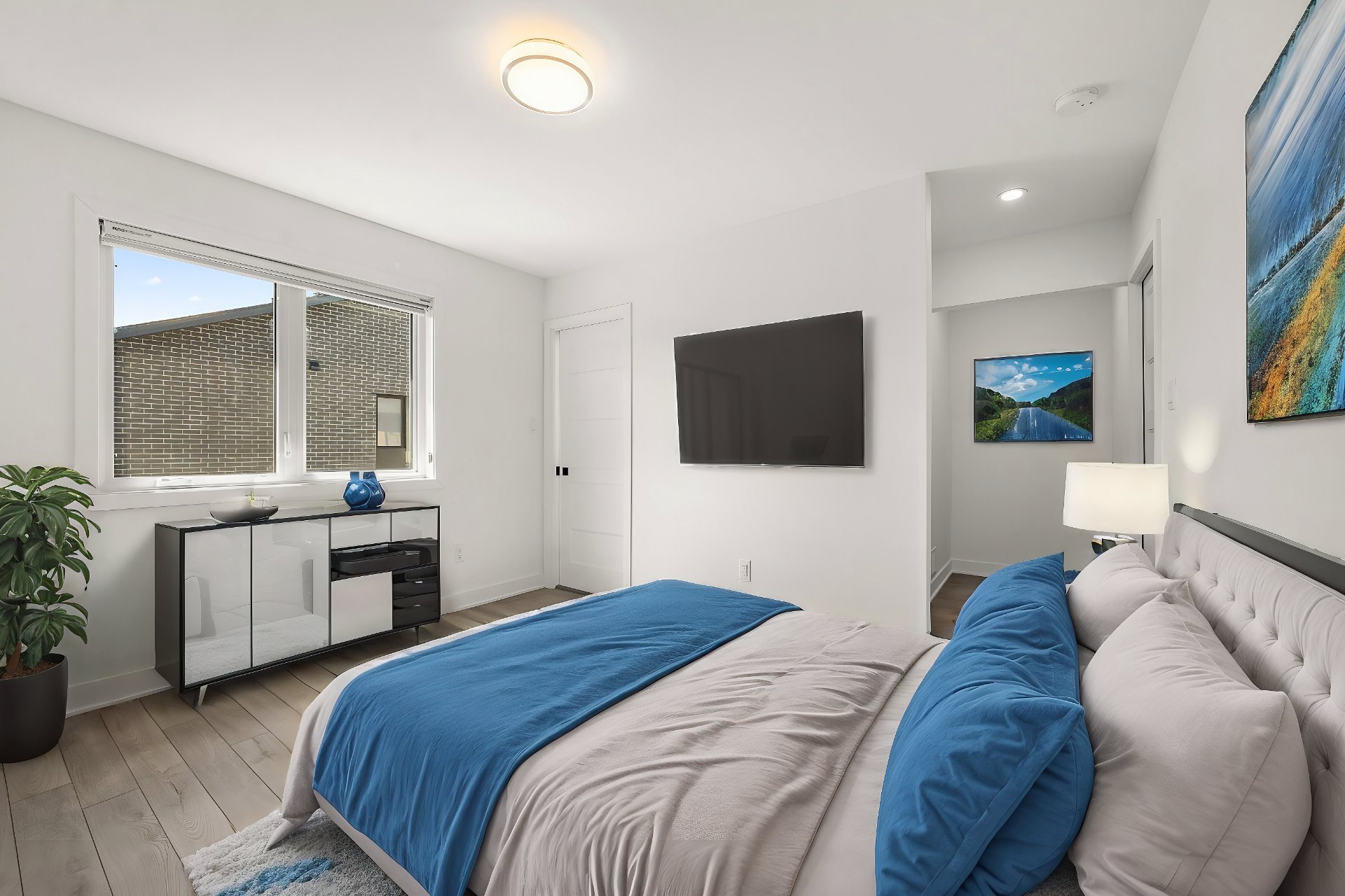 Welcome to this stunning 2021 corner-unit townhouse condo with nearly 2,000 sq. ft. across three spacious floors. Filled with natural light, this home offers a private ground-floor entrance, an open living space, a cozy living room, a dining area, and a modern kitchen with quartz countertops and a central island. The two generous bedrooms each have a full bathroom, and the primary suite features a massive walk-in closet. Enjoy the large balcony, in-ground saltwater pool, and nearby park with a water play area. Quick occupancy available!