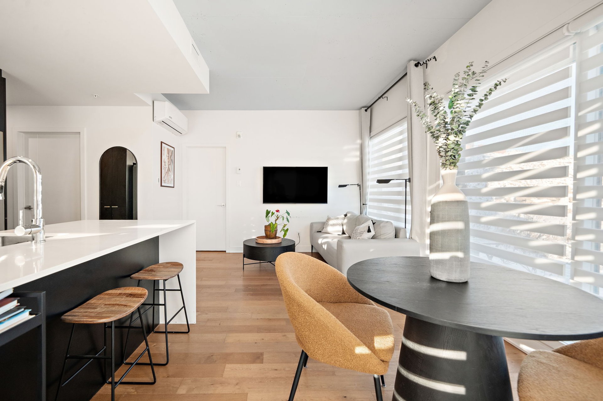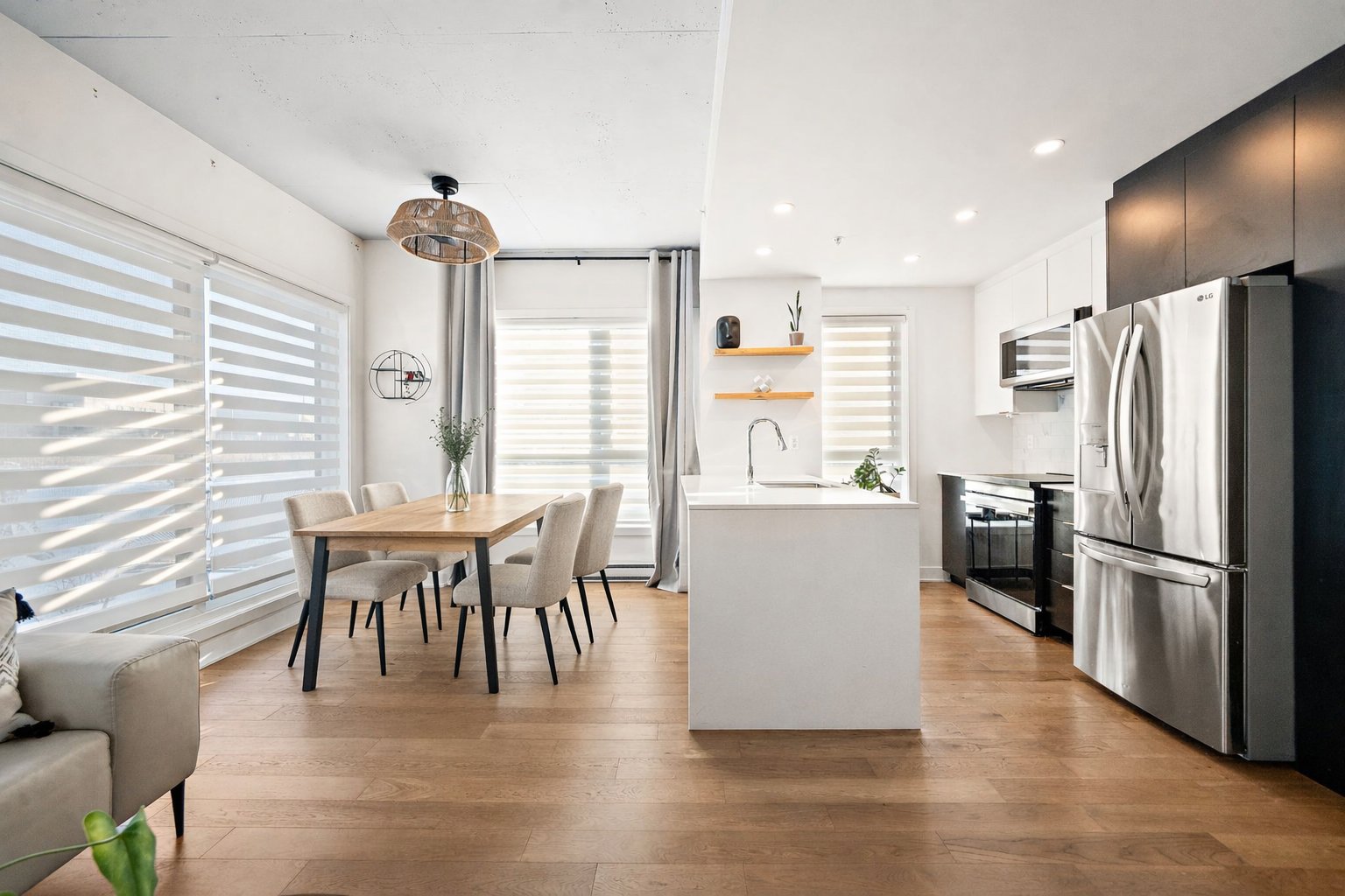 The open-concept layout creates a harmonious environment where the living room, dining area, and kitchen flow naturally together. The elegant and functional kitchen is equipped with quality materials, perfect for cooking or entertaining, while the wood floors add warmth and character throughout.