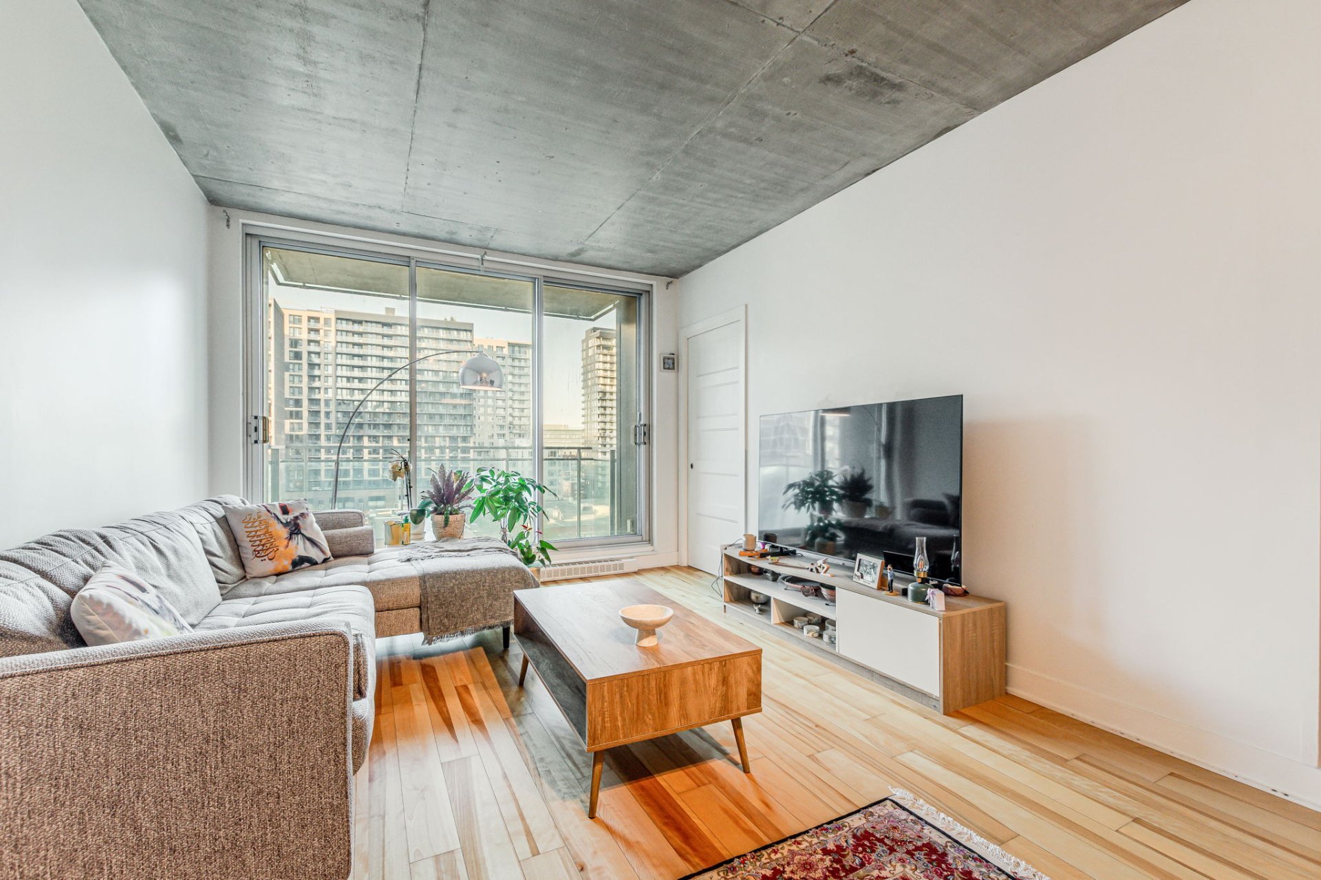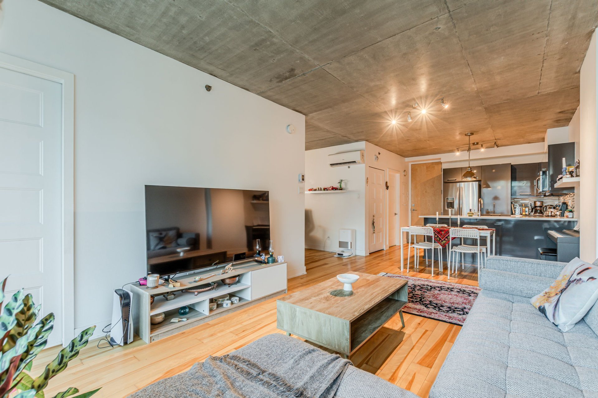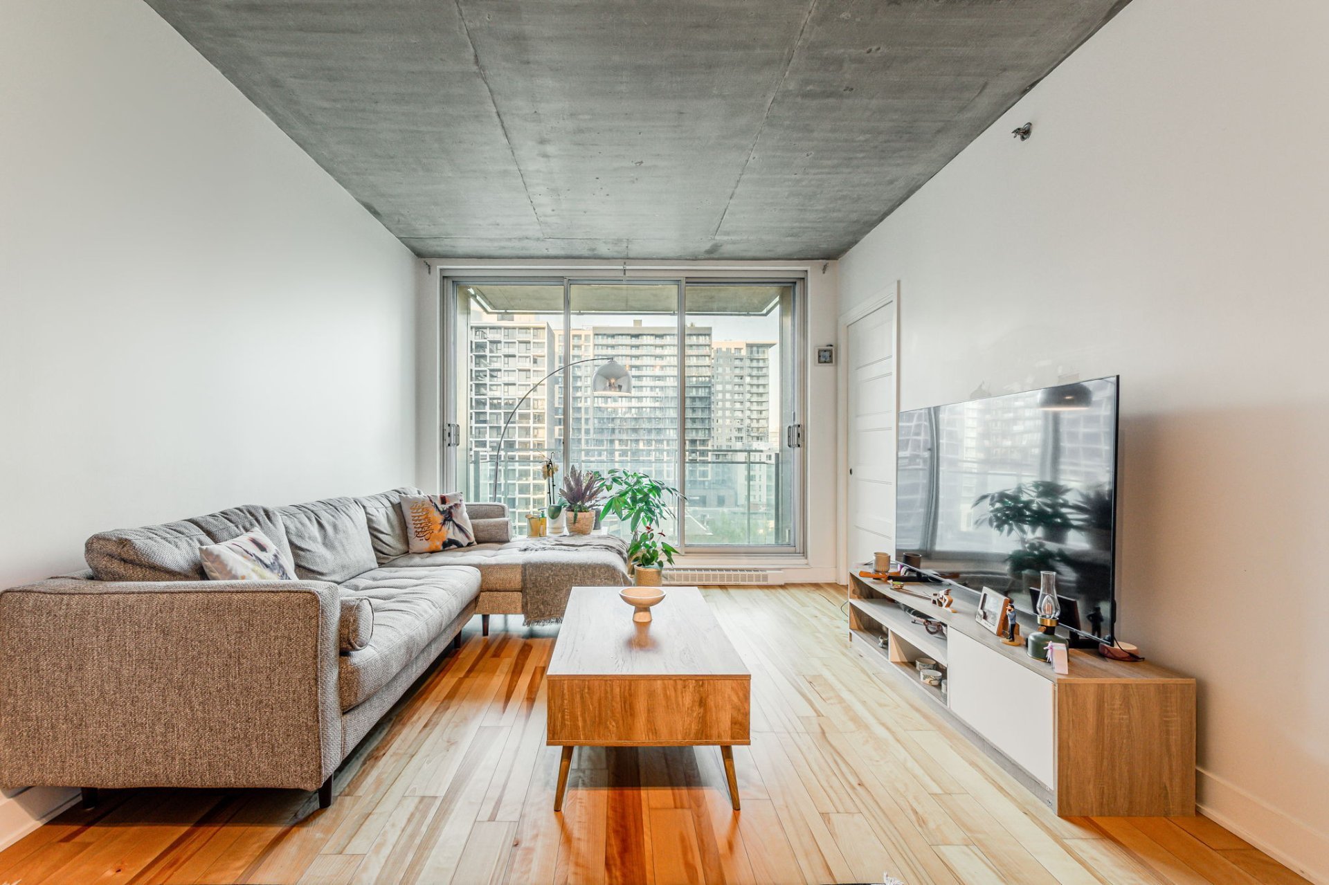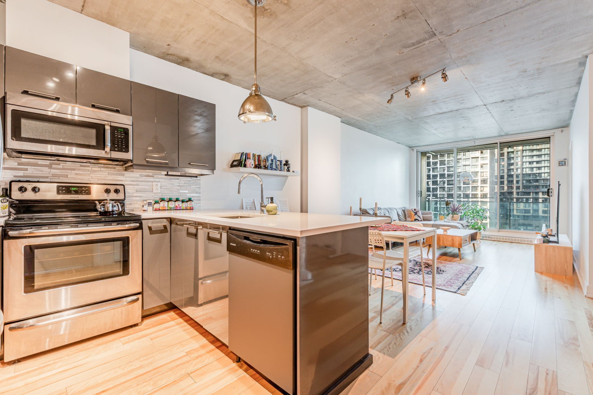 Step into a bright open-concept living space featuring large floor-to-ceiling windows that bathe the unit in natural light, sleek hardwood floors, and modern industrial-style concrete ceilings. The kitchen is designed for both style and efficiency, complete with quartz countertops, a functional island, contemporary cabinetry, and stainless steel appliances.