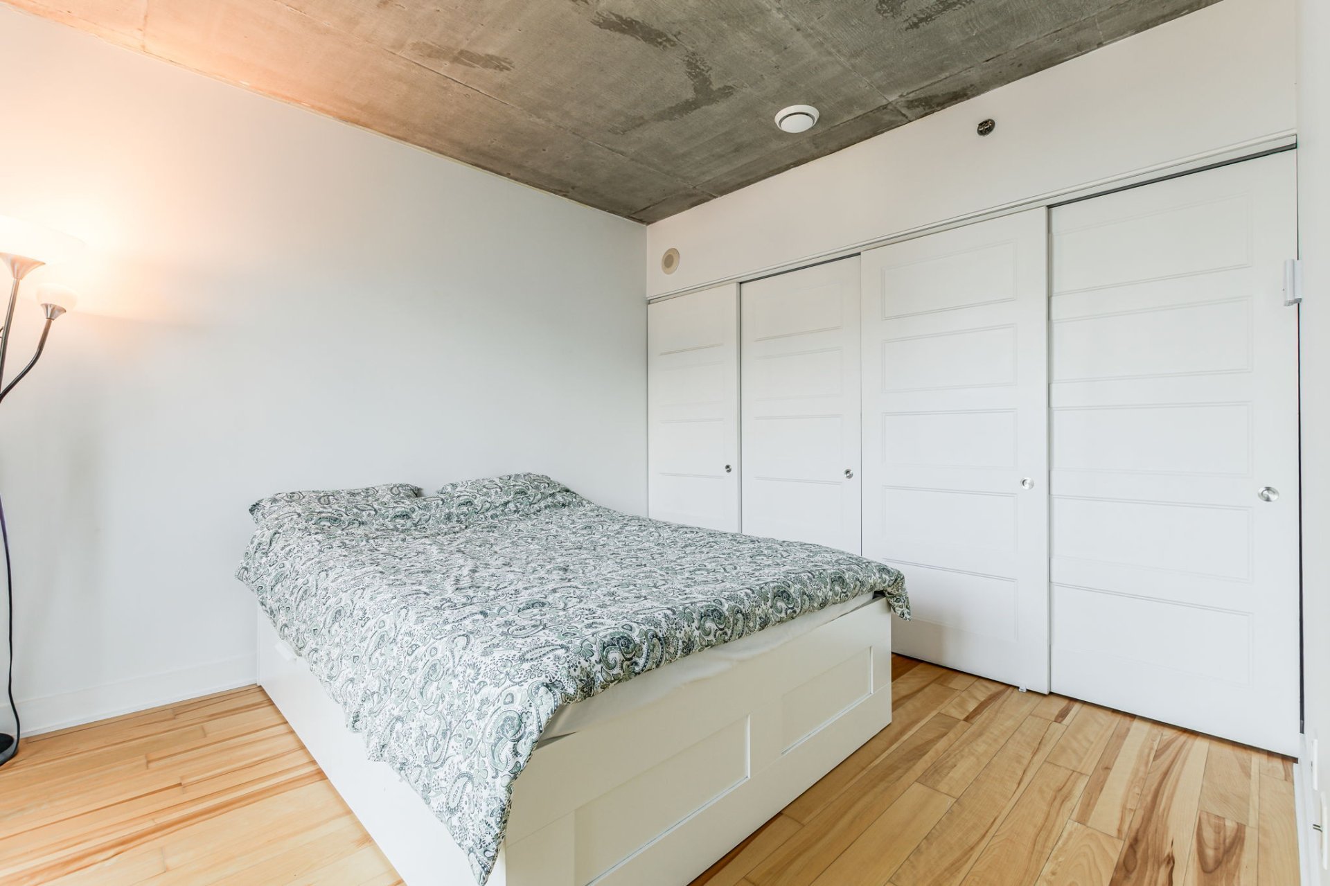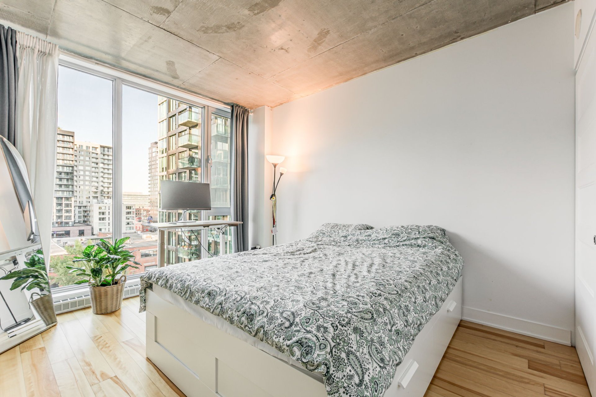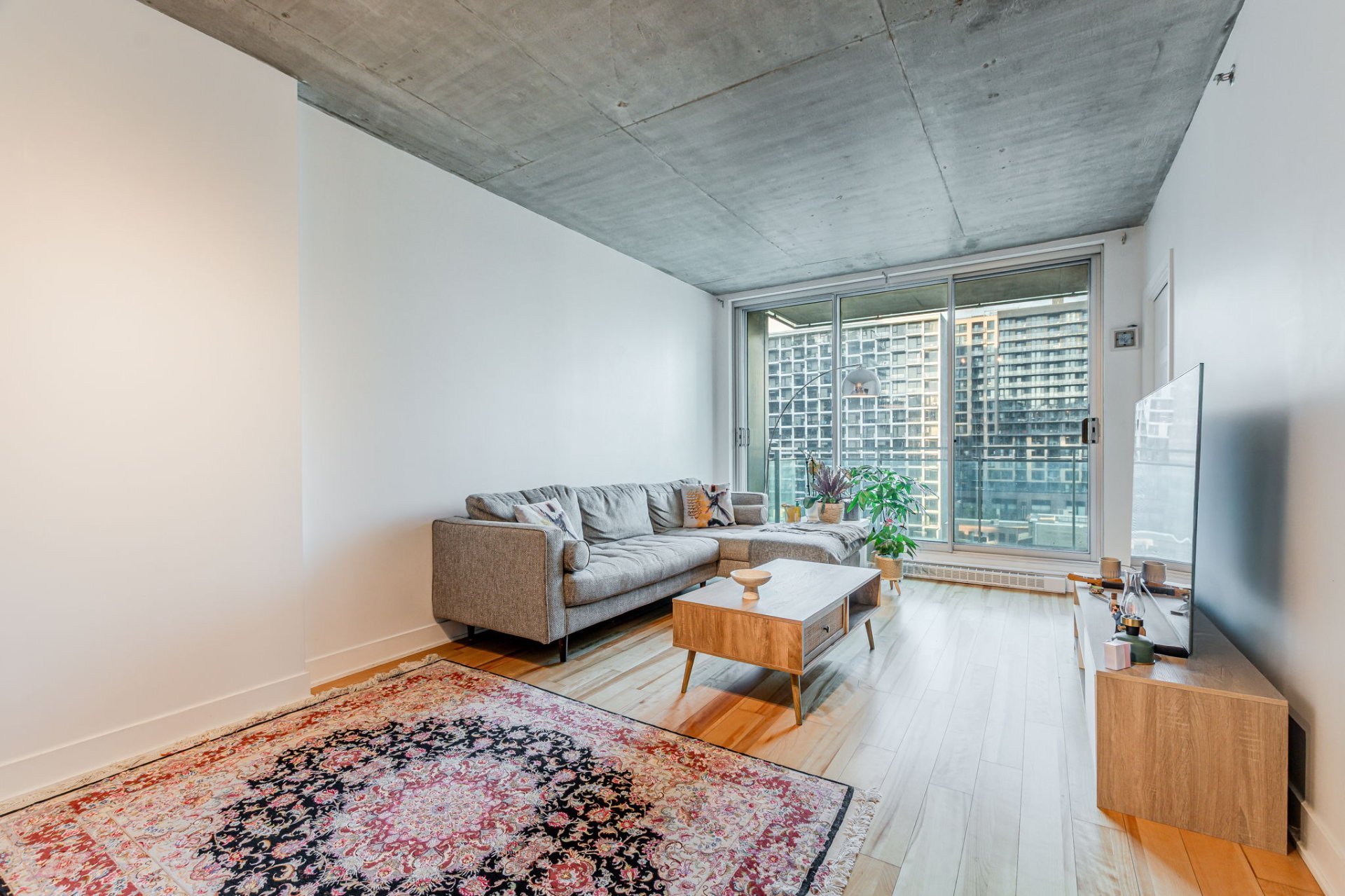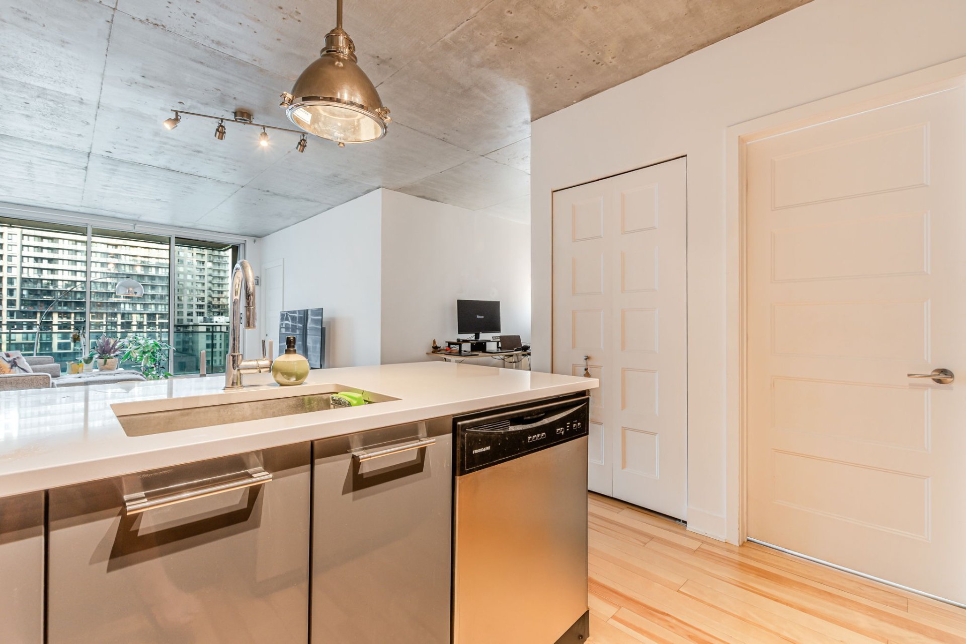 Step into a bright open-concept living space featuring large floor-to-ceiling windows that bathe the unit in natural light, sleek hardwood floors, and modern industrial-style concrete ceilings. The kitchen is designed for both style and efficiency, complete with quartz countertops, a functional island, contemporary cabinetry, and stainless steel appliances.