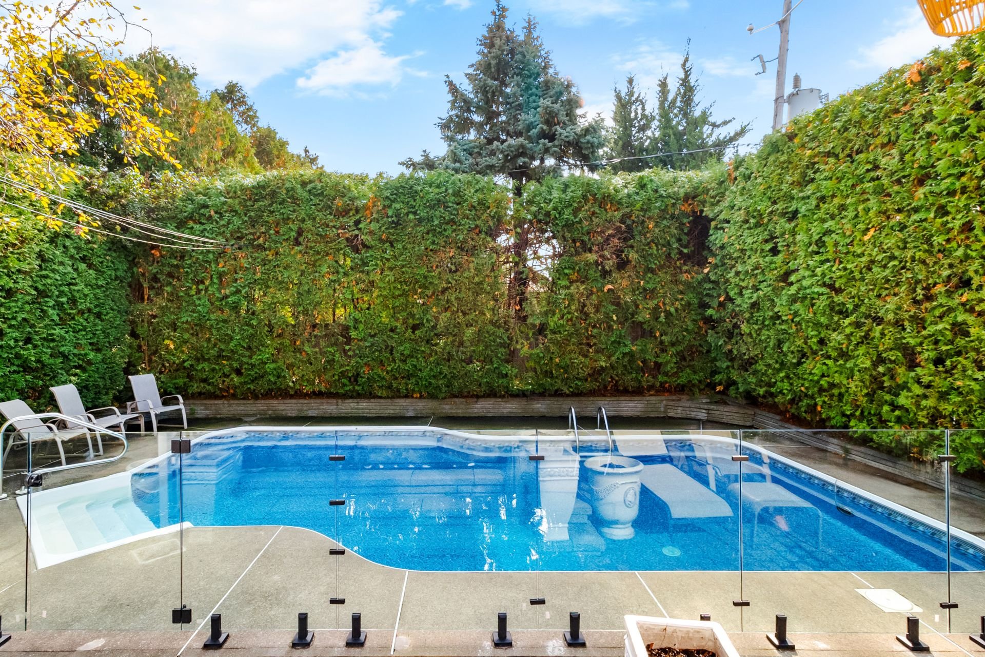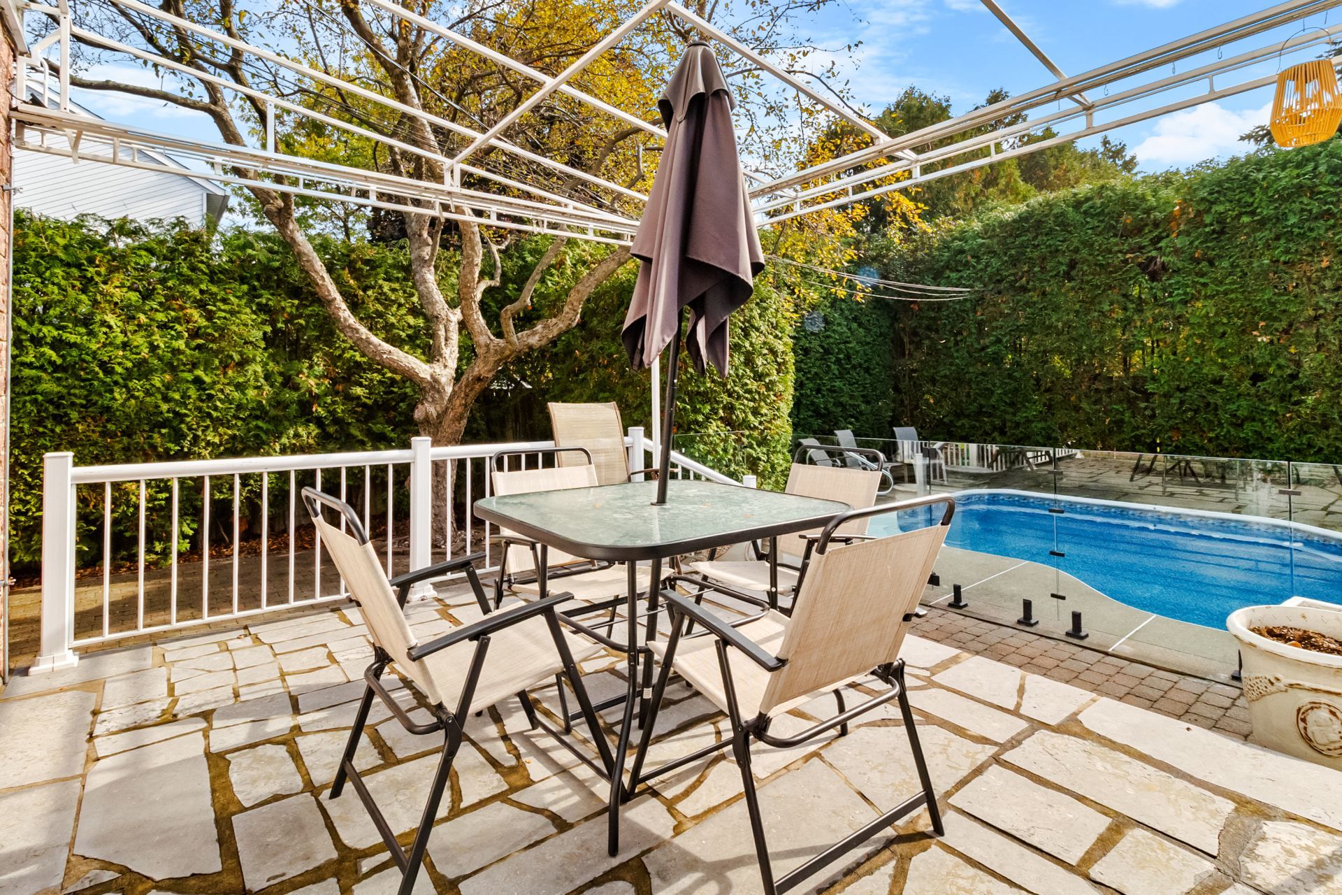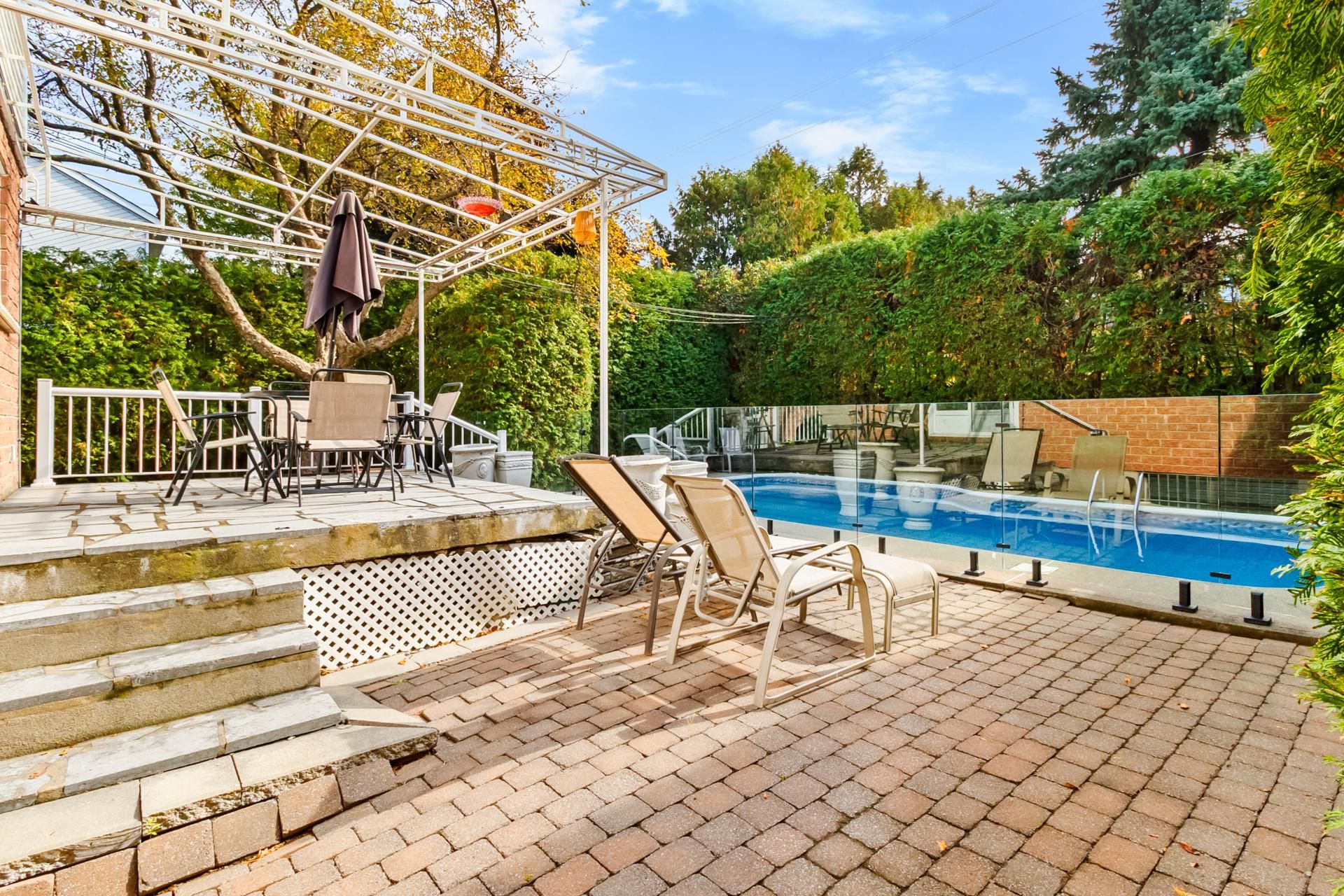 Step outside to a private, fully landscaped backyard with mature hedges, a large terrace, and an inground pool an ideal space to relax or host guests during the warmer months.