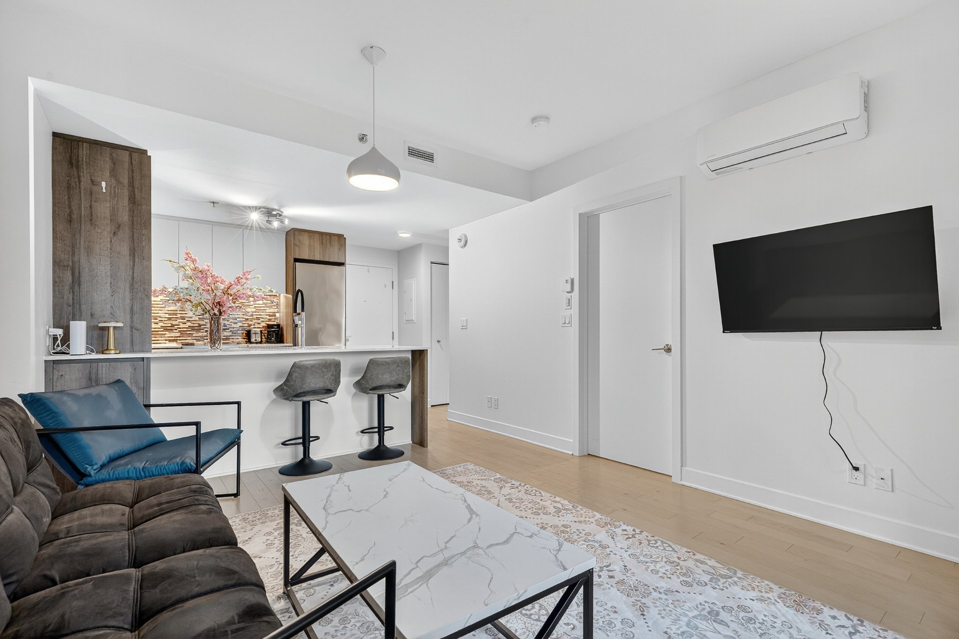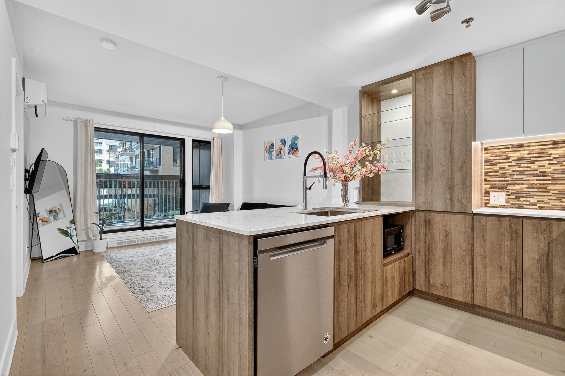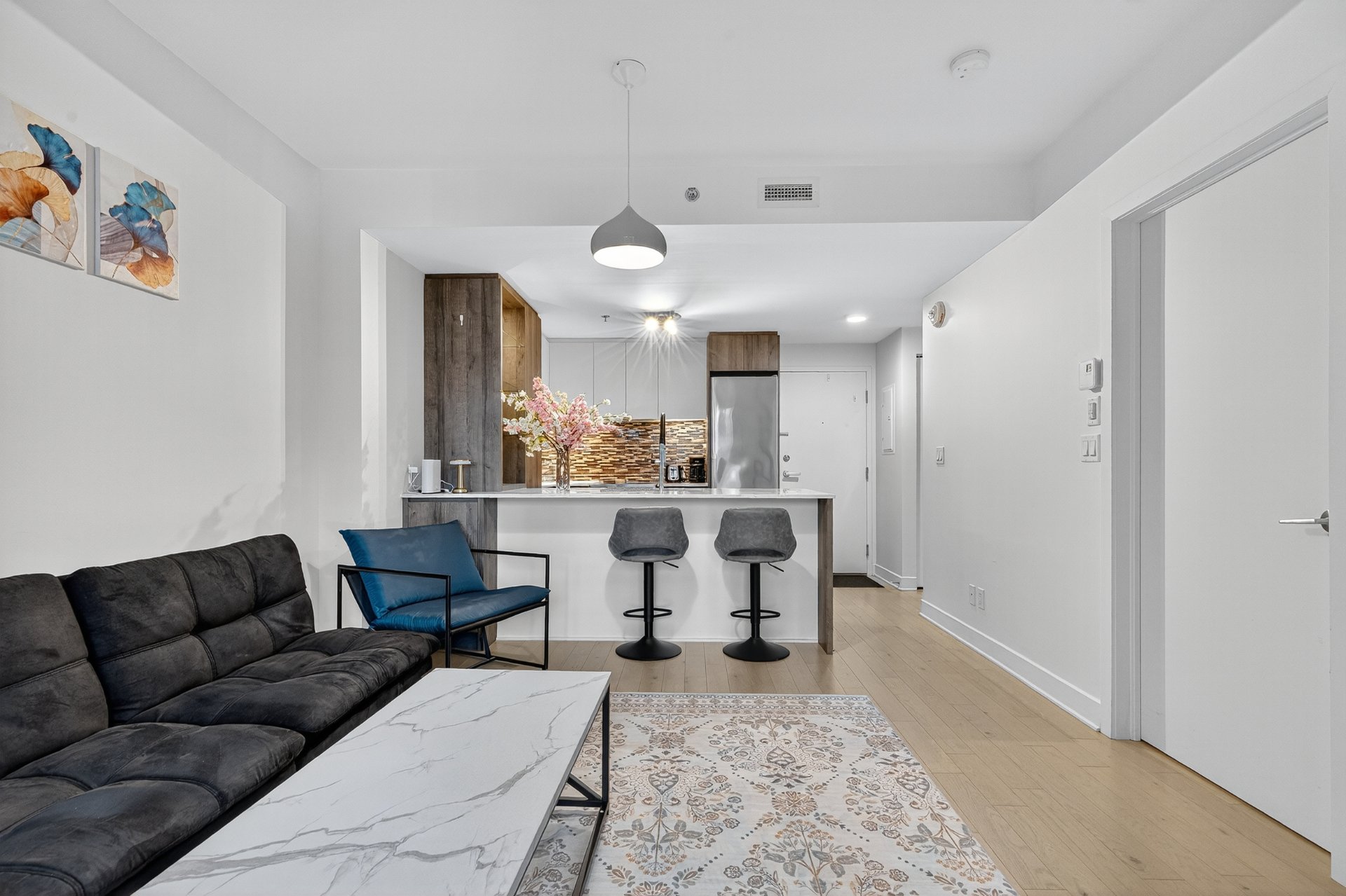 A few steps from the Lachine Canal in front of a square filled with mature trees and a dog park5 minutes from downtown.