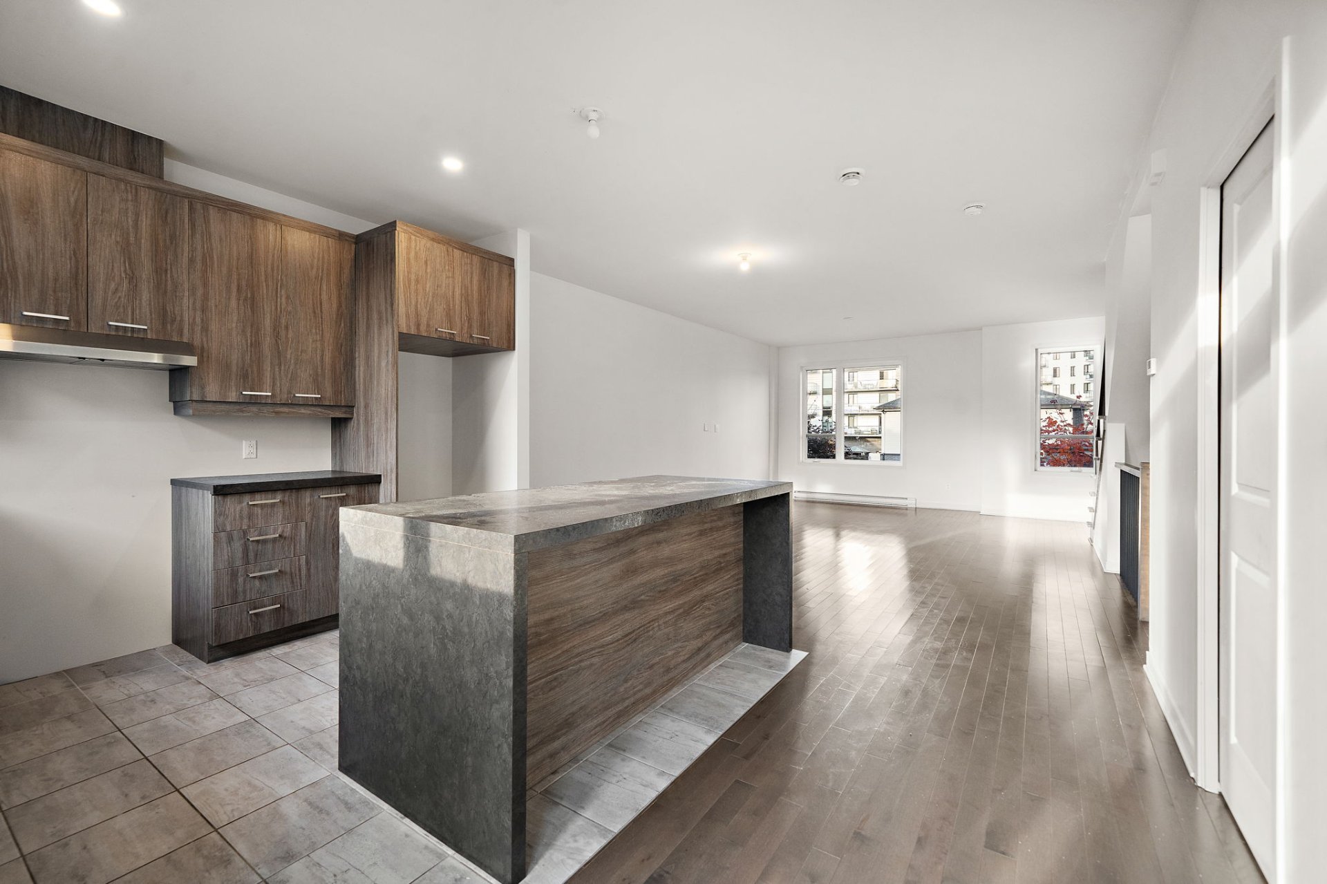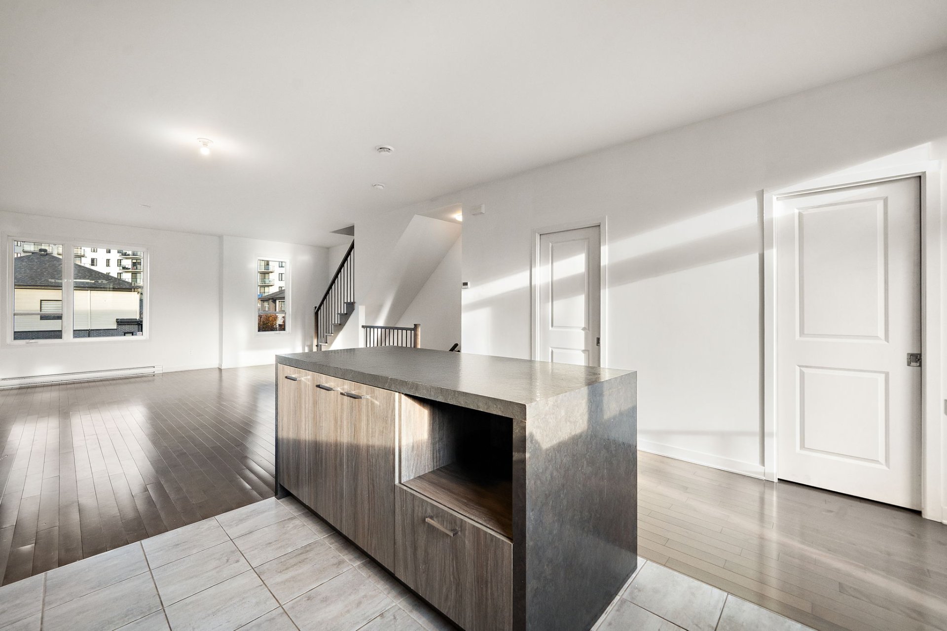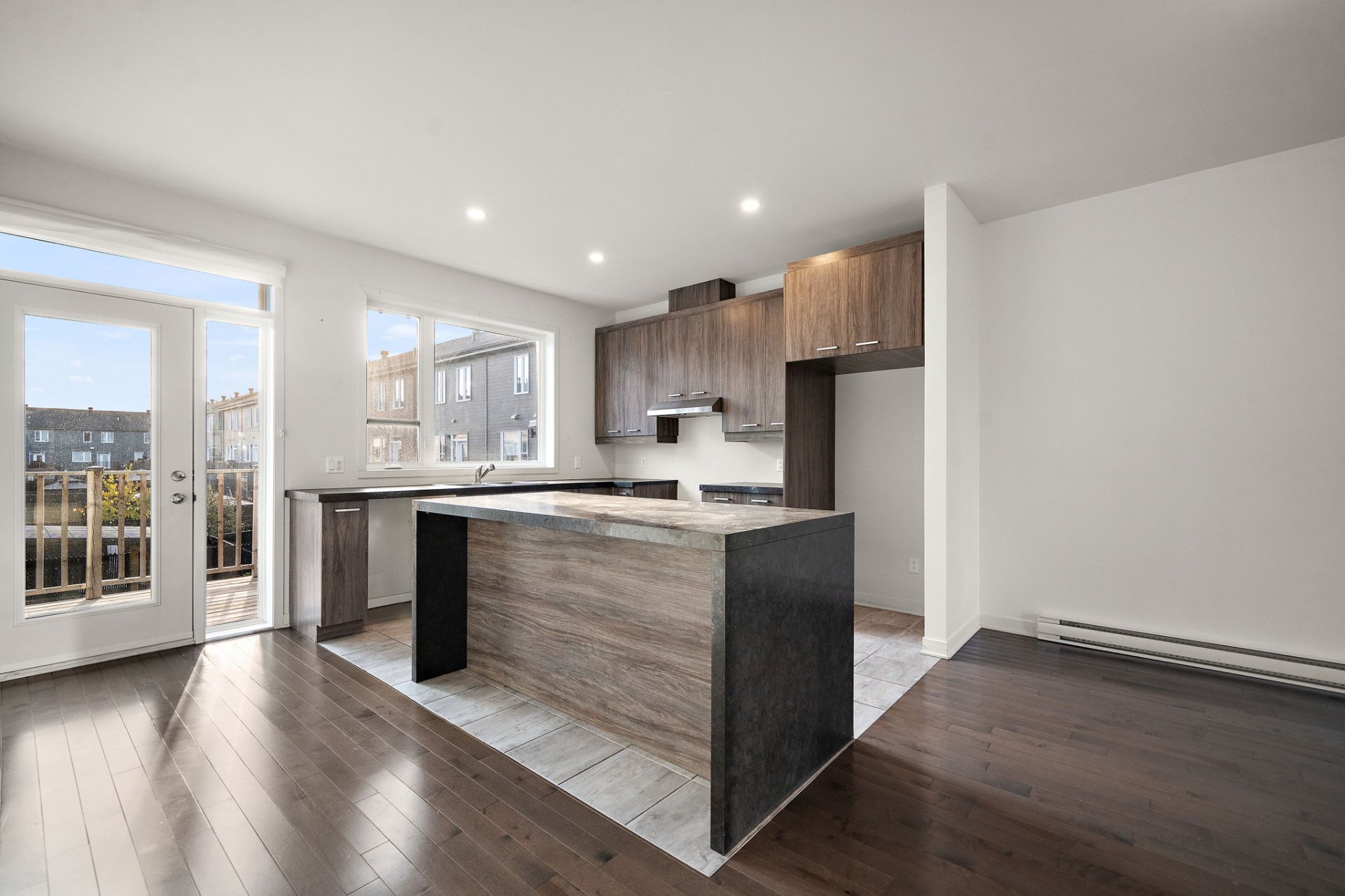 The open-concept main floor is flooded with natural light, creating an airy and inviting atmosphere. The contemporary kitchen with central island opens to the spacious dining and living areas, perfect for entertaining. Patio doors lead to a private balcony overlooking the backyard.