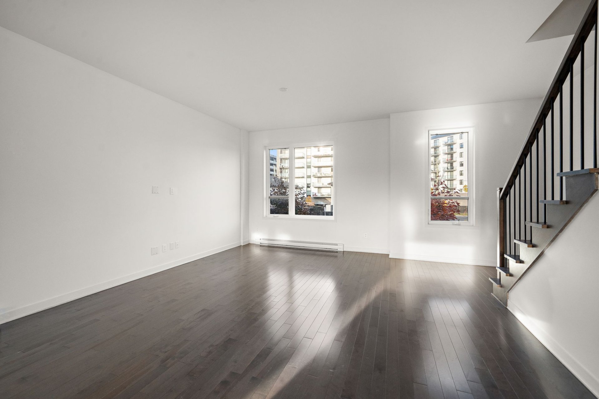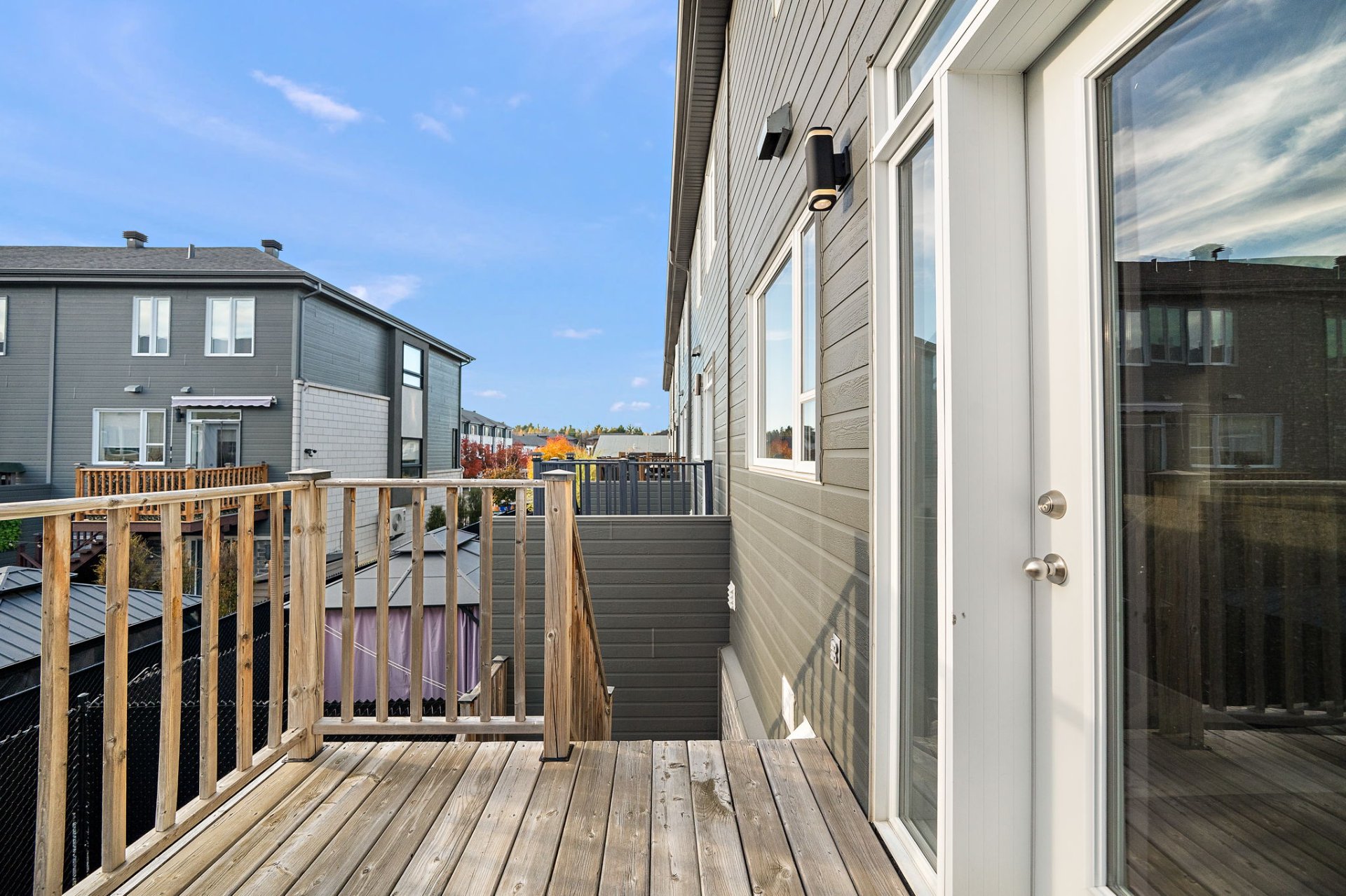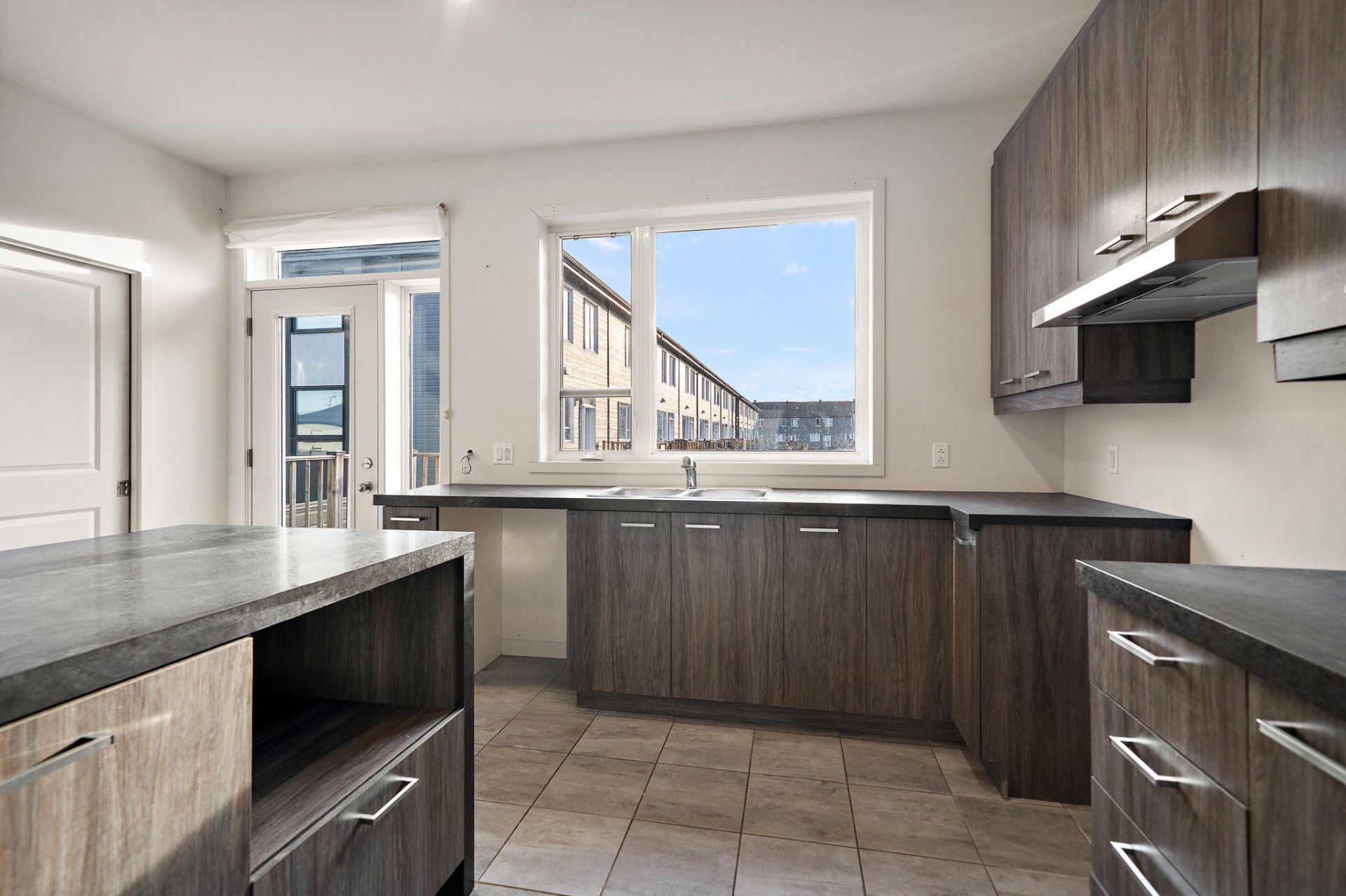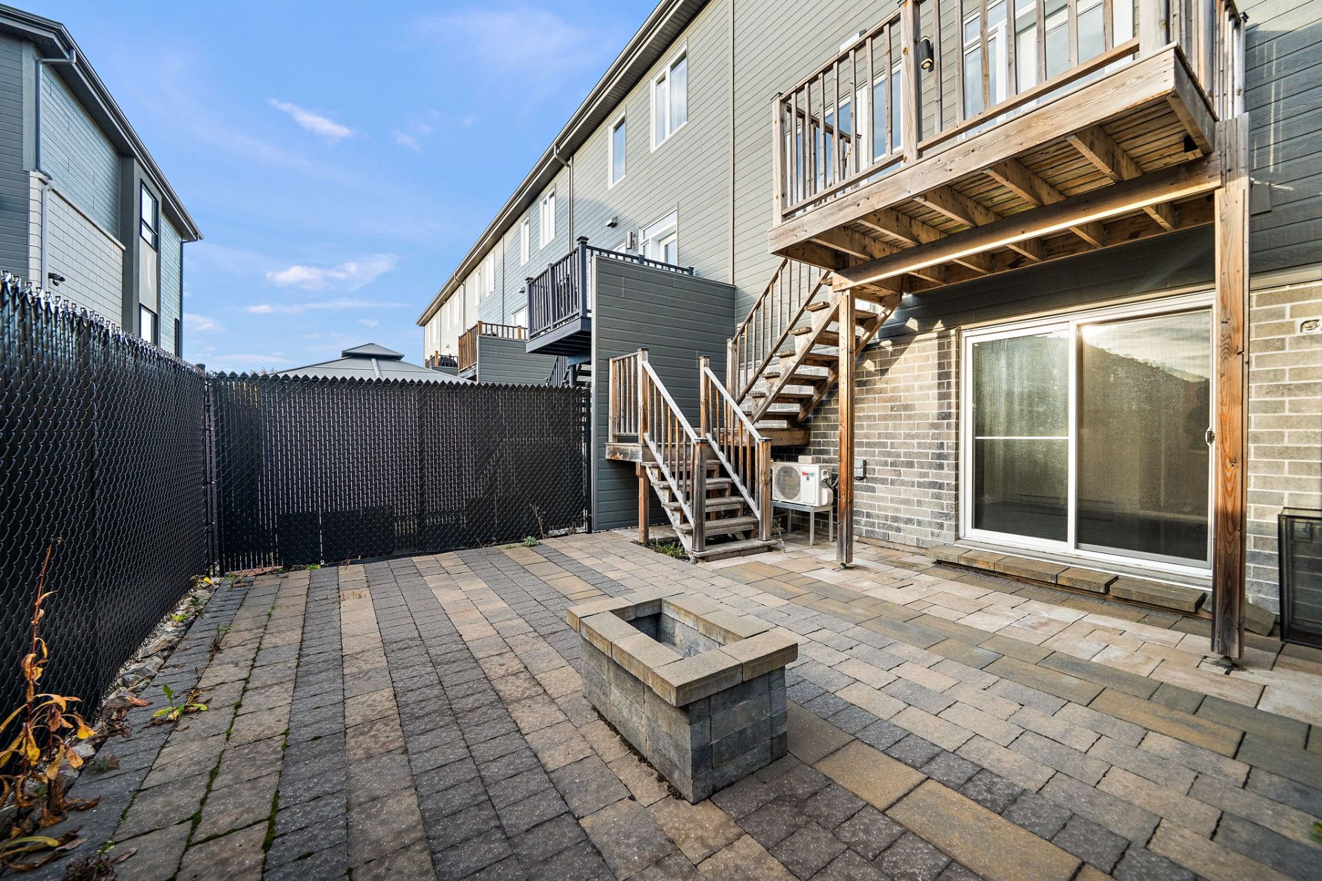 The open-concept main floor is flooded with natural light, creating an airy and inviting atmosphere. The contemporary kitchen with central island opens to the spacious dining and living areas, perfect for entertaining. Patio doors lead to a private balcony overlooking the backyard.