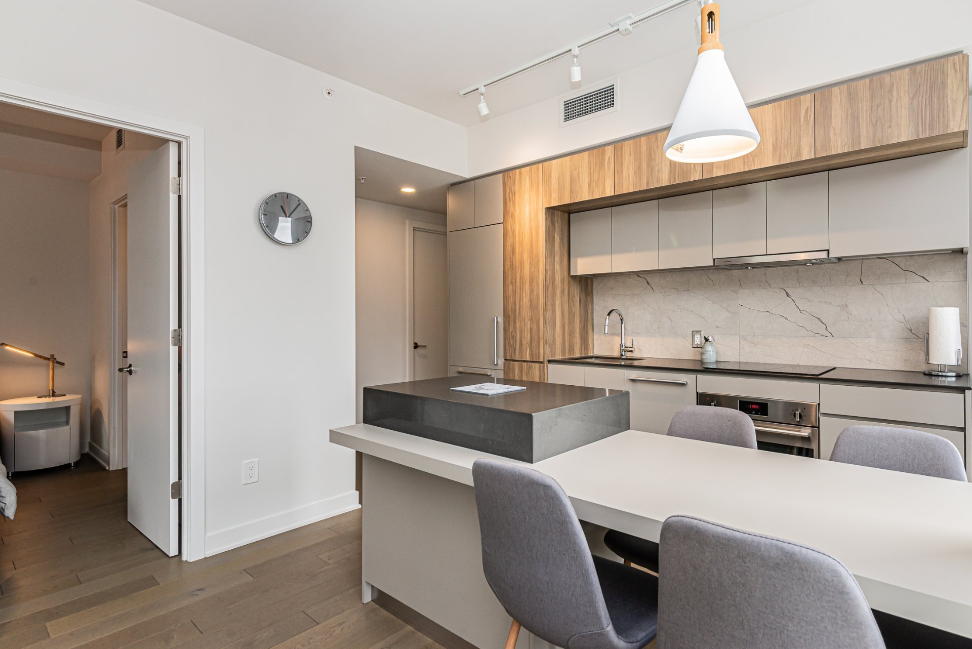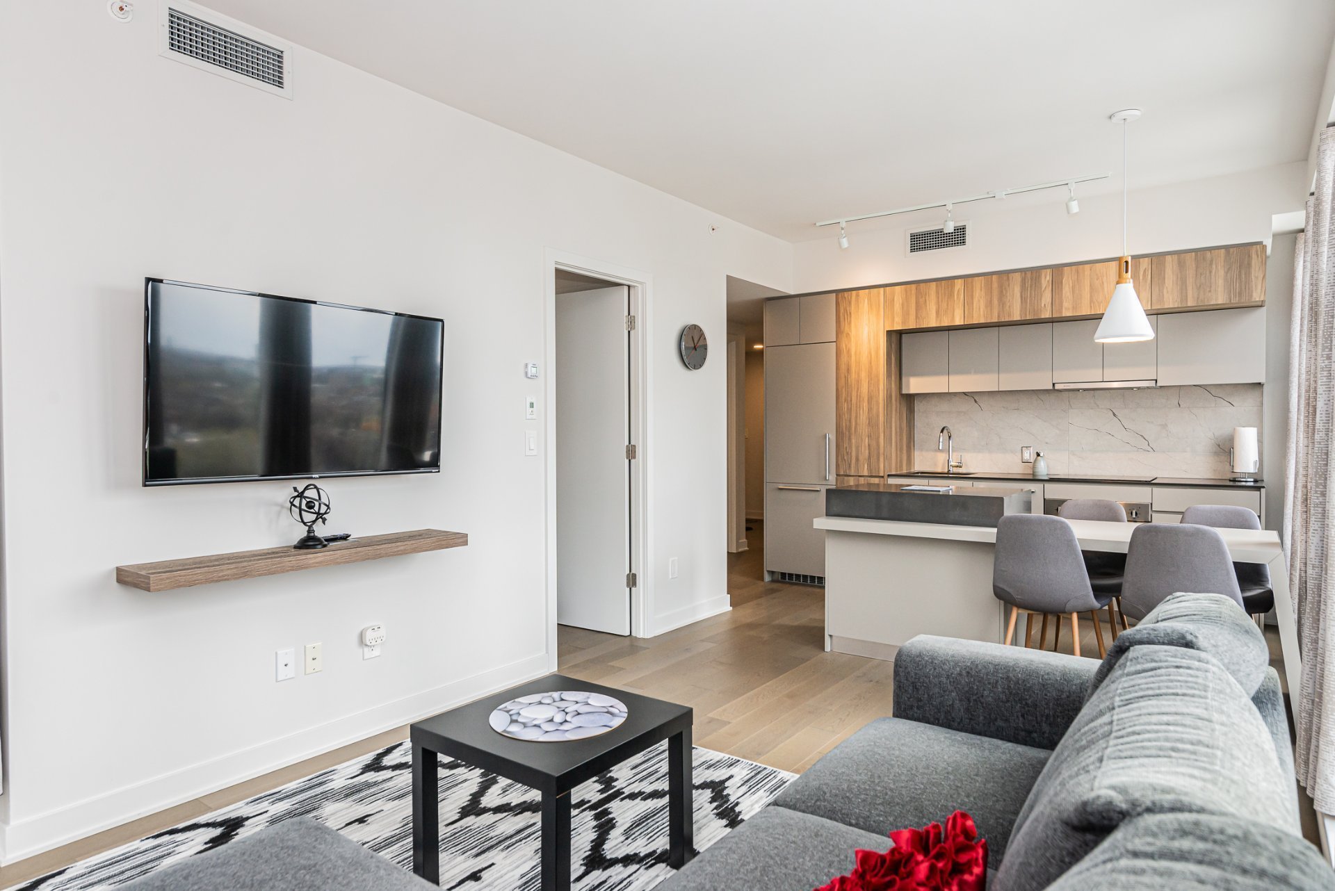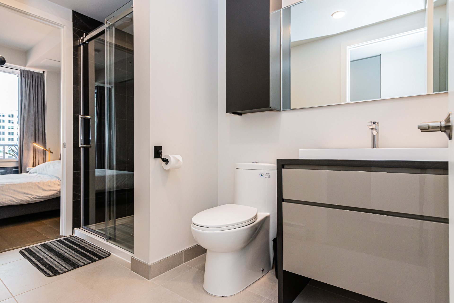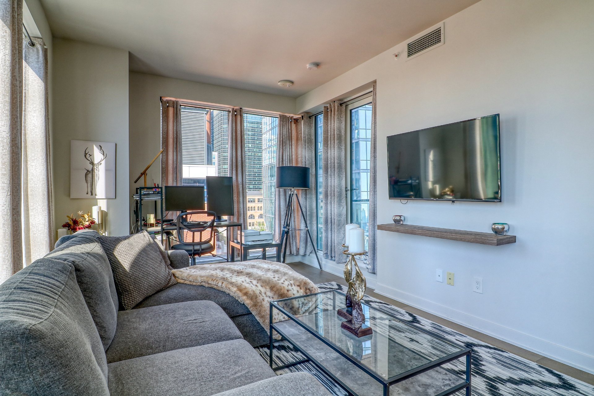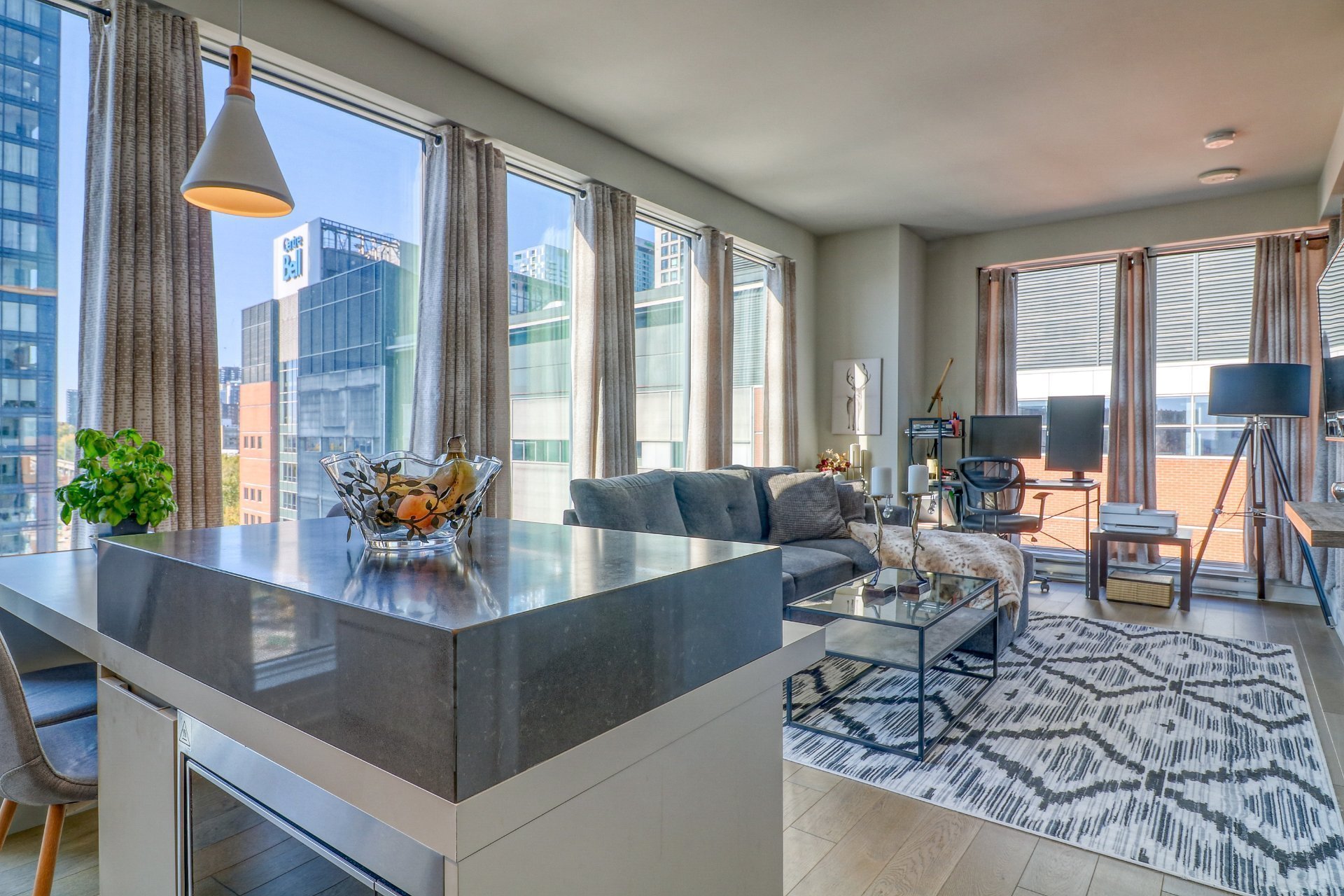For immediate occupancy (12 month lease): Tour des Canadiens 2: luxurious fully furnished 2 bedroom condo with 2 full bathrooms, corner unit with garage. Great natural light! Enjoy a balcony, appliances, garage & hot water included. Exceptional common areas such as an indoor swimming pool, gym, game room, sauna, spa & Sky Lounge on the 54th floor. 24h security. Live in the heart of town, with easy access to restaurants, the metro, grocery store, cafes and much more!