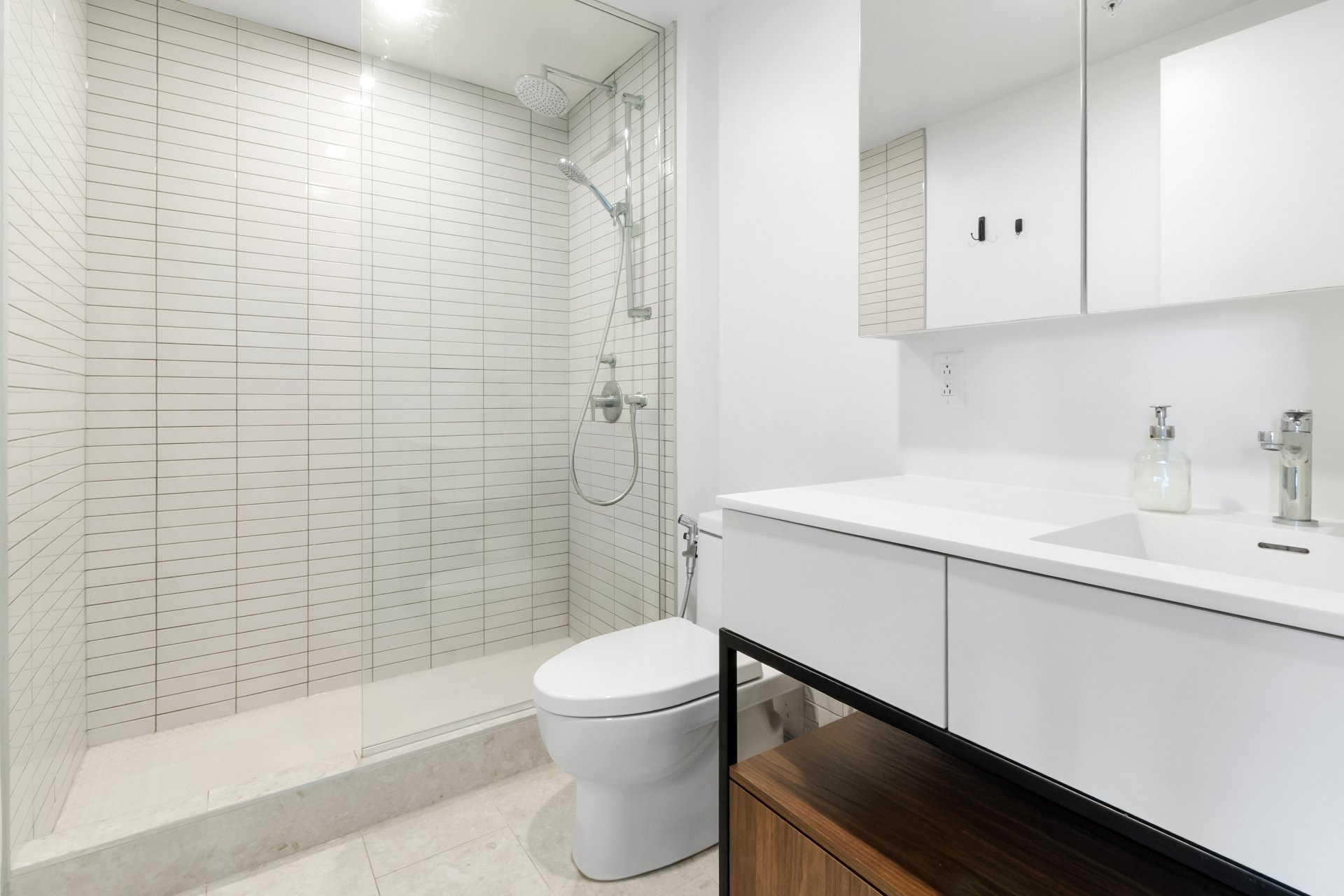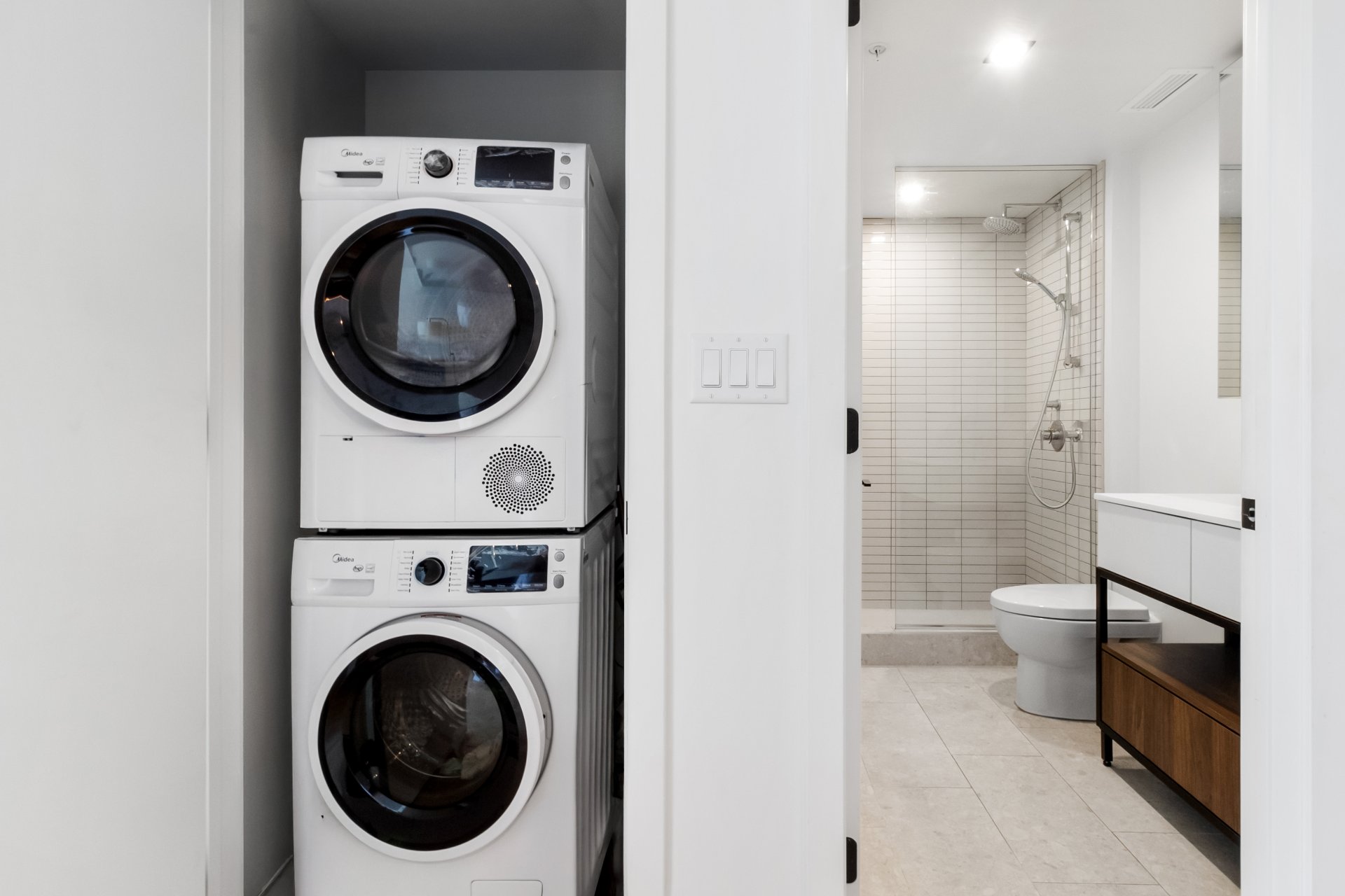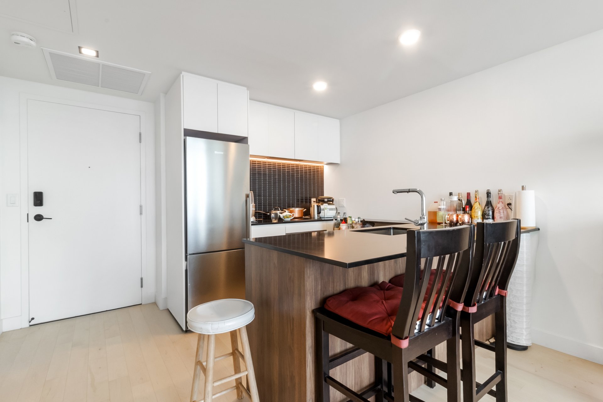 The unit boasts a modern open-concept layout, featuring high-end finishes and contemporary design throughout. The gourmet kitchen is fully equipped with included appliances: refrigerator, stove, built-in microwave, dishwasher, and washer/dryer. The sleek quartz countertops, custom cabinetry, and high-performance fixtures elevate the space with style and functionality.