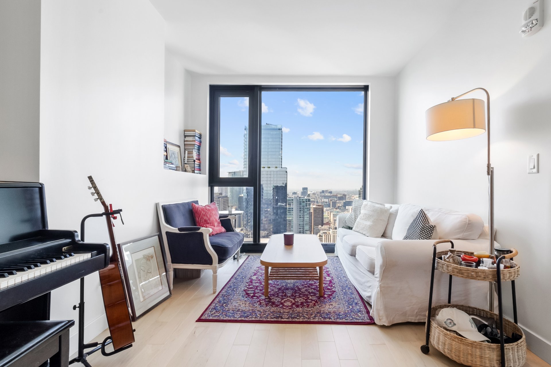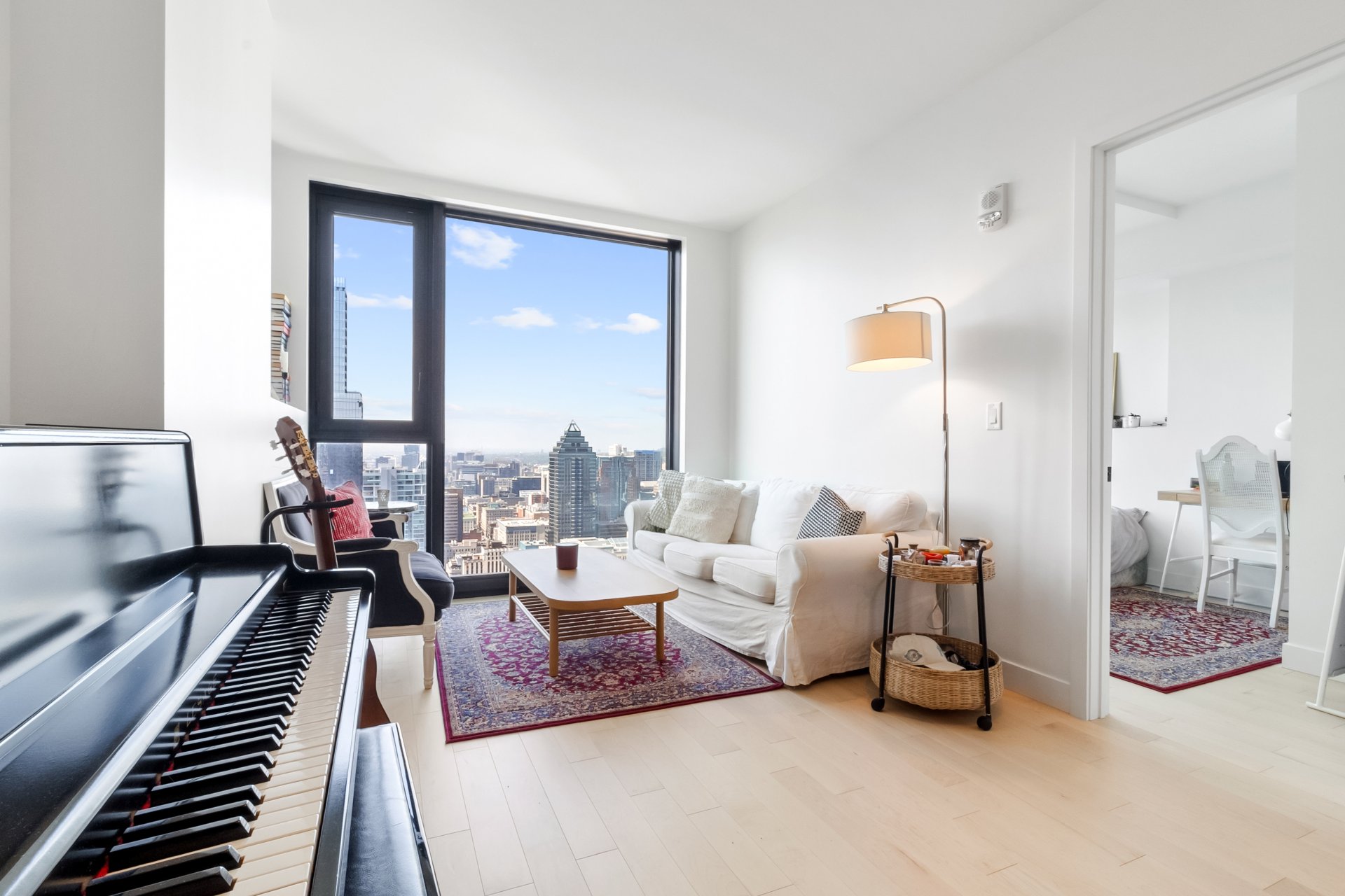 Welcome to Maestria Condominiums, one of Montreal’s most prestigious residential developments in the heart of the Quartier des Spectacles. Perched on the 47th floor, this elegant one-bedroom condo offers breathtaking panoramic views of the city skyline and river, with floor-to-ceiling windows that flood the space with natural light.