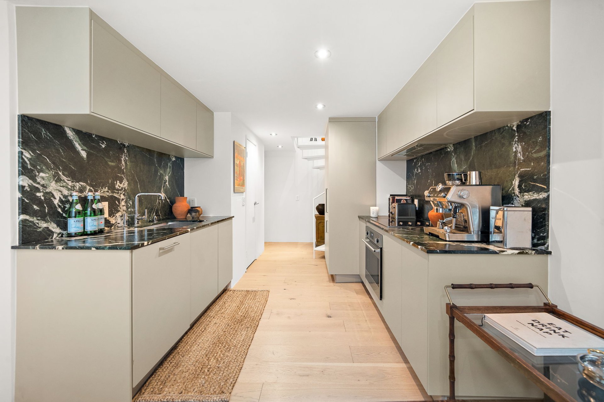 Panelled, built-in appliances including fridge, oven, Fulgor Milano cooktop, dishwasher, ceiling fan, custom curtains