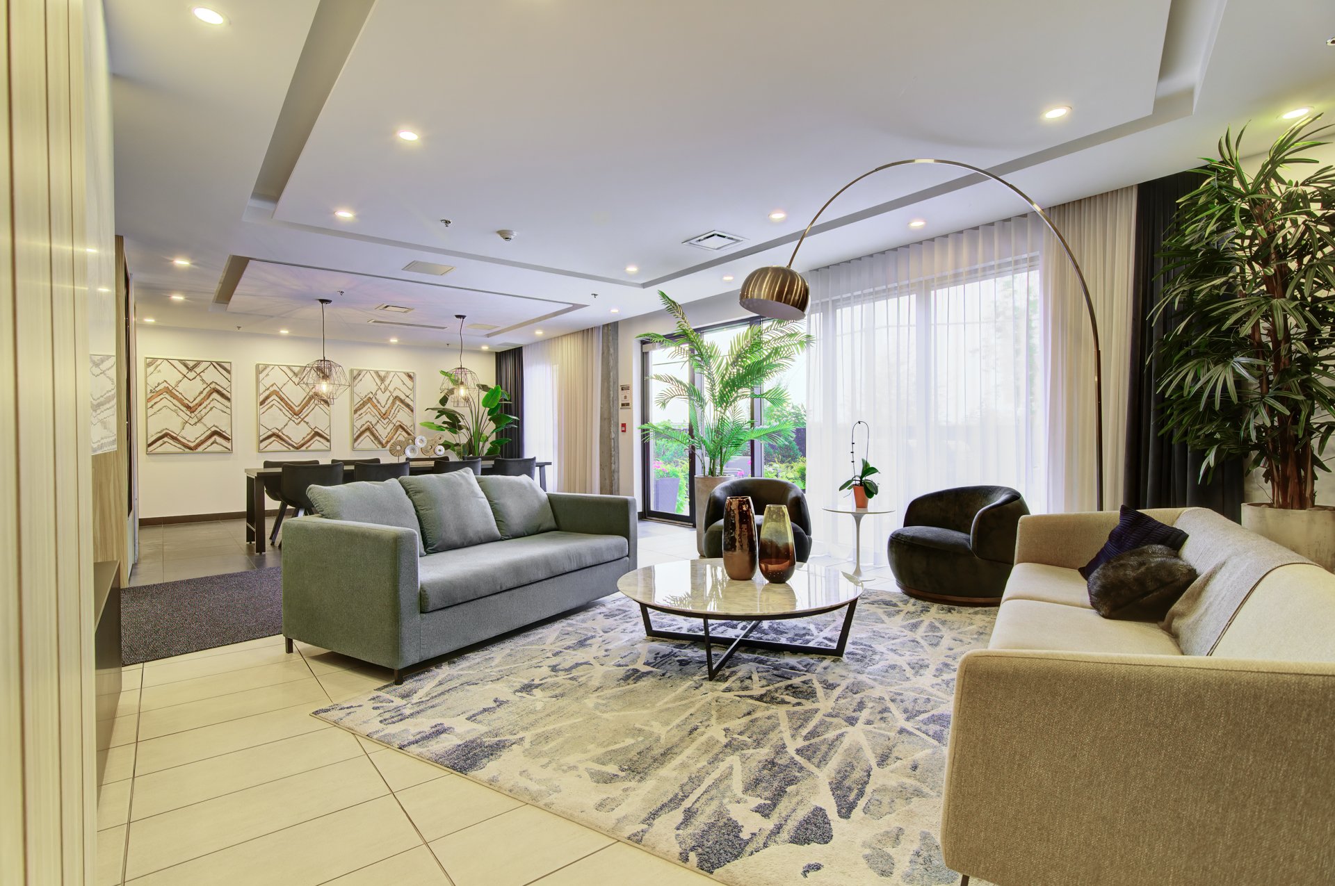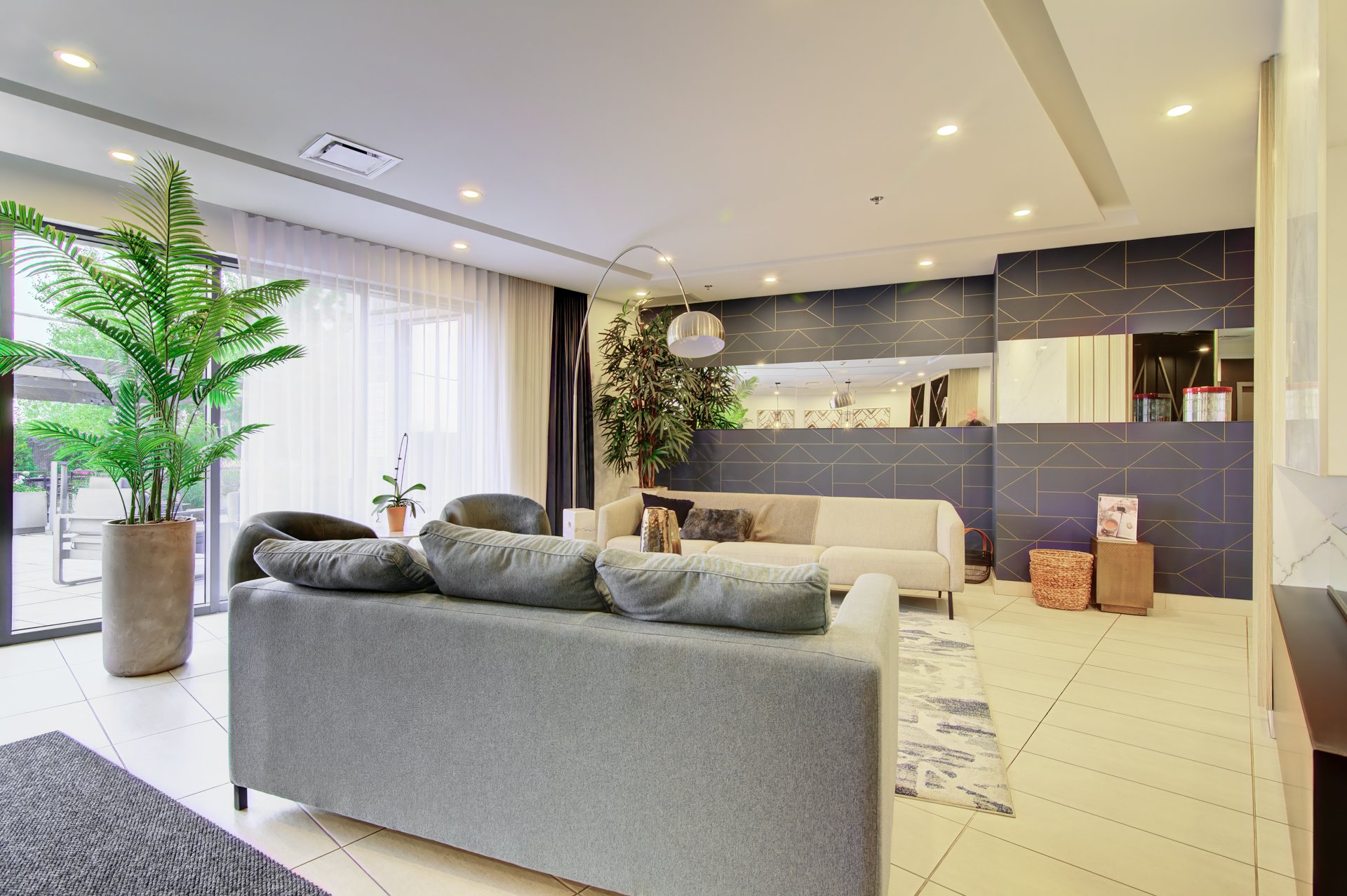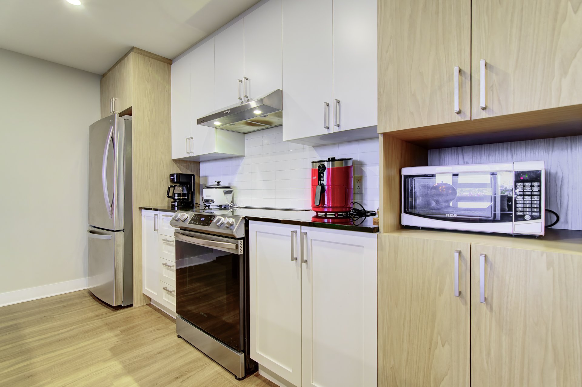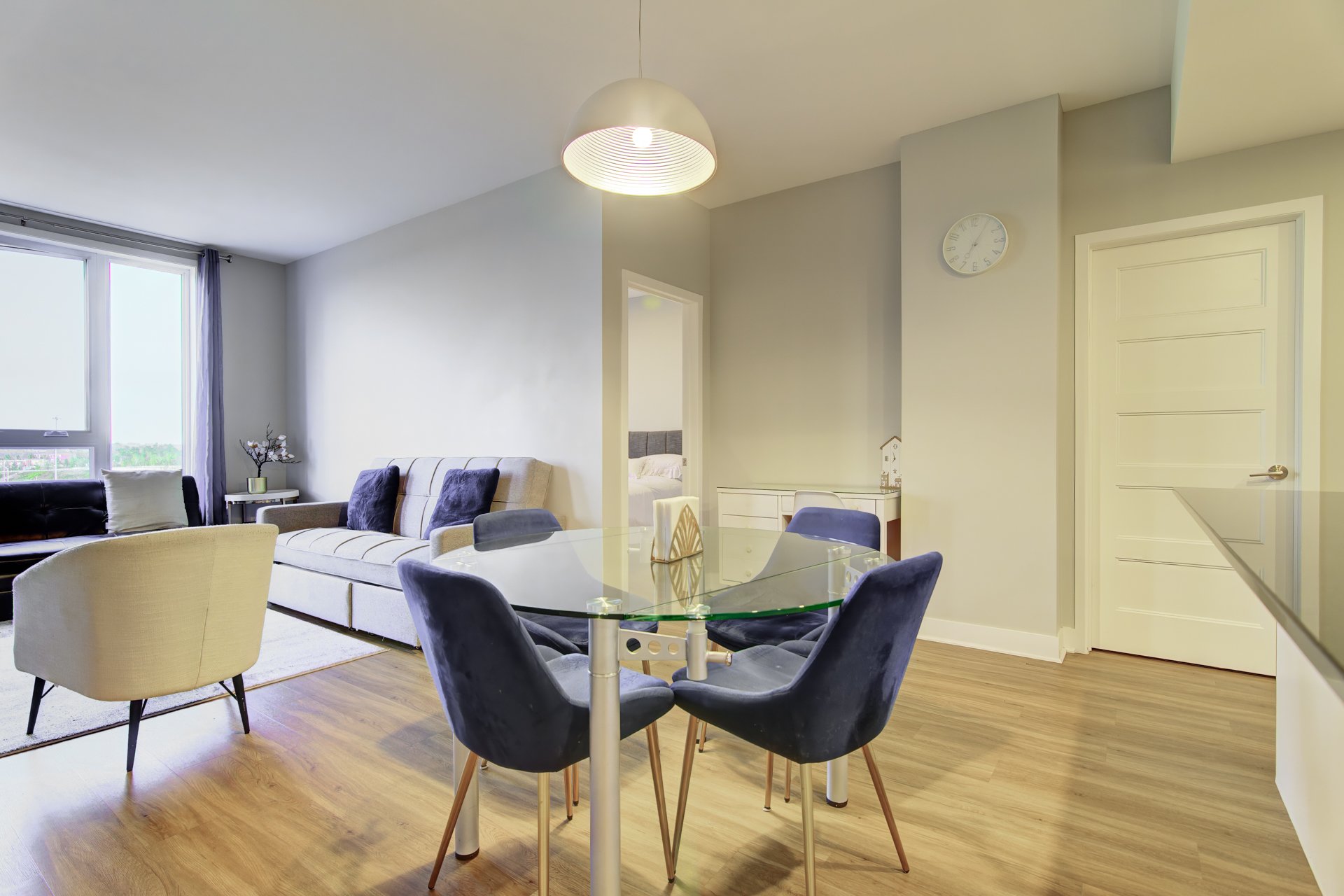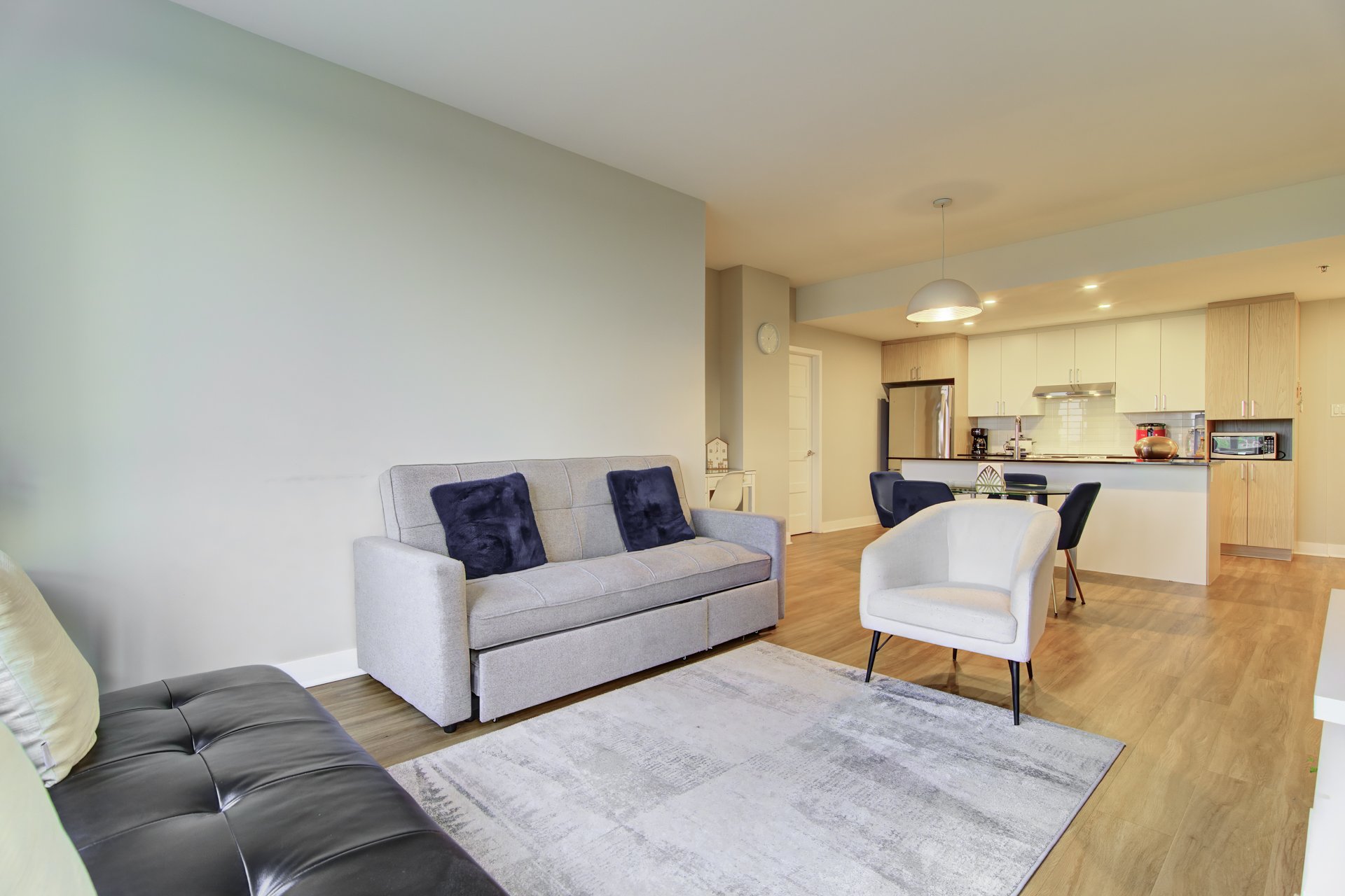 Large condo2 generously sized bedrooms1 bathroomOpen-concept kitchen, dining room, and living room1 garage and 1 outdoor parking space**Several common areas, shared kitchen for your eventsIndoor poolExercise roomLarge outdoor terrace with BBQ available to tenantsWorkshop for bike storage and maintenanceEasy access to the highwayNear commuter train and public transportationElementary and secondary schools nearby