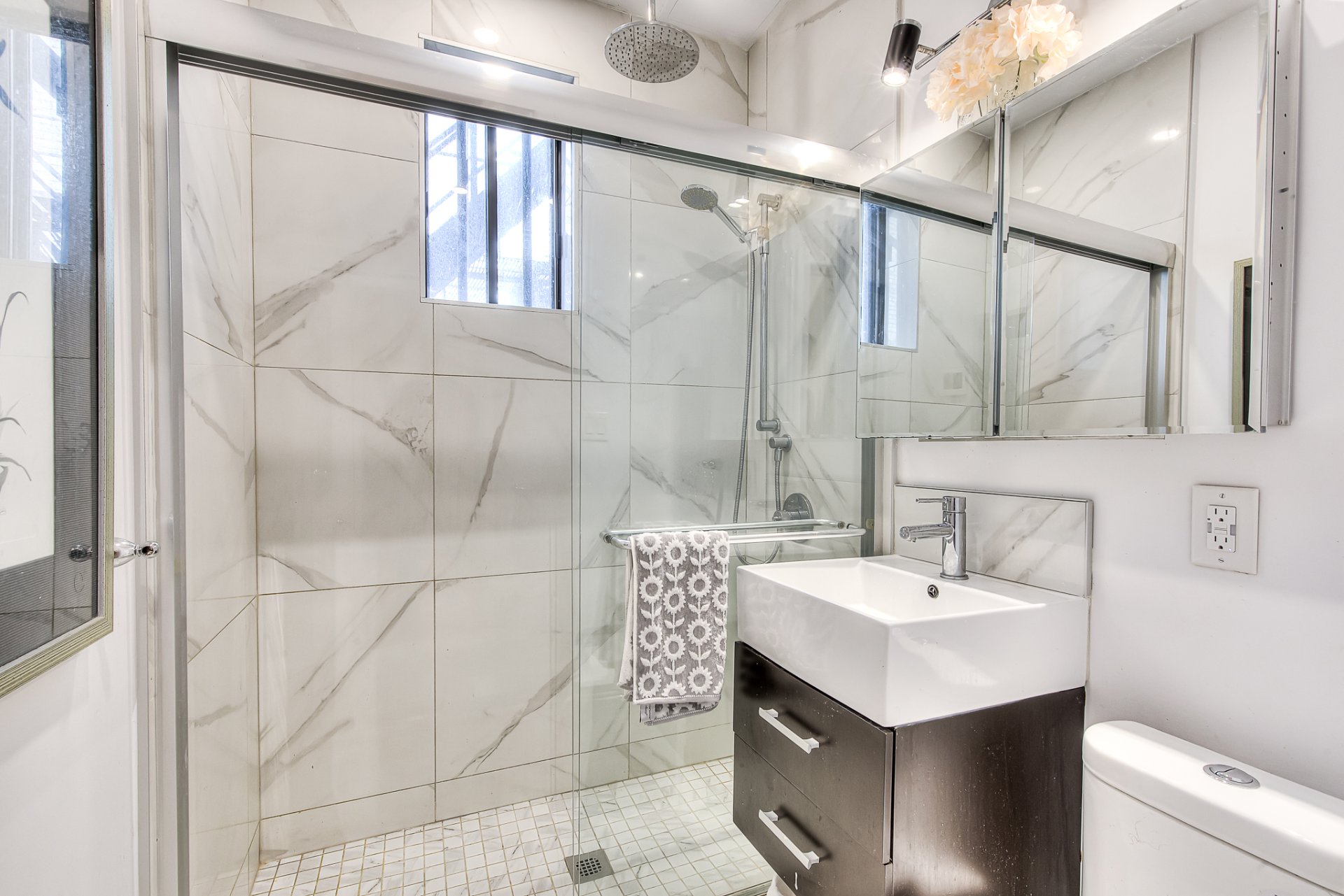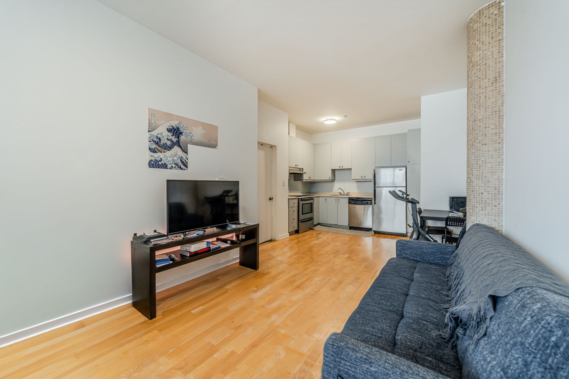 The living room, bathed in natural light, creates a welcoming and friendly atmosphere, while the kitchen, renovated with quartz countertops and generous storage space, inspires functionality and modernity. The bathroom, also renovated with heated floors, harmoniously completes this space.