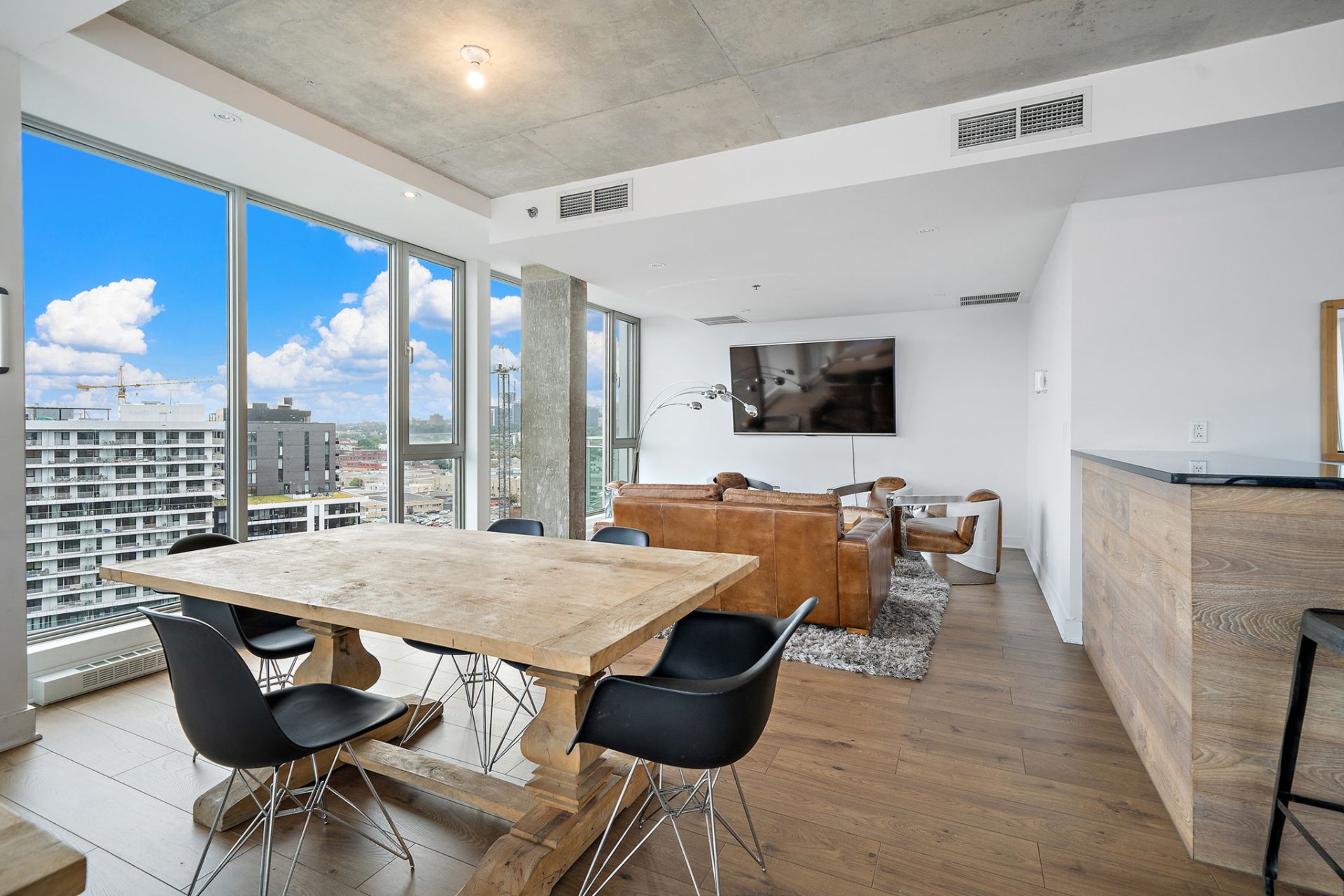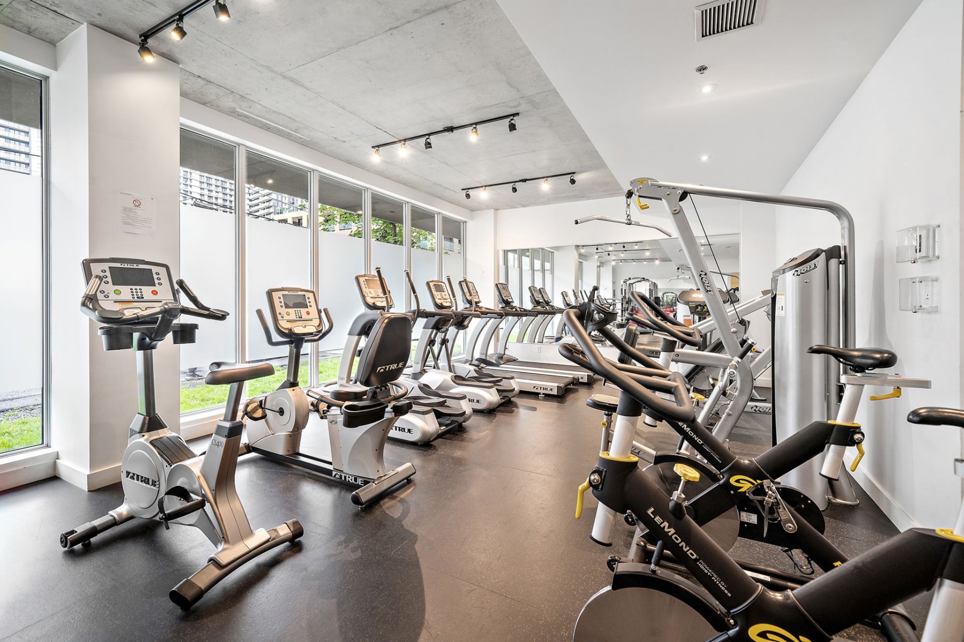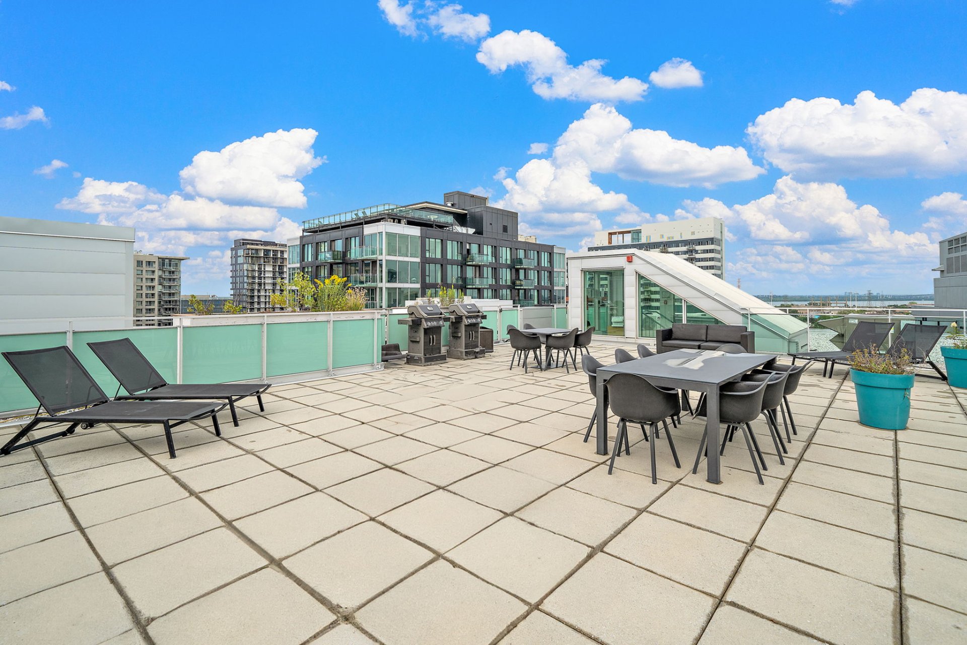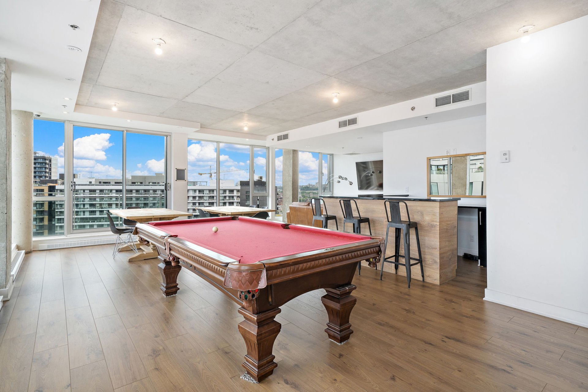- Fully equipped fitness room- Elegant billiards room with lounge area and reception space, perfect for entertaining- Common rooftop terrace with relaxation areas and BBQ, showcasing spectacular views of downtown Montreal and creating an ideal setting to enjoy sunny days