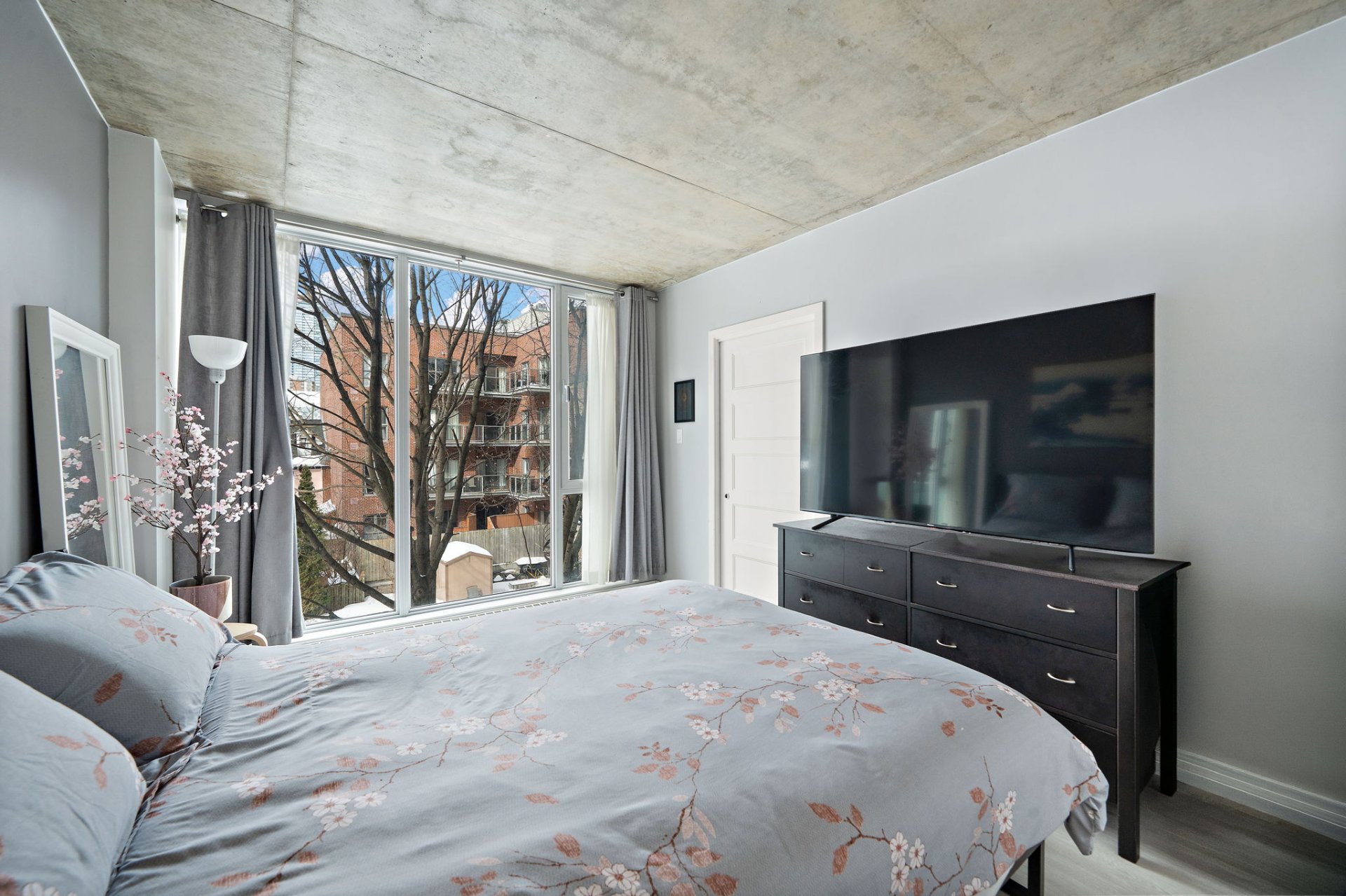 The unit stands out with its bright open-concept living area, enhanced by 9-foot exposed concrete ceilings and impressive floor-to-ceiling windows that flood the space with natural light. The living and dining areas flow seamlessly into a contemporary kitchen featuring sleek cabinetry, quality countertops, and modern appliances. The primary bedroom offers a comfortable retreat, while the extra room (office or guest bedroom) provides ideal flexibility for remote work or visitors. The bathroom showcases tasteful finishes and a practical layout. The unit also includes indoor parking, a significant asset in an urban setting.