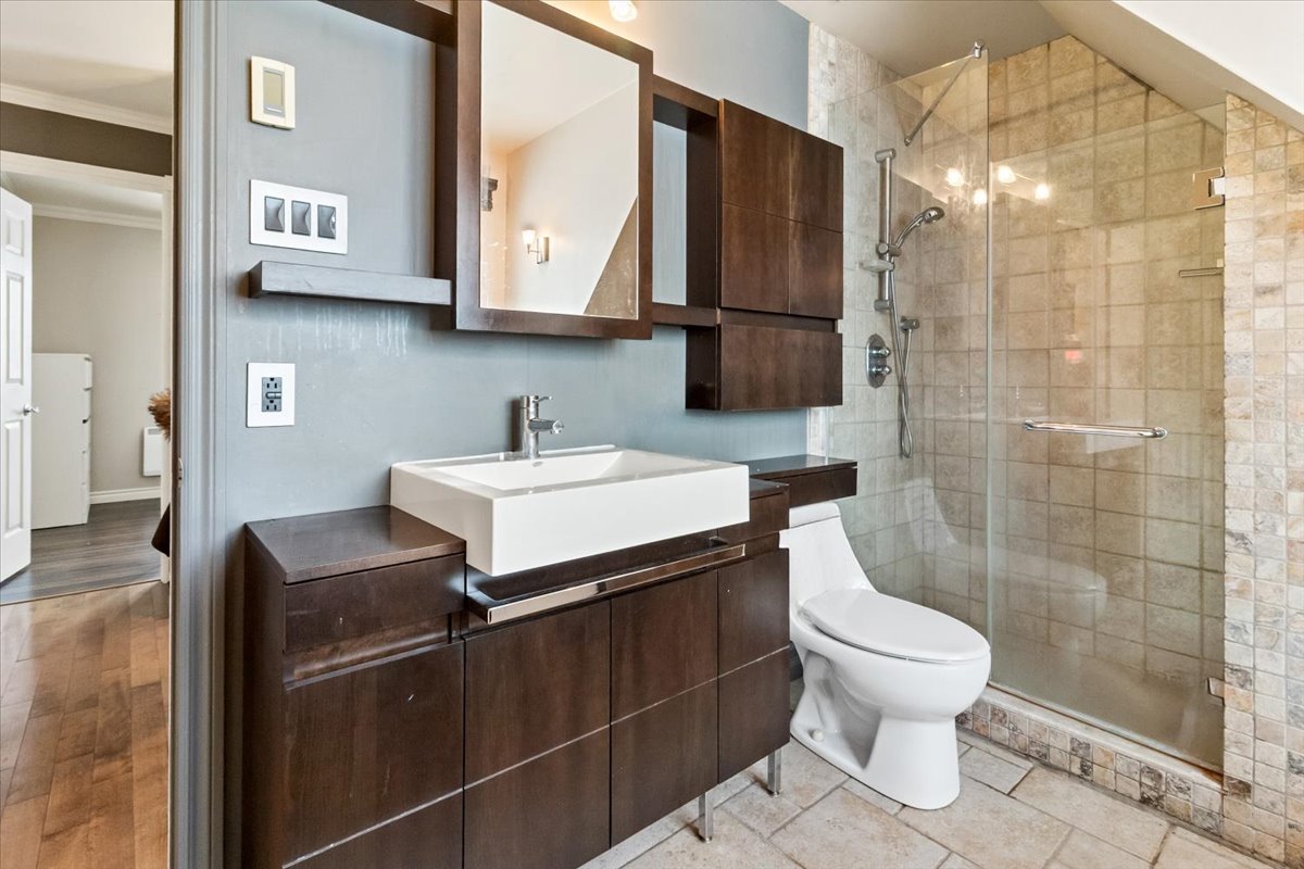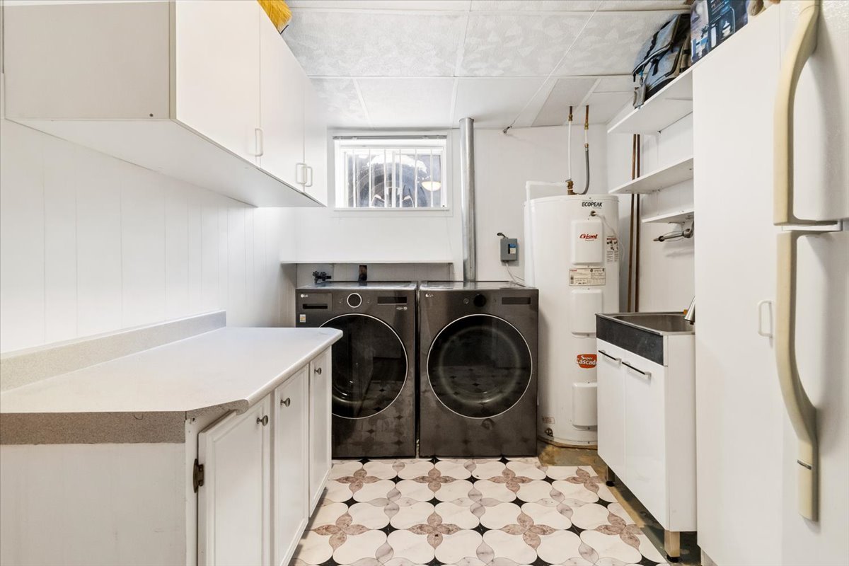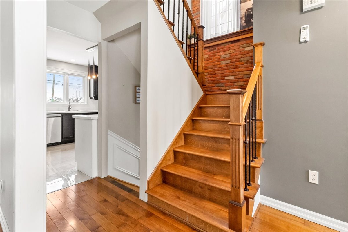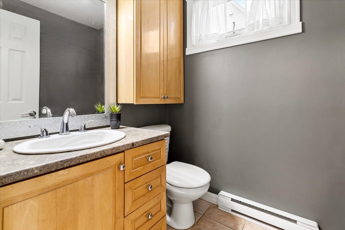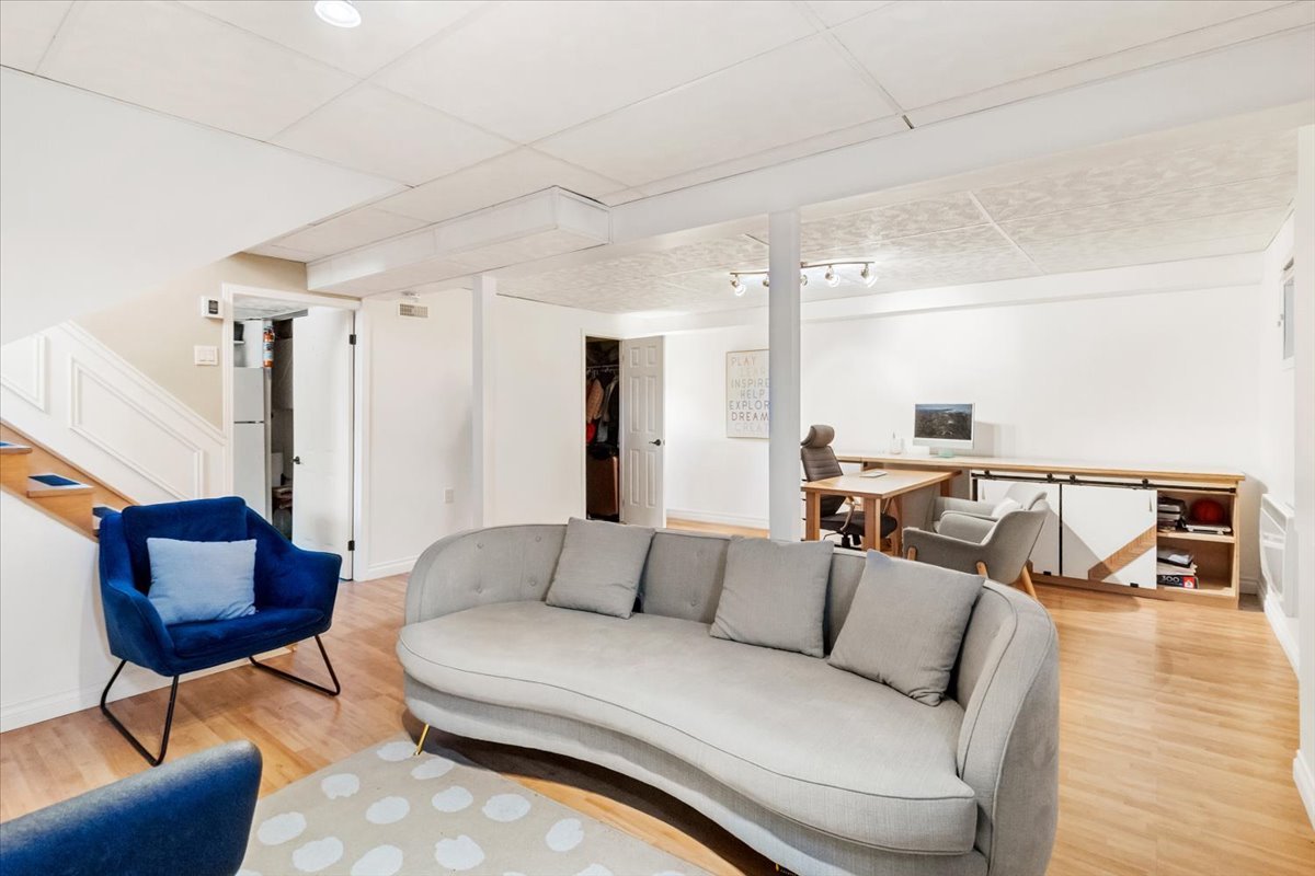 The home offers 3 bedrooms on the upper level, a beautifully finished basement with a large walk-in closet, laundry room, and additional storage. The kitchen features maple cabinets and porcelain flooring, complemented by hardwood floors on the main level and staircase. The bathroom includes heated floors for added comfort.
