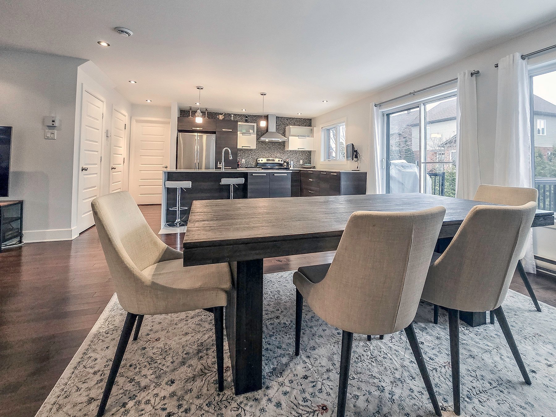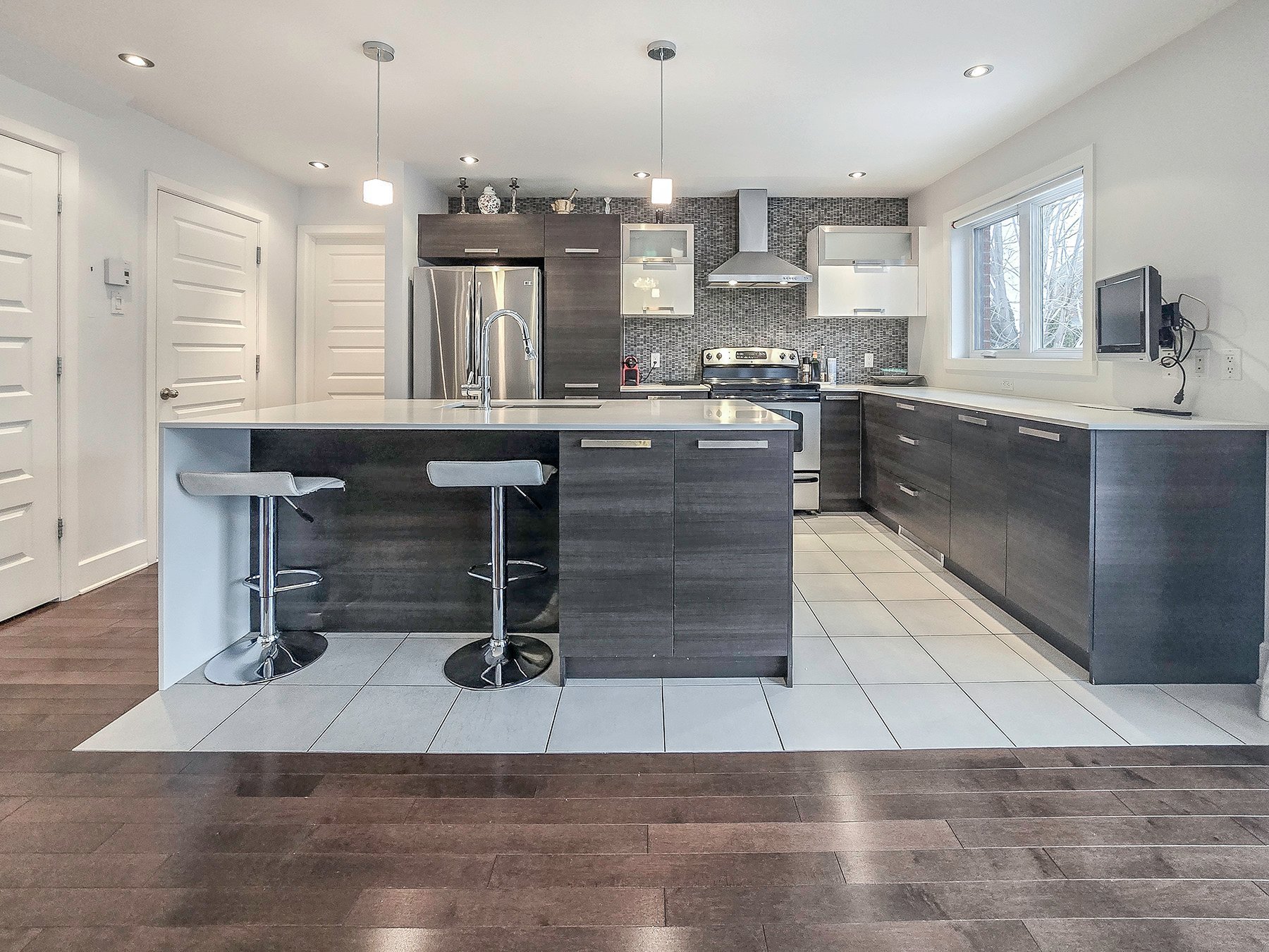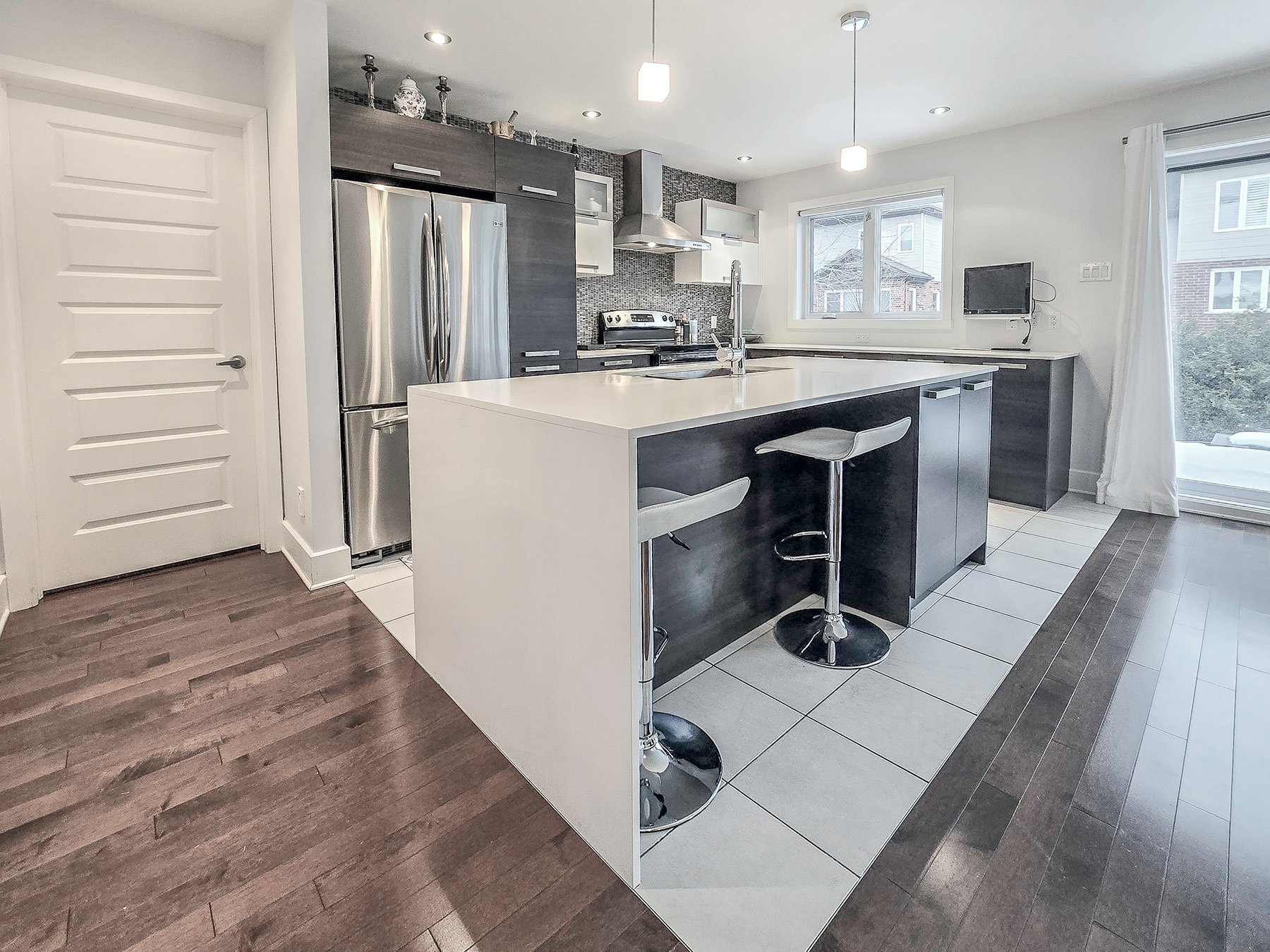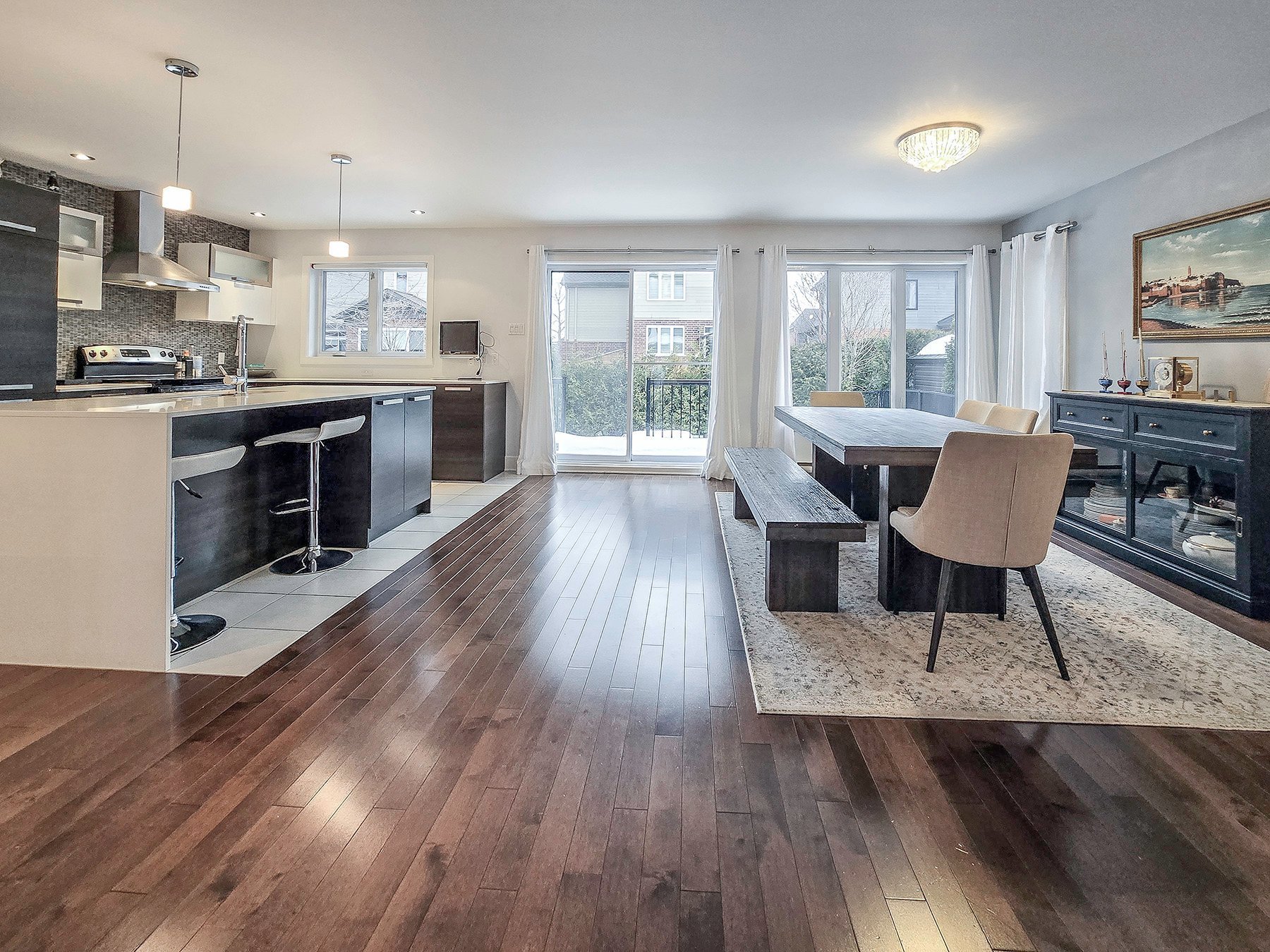 GROUND FLOOREntrance hall with ceramic tiles.Open concept living room to the dining room, wood floor.Bright dining room, access to the backyard through its patio door.Kitchen with Quartz counter, ceramic backsplash, large island with double undermount sink, anti-shock drawers.Powder room with decorative ceramic wall, and adjacent closed laundry room.