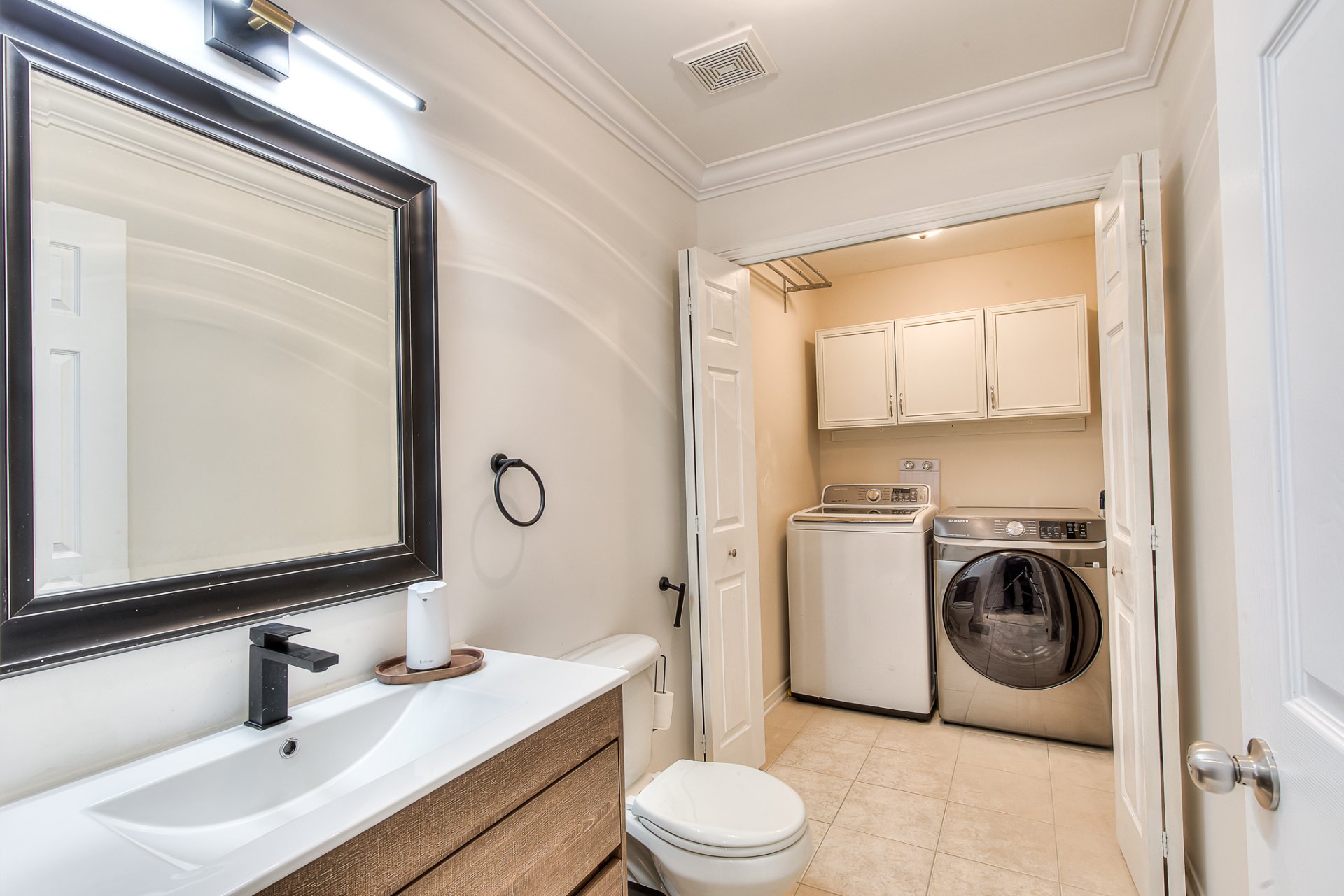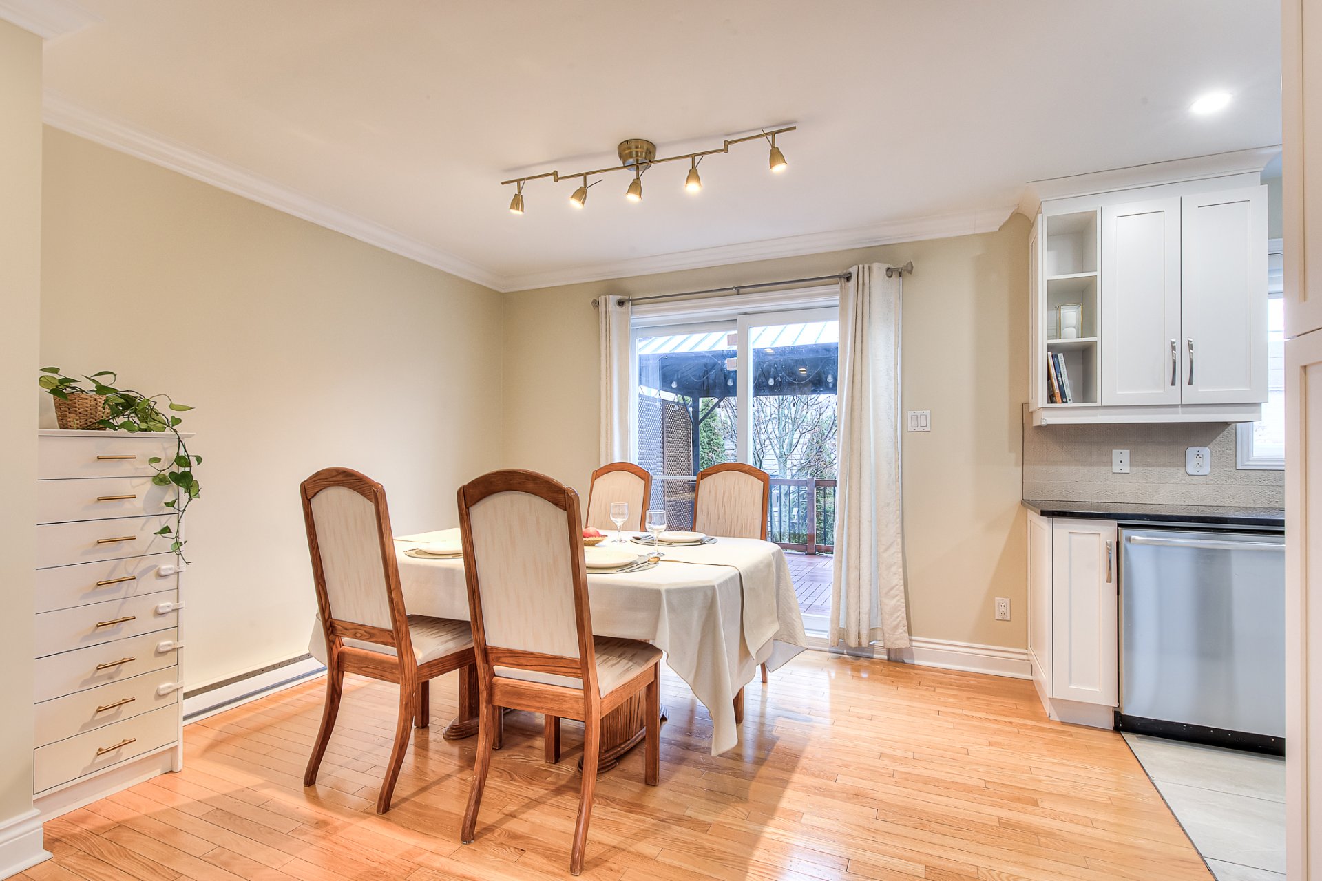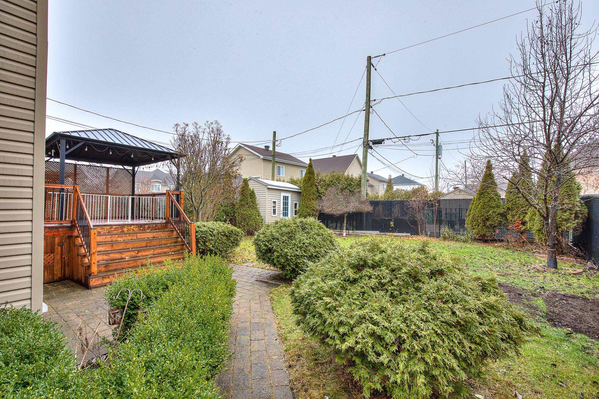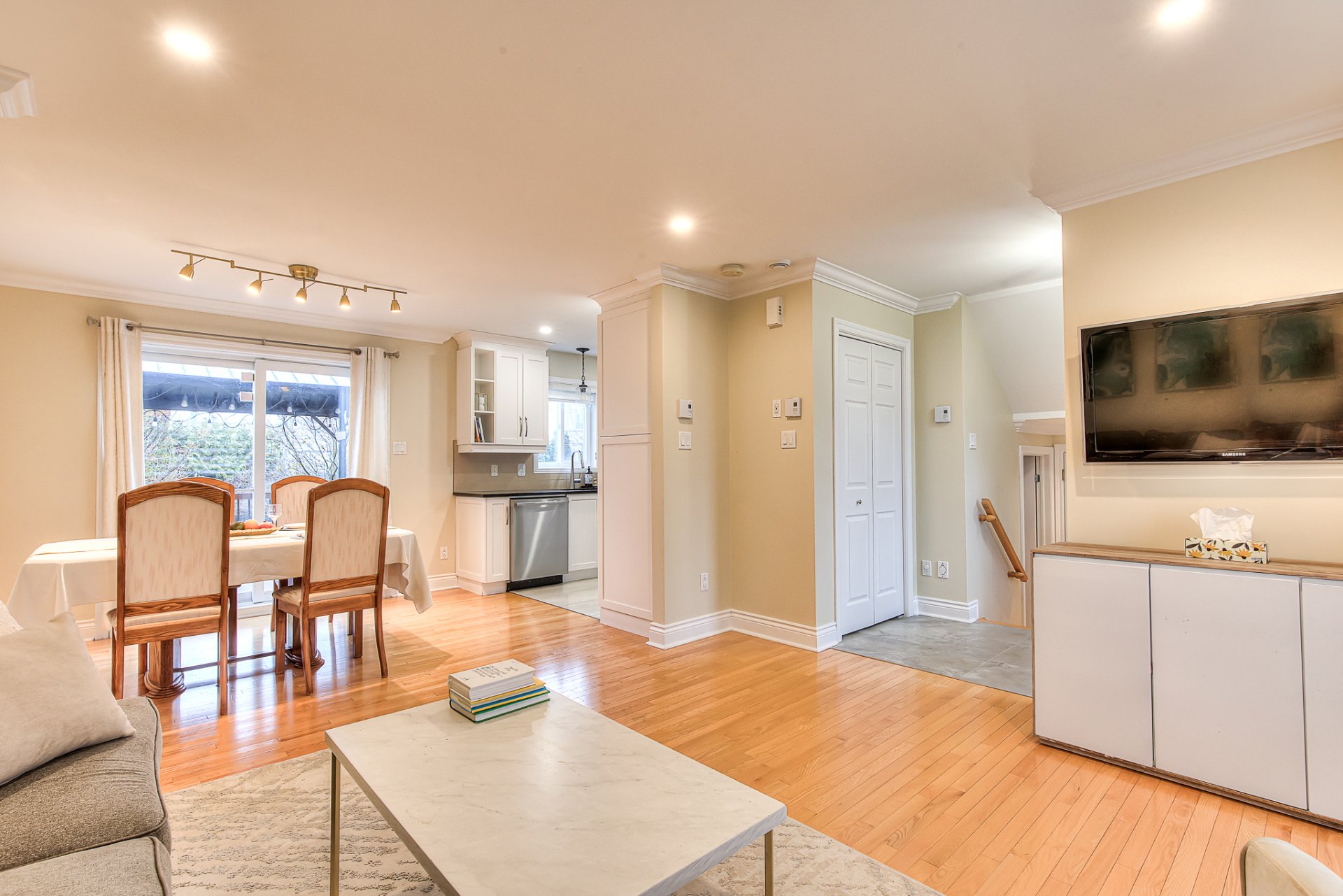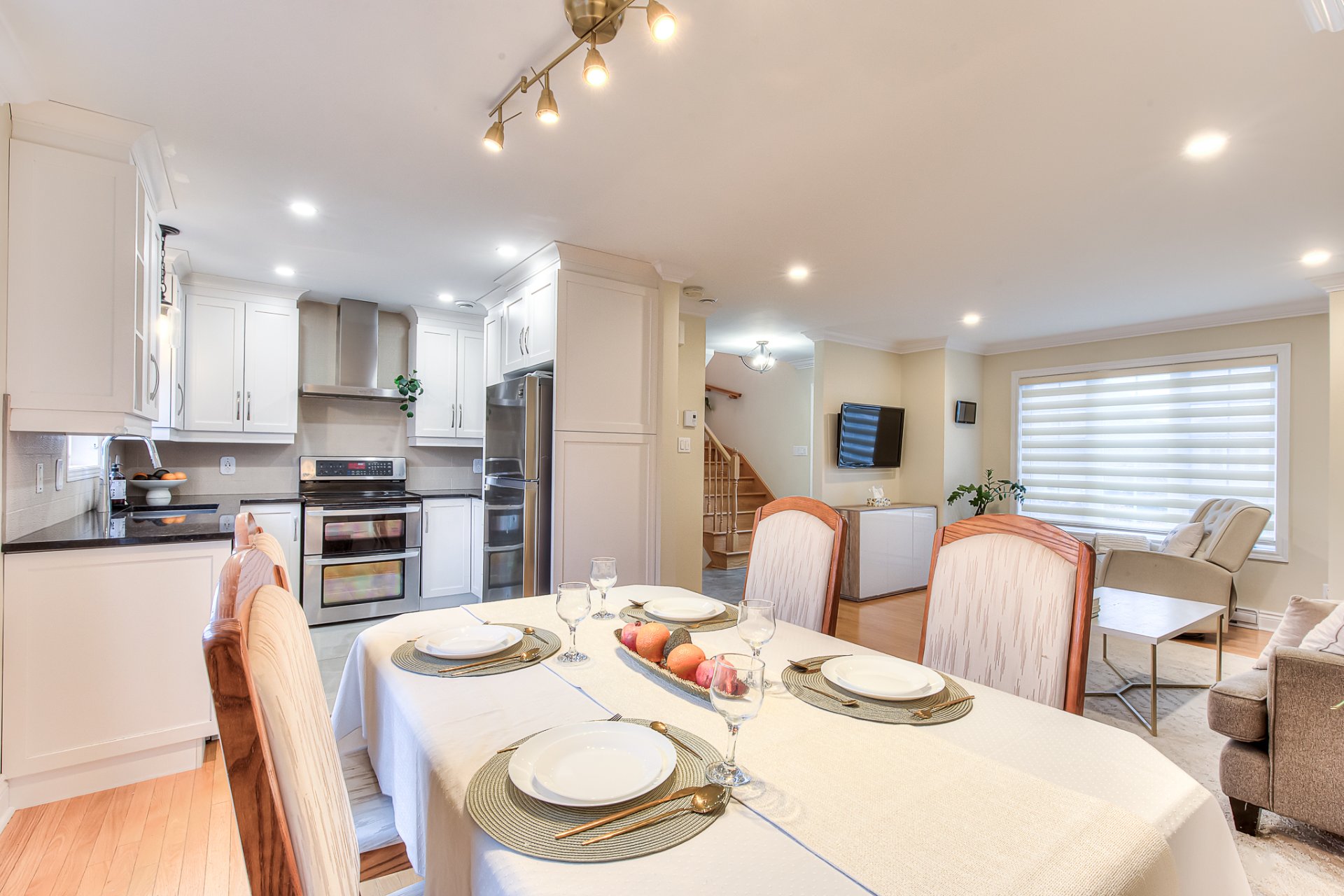 The main floor features a warm and open living and dining area and a practical powder room with laundry. Step outside to a private backyard designed for relaxation, gatherings and peaceful summer evenings.