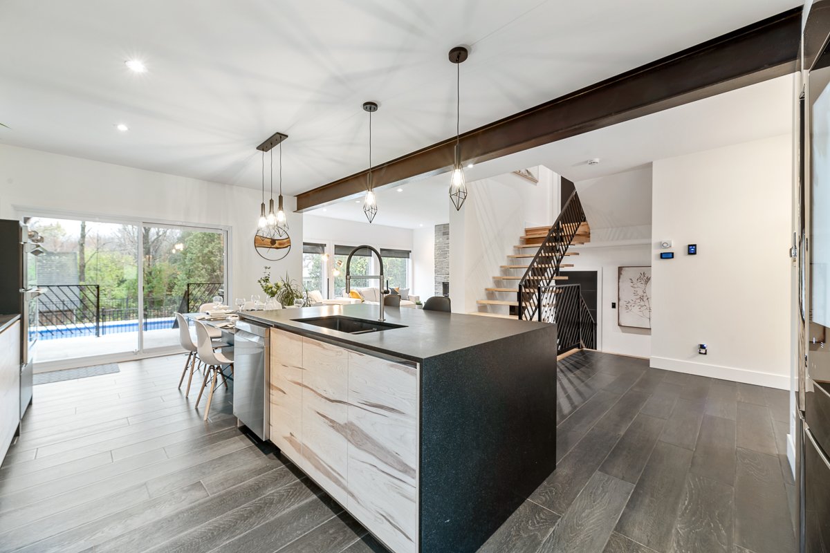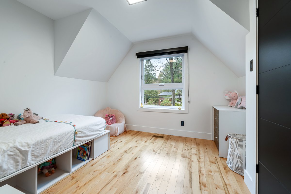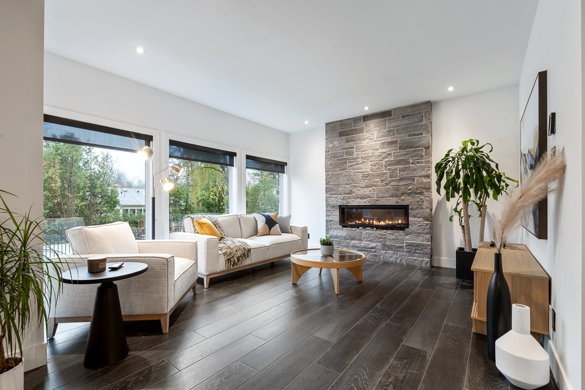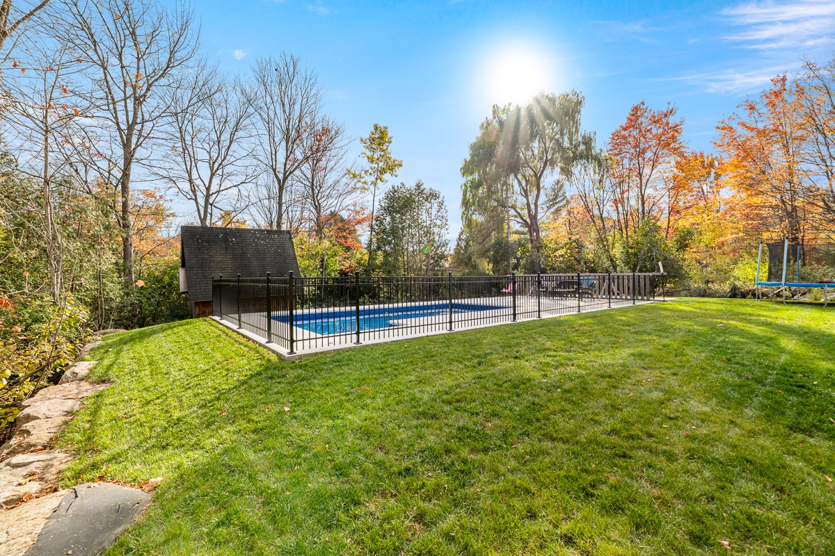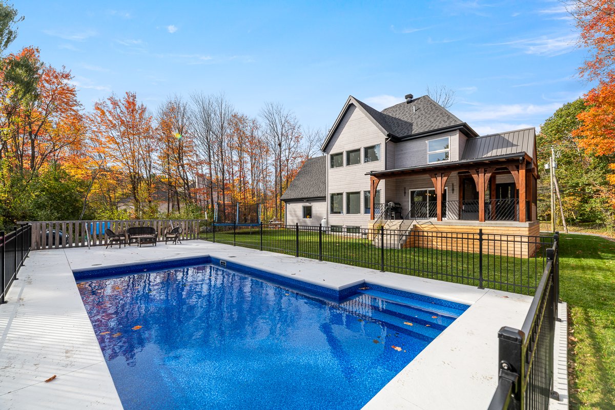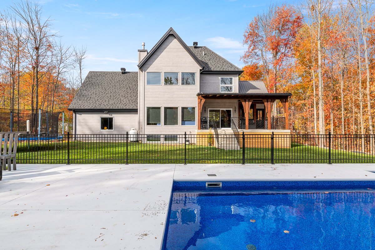 This elegant 2019 custom-built home offers refined design and comfort. The main level is ideal for entertaining or family living, featuring an oversized island, propane fireplace, heated floors, and an adjoining three-season sunroom. The second floor offers three bedrooms and two full bathrooms. The spacious primary suite includes a custom walk-in closet and a luxurious ensuite with heated floors and a soaker tub. The bright finished basement adds a fourth bedroom, full bathroom, and family room with heated floors throughout. The landscaped yard includes a heated, fenced saltwater pool. A large attached two-car garage completes this home.