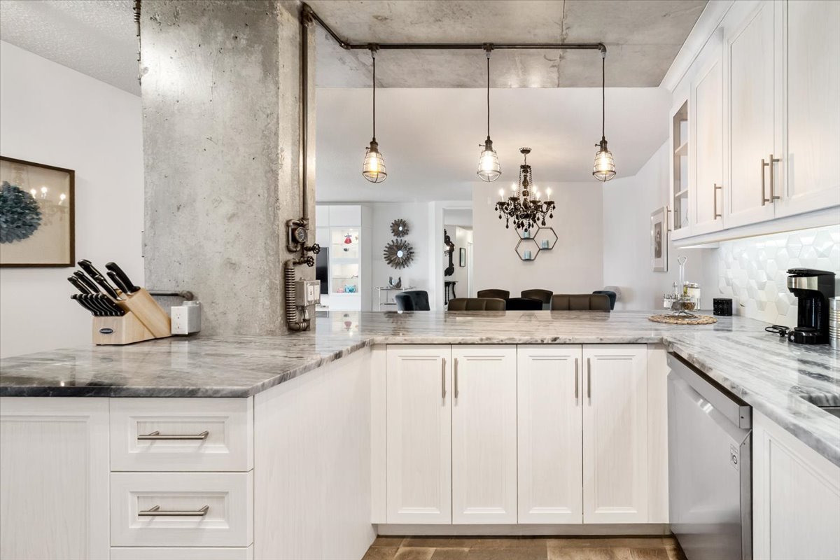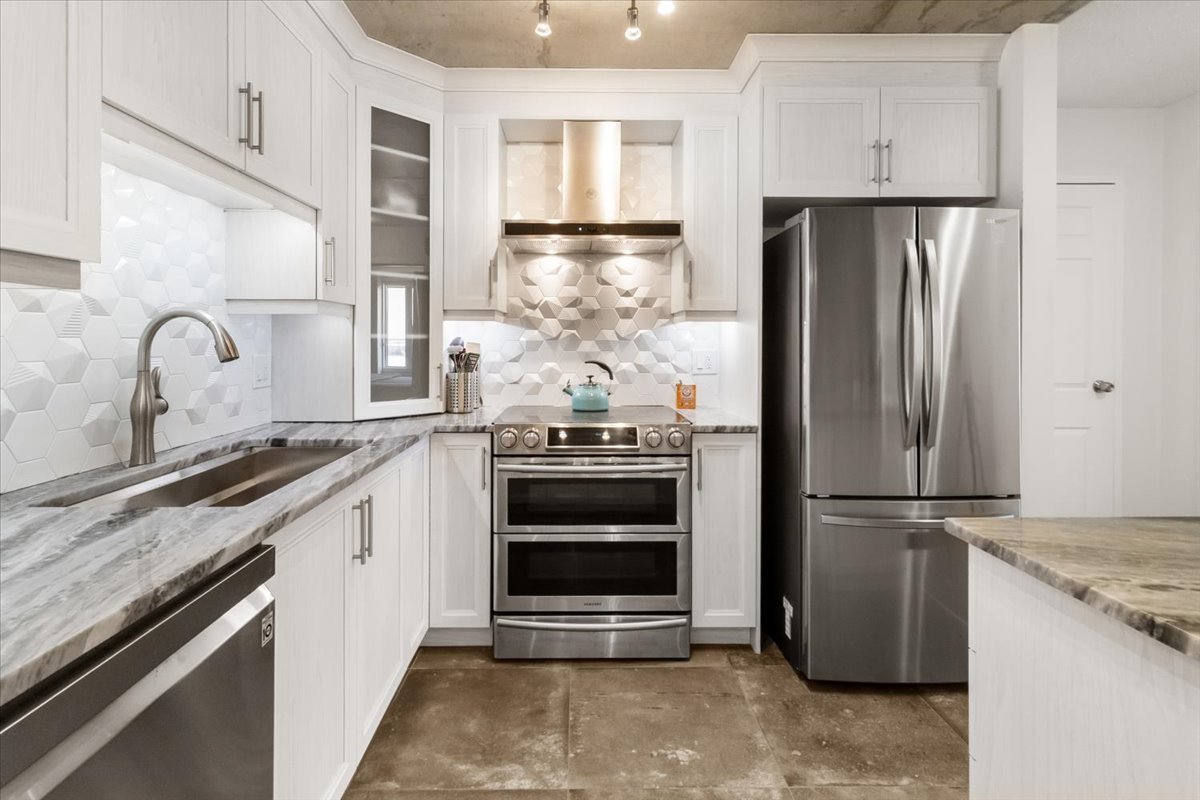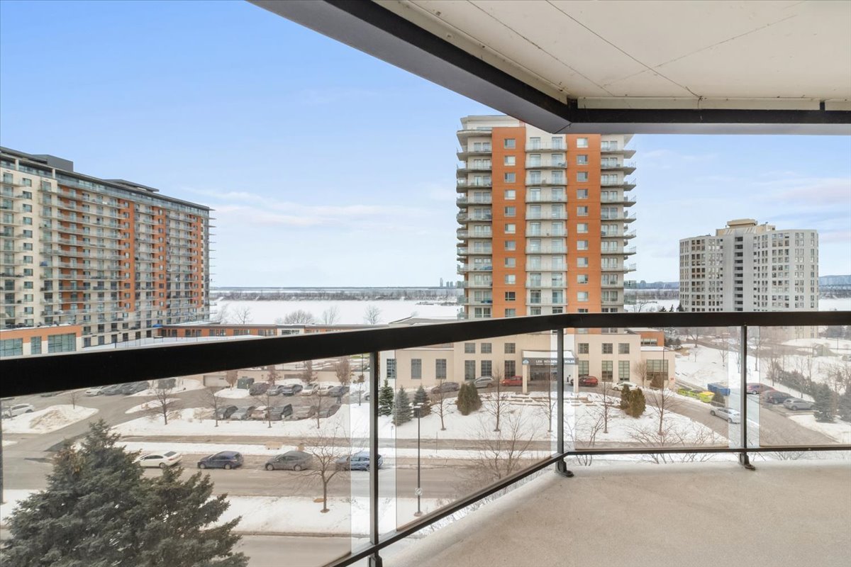 Completely renovated top-floor condo ideally located in Brossard, in a well-maintained building with excellent amenities. Enjoy a balcony with beautiful water views and a bright, open living area flowing into the dining room and a recently renovated kitchen with custom cabinetry, ample storage and heated floors. Features a spacious primary bedroom with large closet, a good-size second bedroom, and a large bathroom with separate shower and soaker tub. Includes an oversized garage space on the main level, a locker, and enjoy an outdoor pool, tennis court, and more!