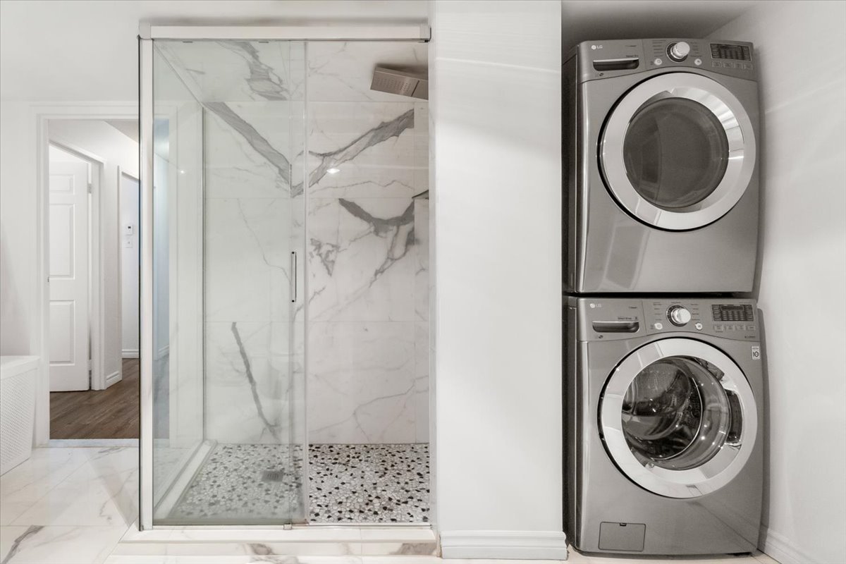 Washer, dryer, fridge, stove, dishwasher, light fixtures, wall unit in living room.
