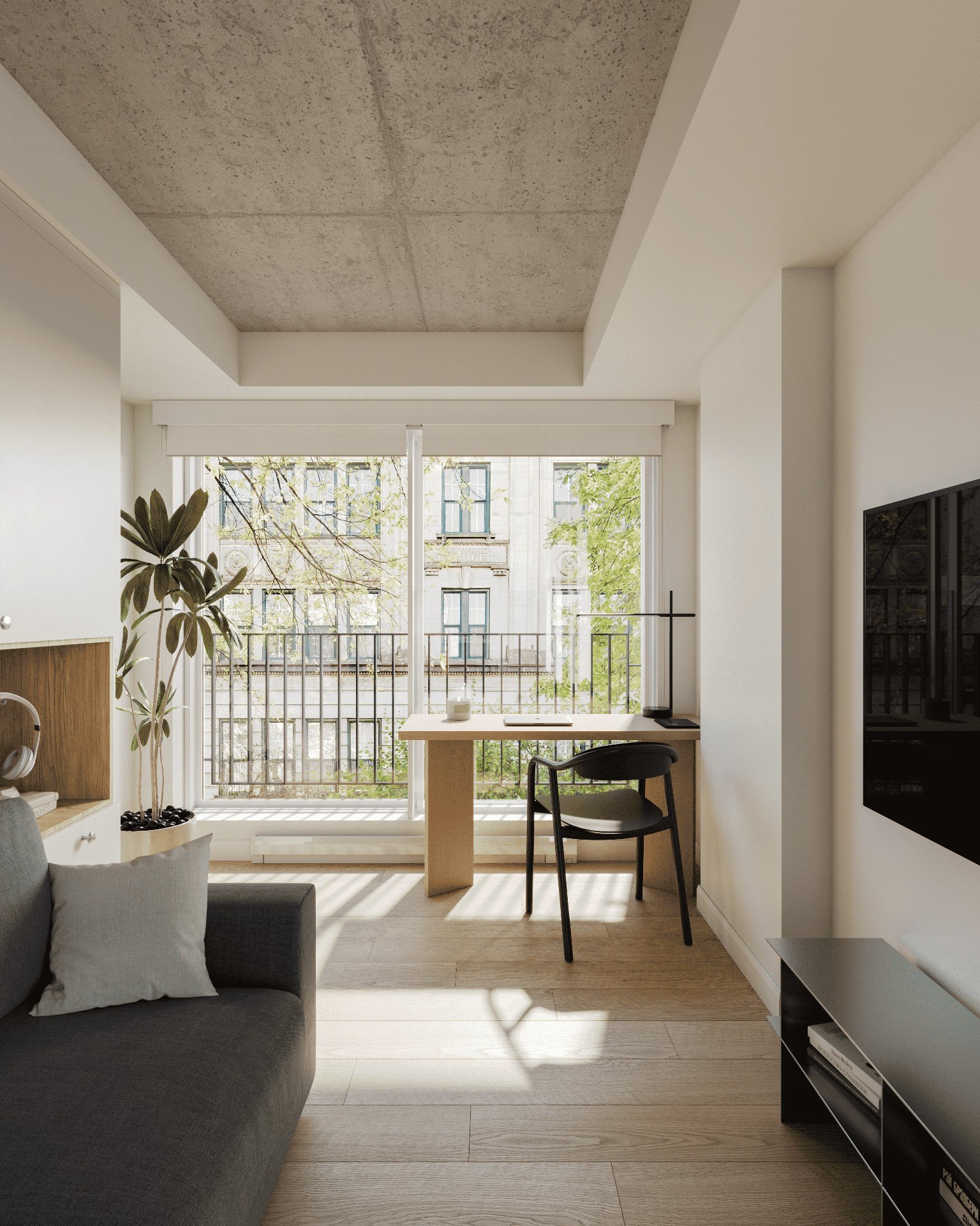 Start your new student life here! Bright, all-inclusive apartments in the heart of Montreal. Study in peace or hang out in the common areas and terrace. Gym, high-speed WiFi, appliances, electricity, heating, and hot water all included. Comfort, style, and a prime location just steps from Concordia, McGill, and HEC -- ready to move in!