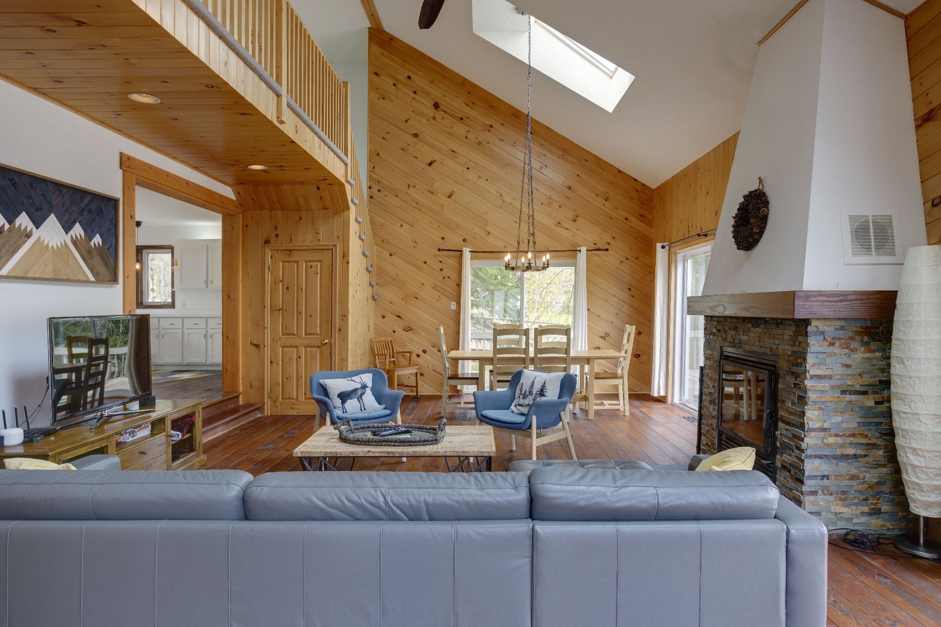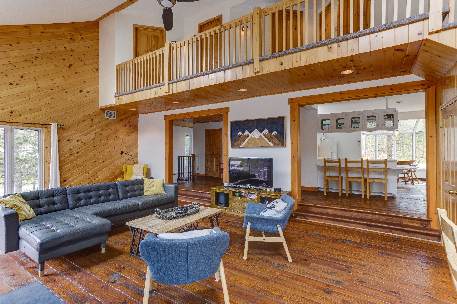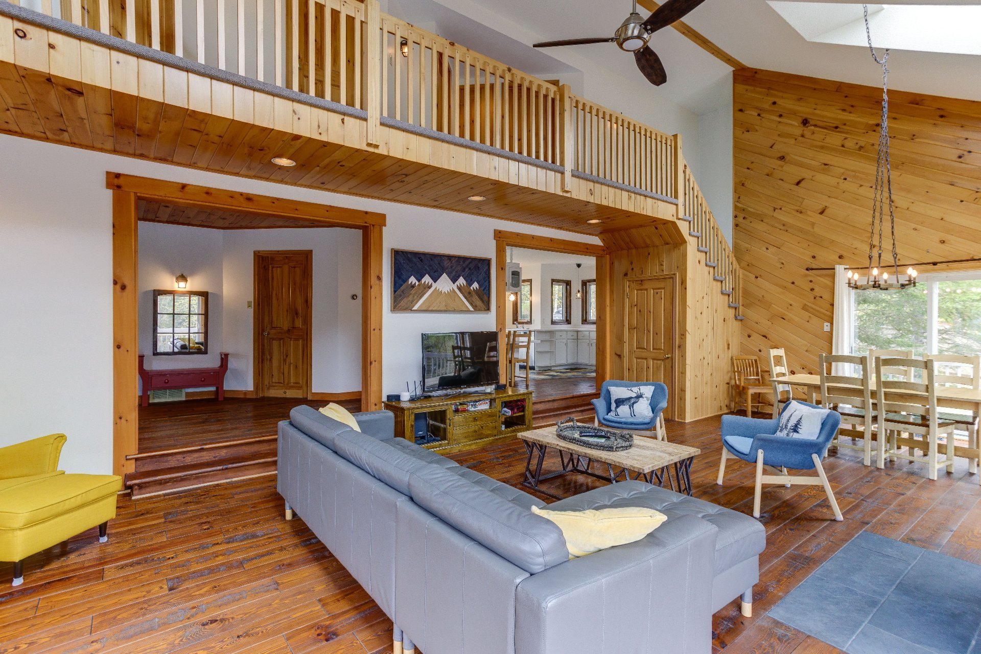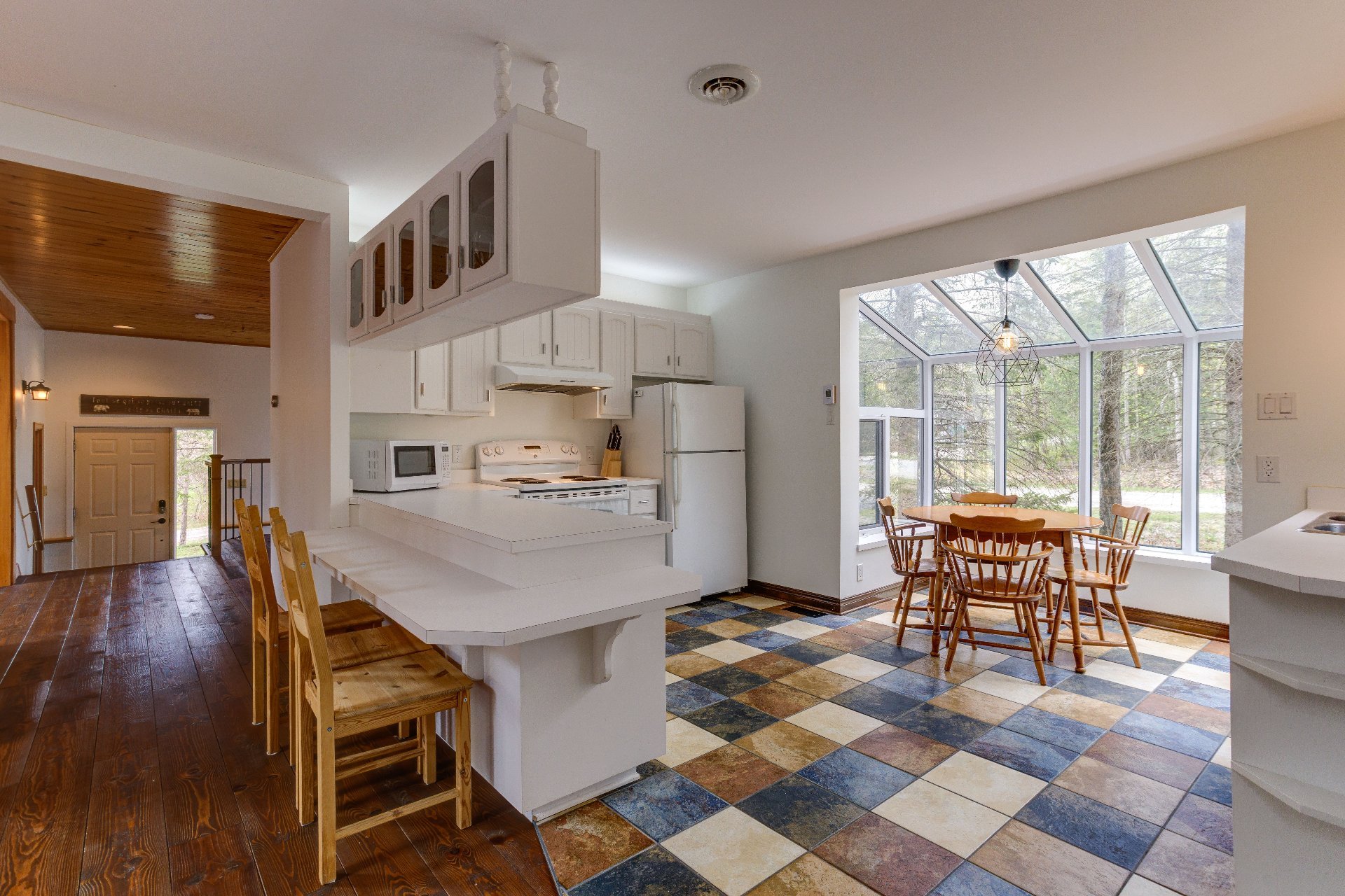 Spacious and inviting home in Eastman with access to Lac Stukely! This bright, welcoming residence features a generous living room with a wood-burning fireplace and soaring cathedral ceilings. Offering 3 bedrooms and 3 bathrooms, plus a finished basement. Home is perfect for hosting friends and family. Enjoy two big balconies ideal for relaxing or entertaining. Nestled on a private 30,000 sq. ft. lot with notarized access to Lac Stukely, and just minutes from Parc national du Mont-Orford.