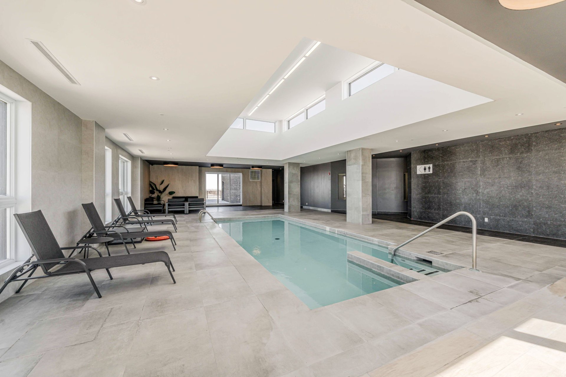 The building features a selection of thoughtfully designed common areas to enhance your daily life. Unwind in the elegant heated indoor pool, perfect for year-round relaxation. Take in the breathtaking panoramic views from the expansive rooftop terrace -- an ideal spot for socializing or simply recharging. Stay active in the fully equipped fitness center without ever leaving the comfort of home. The spacious and refined common lounge becomes a natural extension of your living space -- ideal for working, hosting, or relaxing.