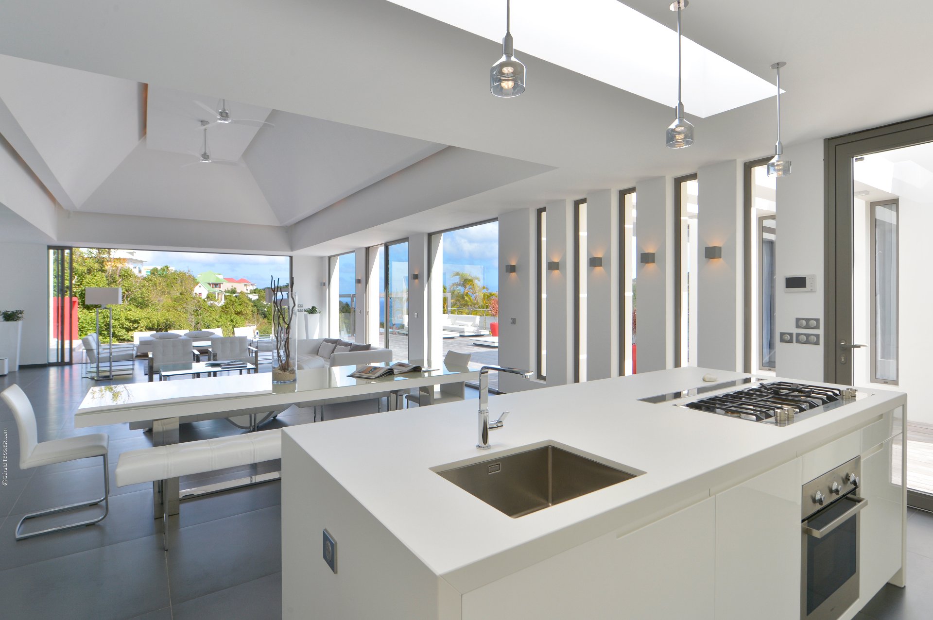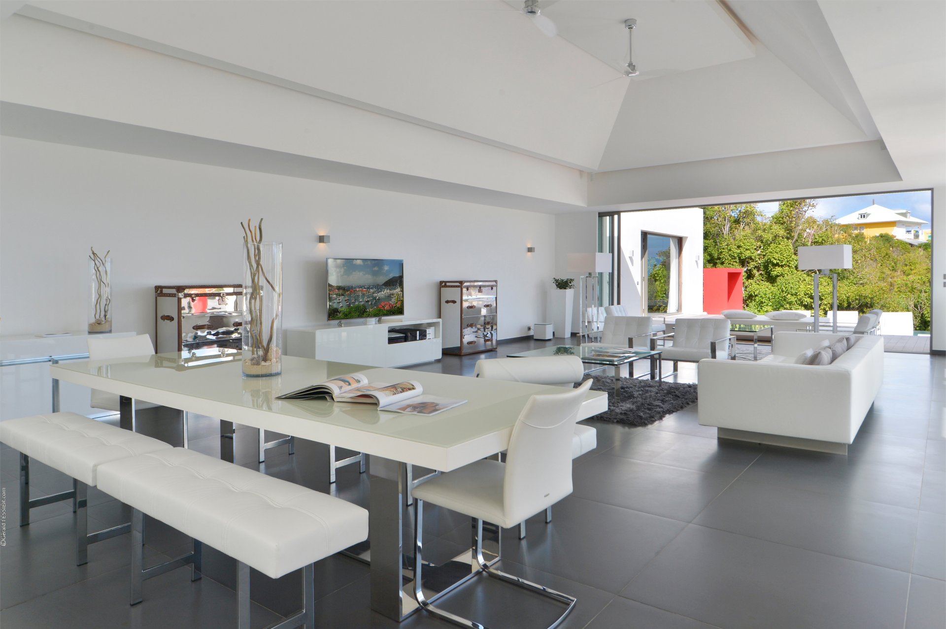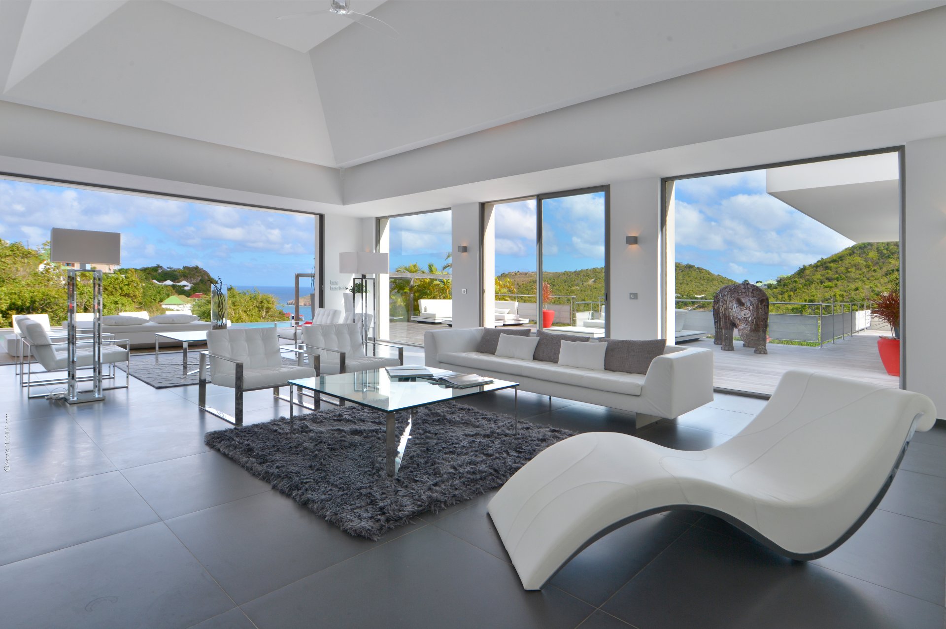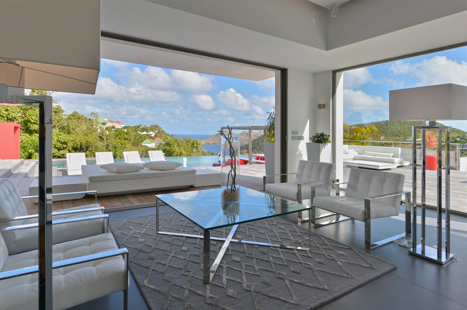 The interior showcases a modern design with open spaces, highlighted by large glass doors and windows that frame stunning ocean views, complemented by sleek dark flooring and elegant white leather furnishings. The gourmet kitchen features a minimalist white island and high-end appliances, ideal for culinary enthusiasts. Outdoors, an infinity pool and hot tub provide unobstructed ocean vistas, surrounded by lush greenery and rolling hills. The outdoor area includes a stylish pergola with a dining setup, perfect for entertaining, enhanced by contemporary white seating and subtle red accents. This villa seamlessly blends indoor comfort with outdoor serenity, making it an ideal retreat for those seeking luxury in Saint-Barthélemy.
