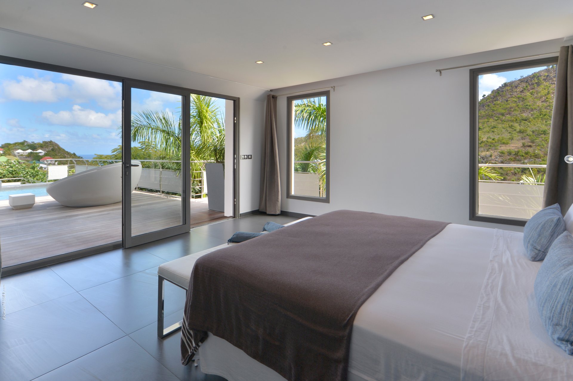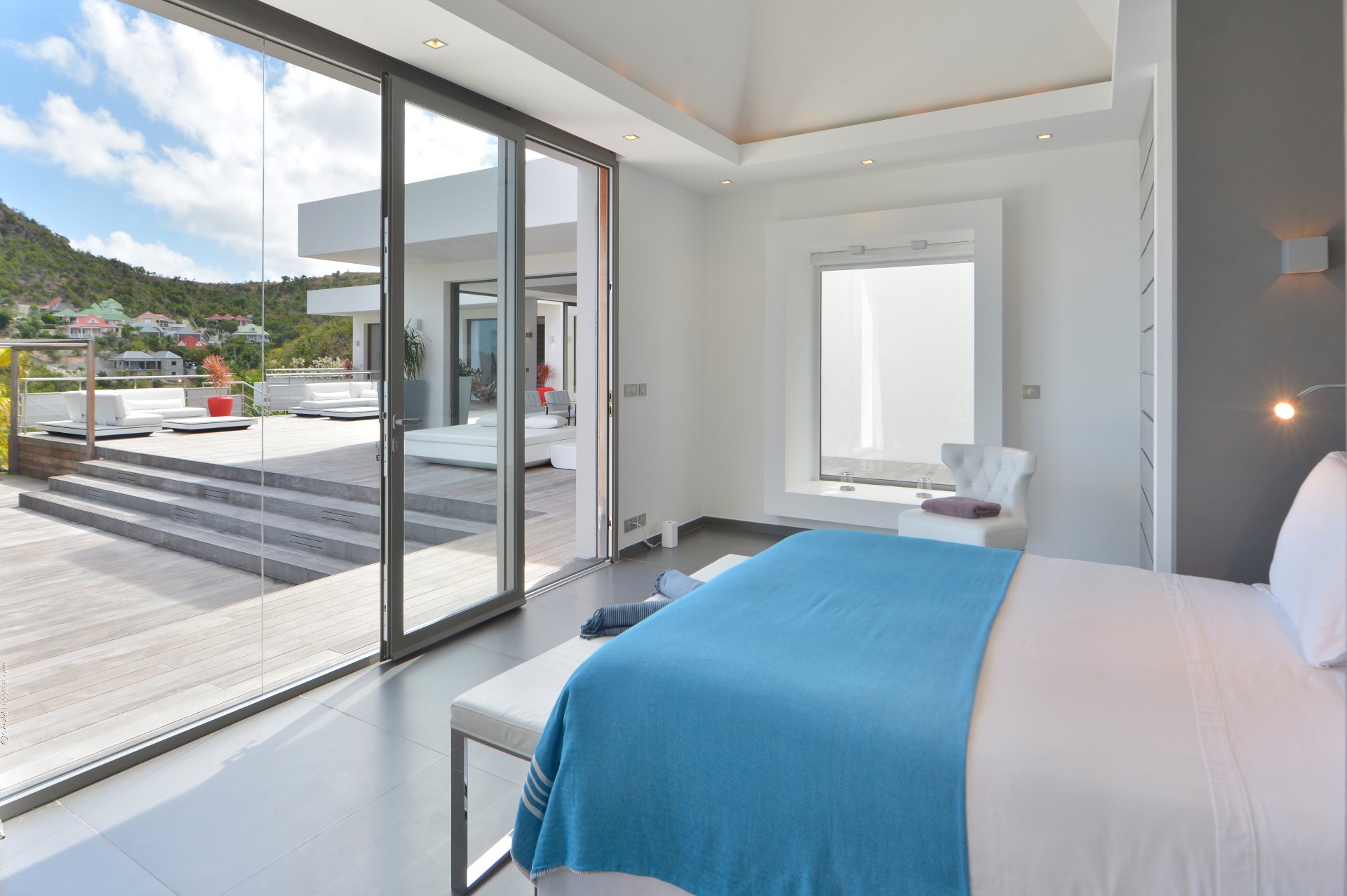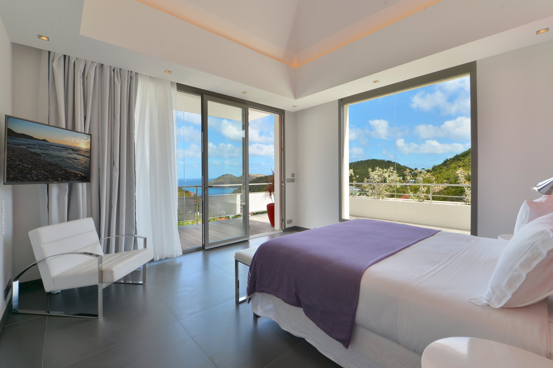 The interior showcases a modern design with open spaces, highlighted by large glass doors and windows that frame stunning ocean views, complemented by sleek dark flooring and elegant white leather furnishings. The gourmet kitchen features a minimalist white island and high-end appliances, ideal for culinary enthusiasts. Outdoors, an infinity pool and hot tub provide unobstructed ocean vistas, surrounded by lush greenery and rolling hills. The outdoor area includes a stylish pergola with a dining setup, perfect for entertaining, enhanced by contemporary white seating and subtle red accents. This villa seamlessly blends indoor comfort with outdoor serenity, making it an ideal retreat for those seeking luxury in Saint-Barthélemy.