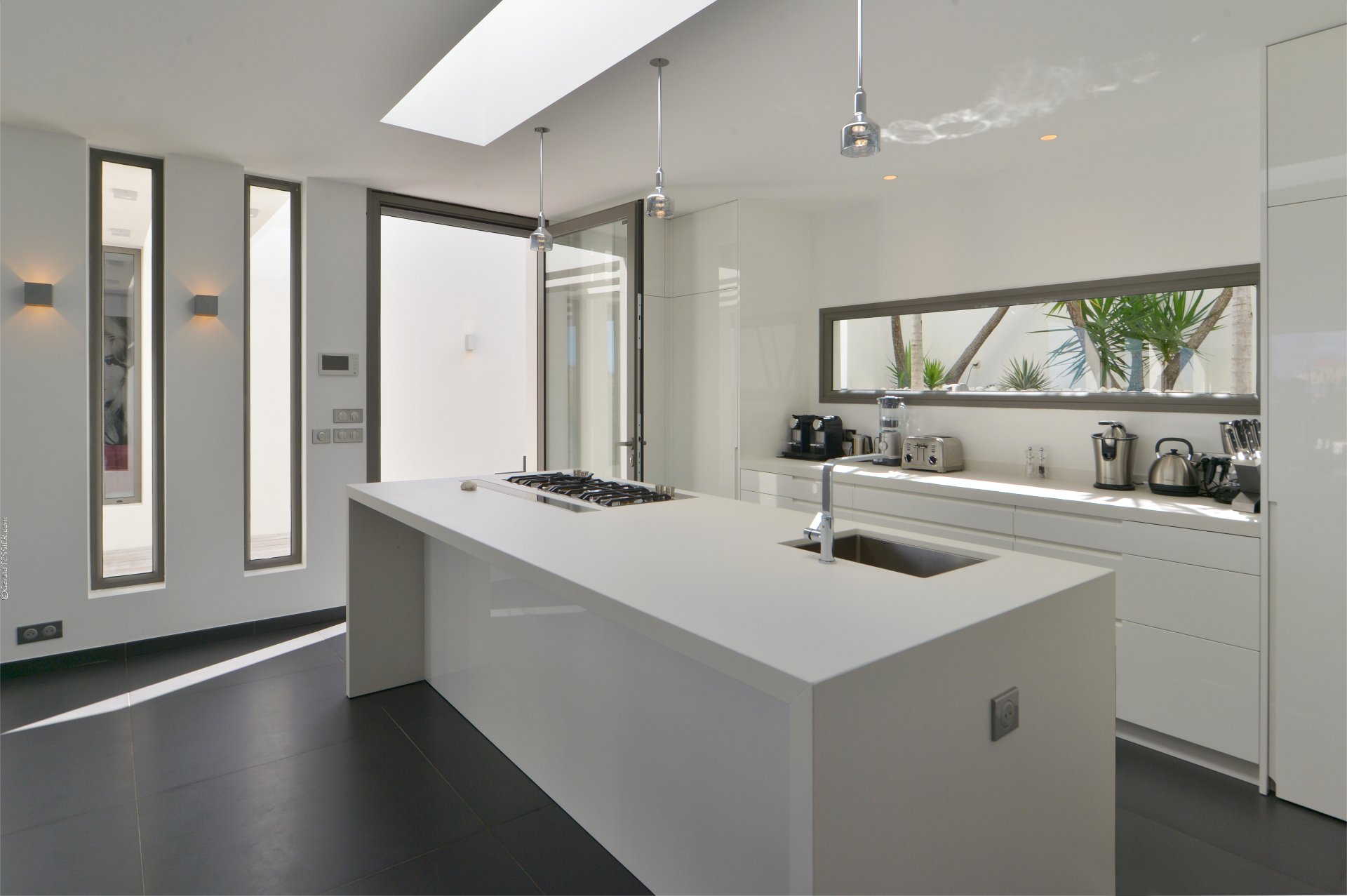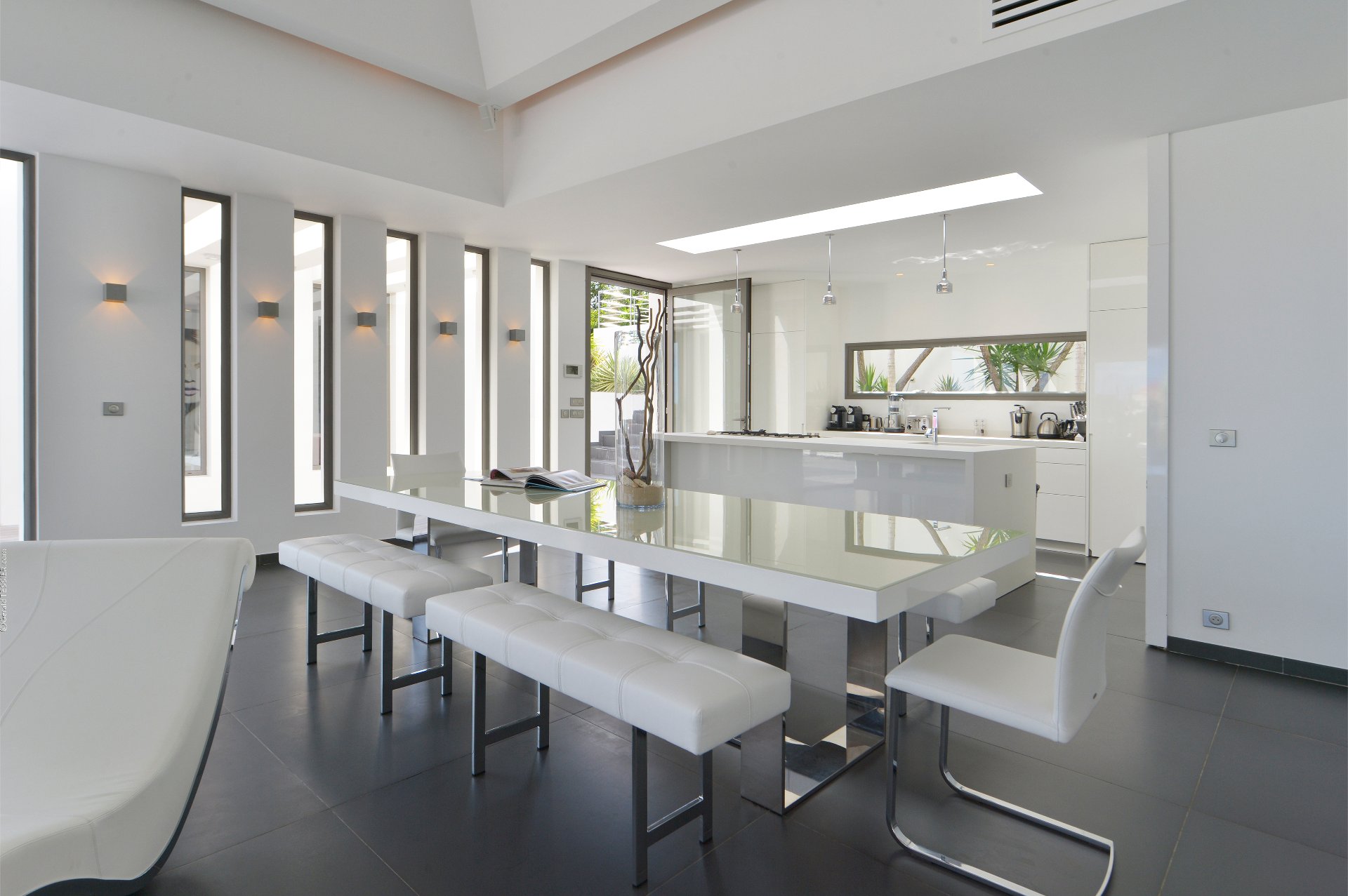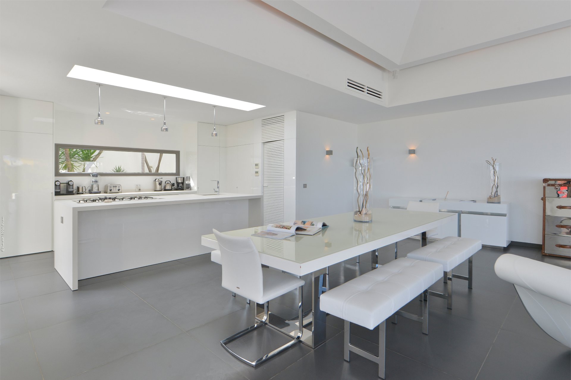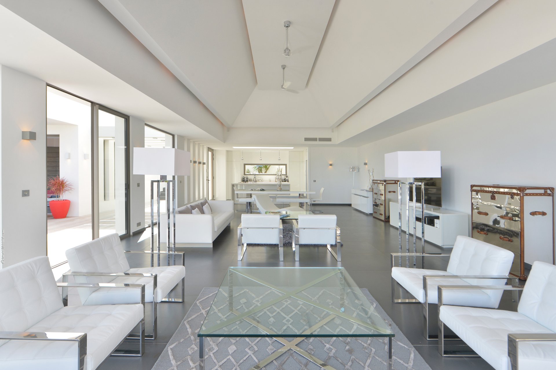 The interior showcases a modern design with open spaces, highlighted by large glass doors and windows that frame stunning ocean views, complemented by sleek dark flooring and elegant white leather furnishings. The gourmet kitchen features a minimalist white island and high-end appliances, ideal for culinary enthusiasts. Outdoors, an infinity pool and hot tub provide unobstructed ocean vistas, surrounded by lush greenery and rolling hills. The outdoor area includes a stylish pergola with a dining setup, perfect for entertaining, enhanced by contemporary white seating and subtle red accents. This villa seamlessly blends indoor comfort with outdoor serenity, making it an ideal retreat for those seeking luxury in Saint-Barthélemy.