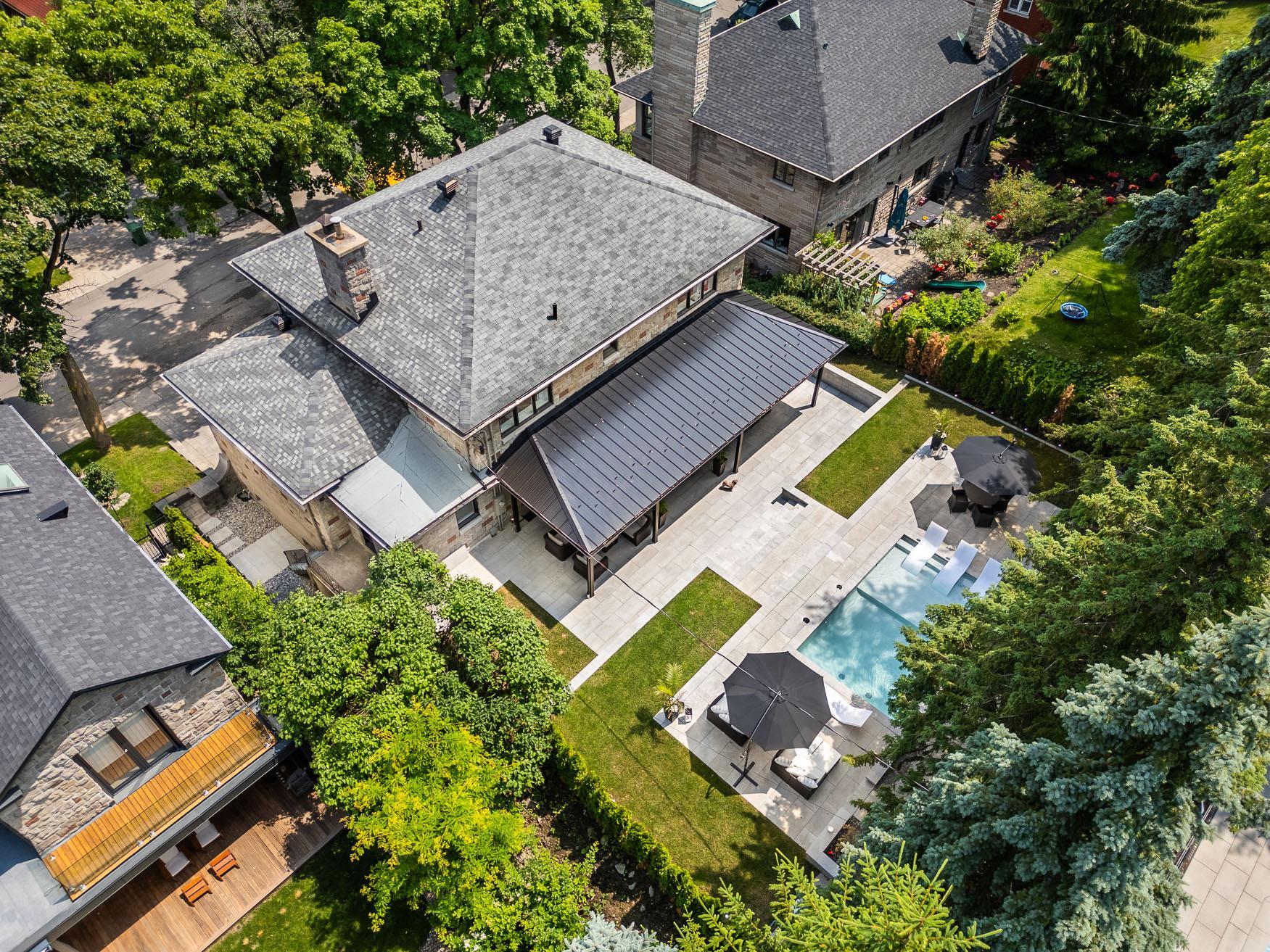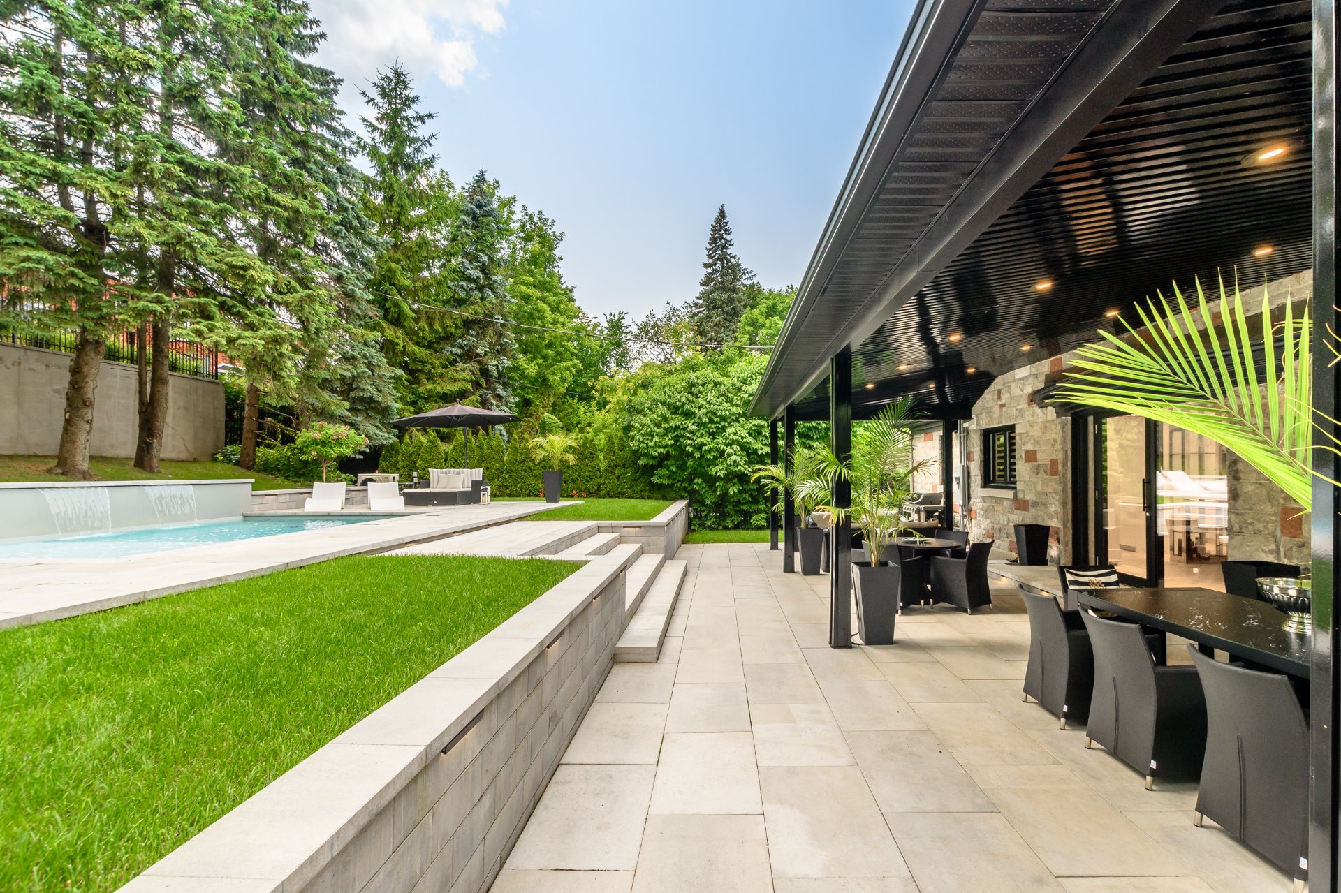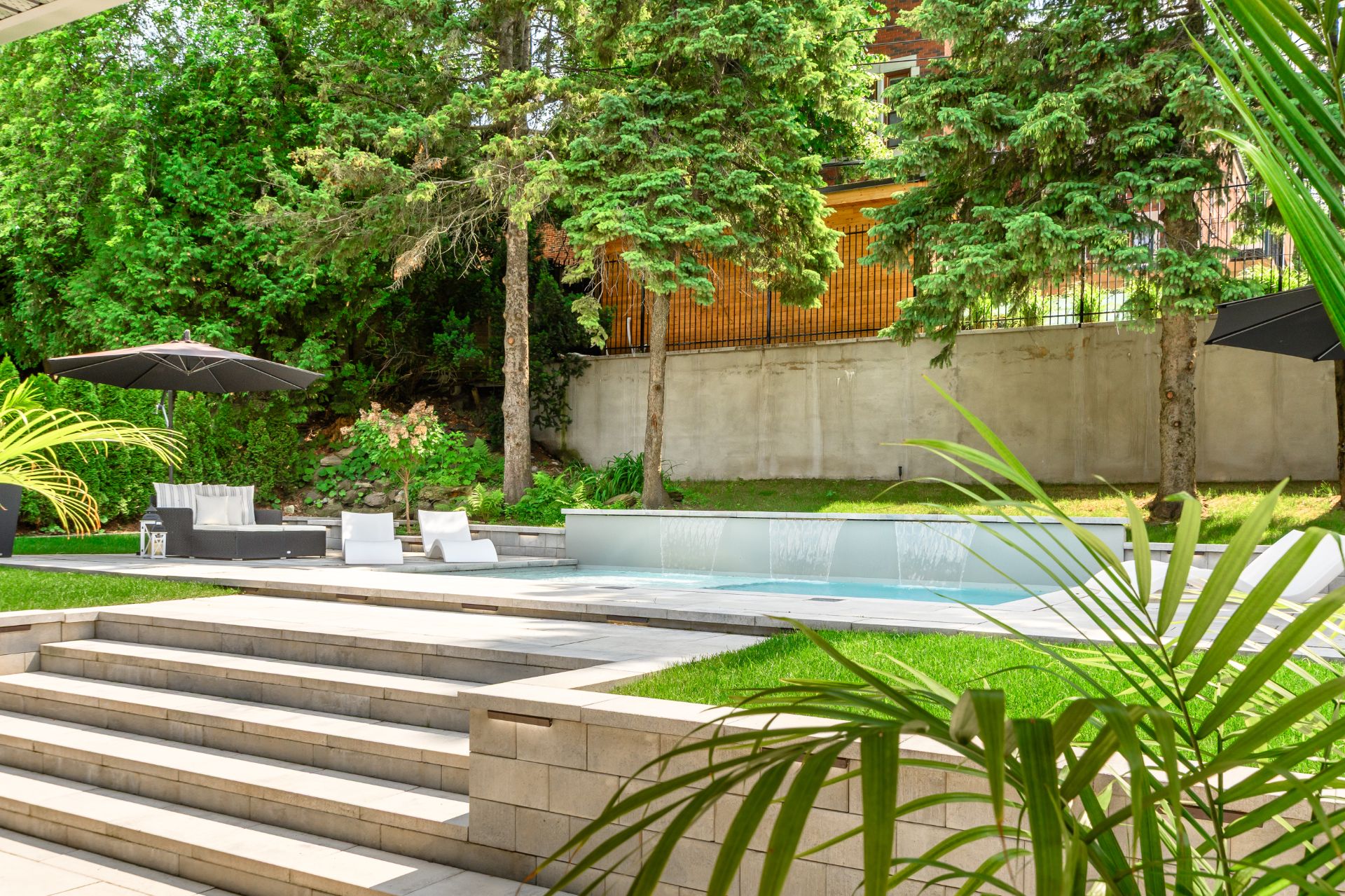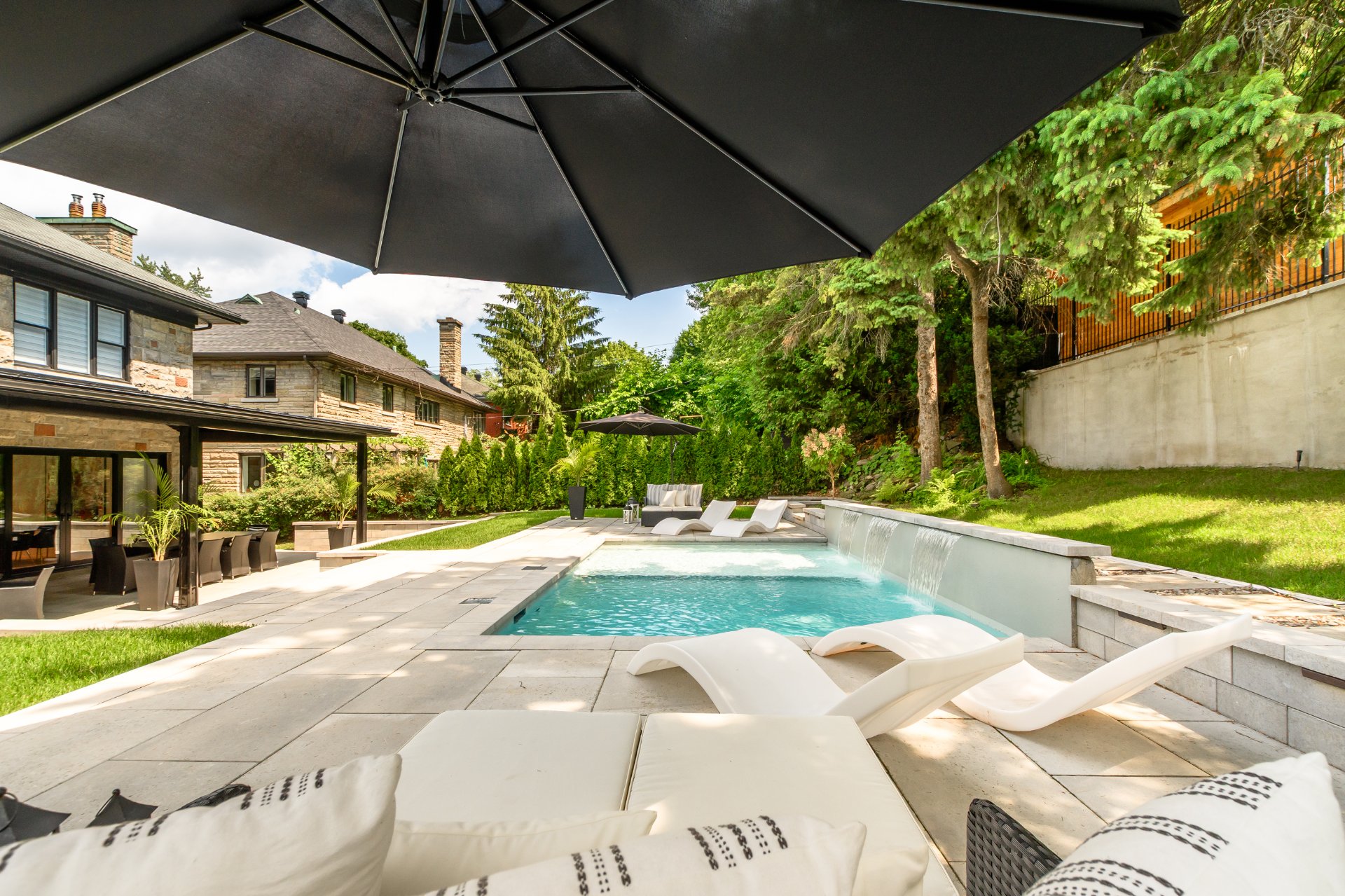 Exterior: Located in prestigious Haut-Outremont on over 10,000 sqft of land, this property’s backyard is strategically oriented to enjoy maximum sunlight throughout the day. The concrete in-ground pool is flanked by two uni-stone terraces, offering a luxurious outdoor experience. A covered terrace provides ample space for both dining and lounging, ideal for entertaining or relaxation.