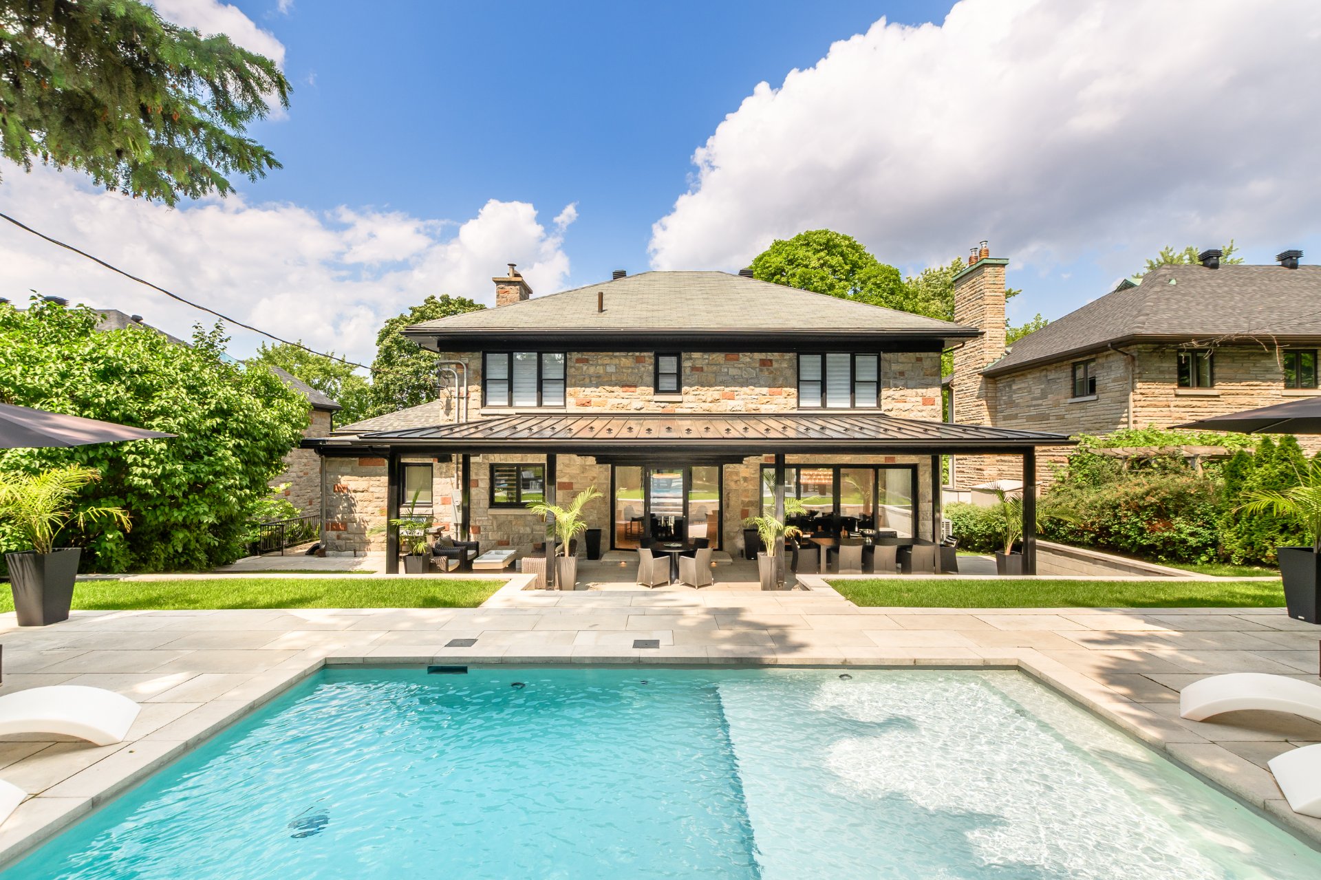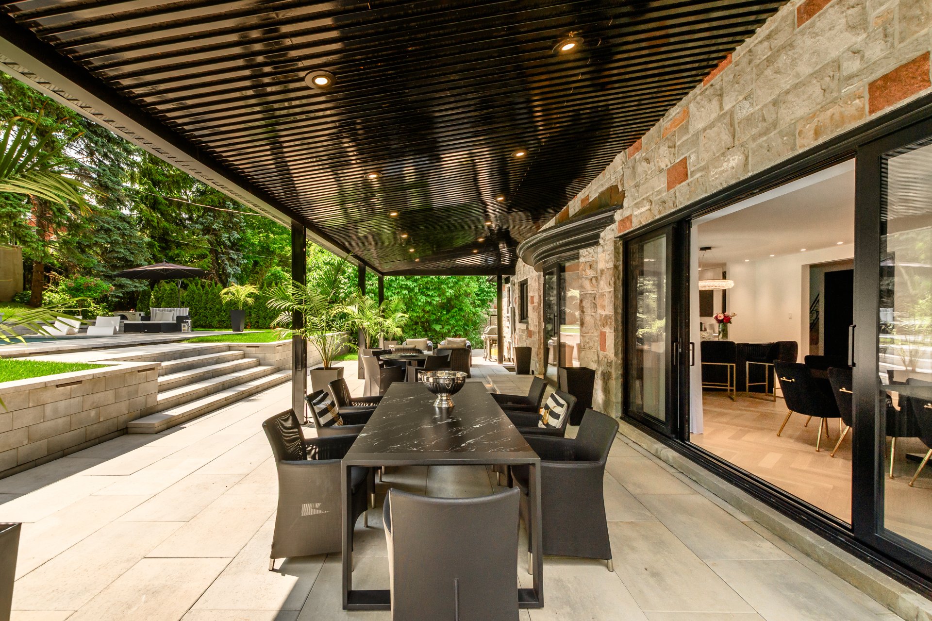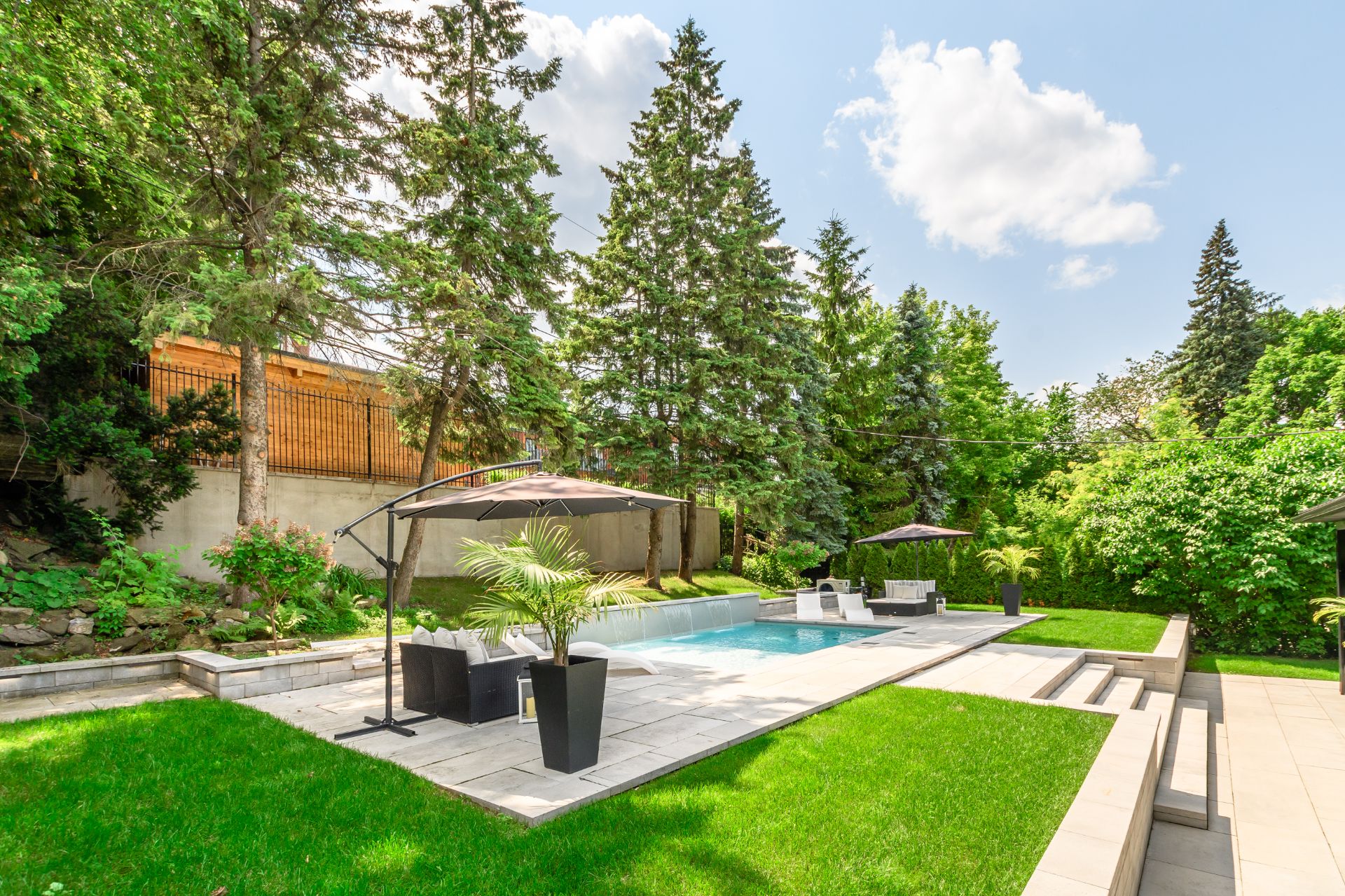 Exterior: Located in prestigious Haut-Outremont on over 10,000 sqft of land, this property’s backyard is strategically oriented to enjoy maximum sunlight throughout the day. The concrete in-ground pool is flanked by two uni-stone terraces, offering a luxurious outdoor experience. A covered terrace provides ample space for both dining and lounging, ideal for entertaining or relaxation.