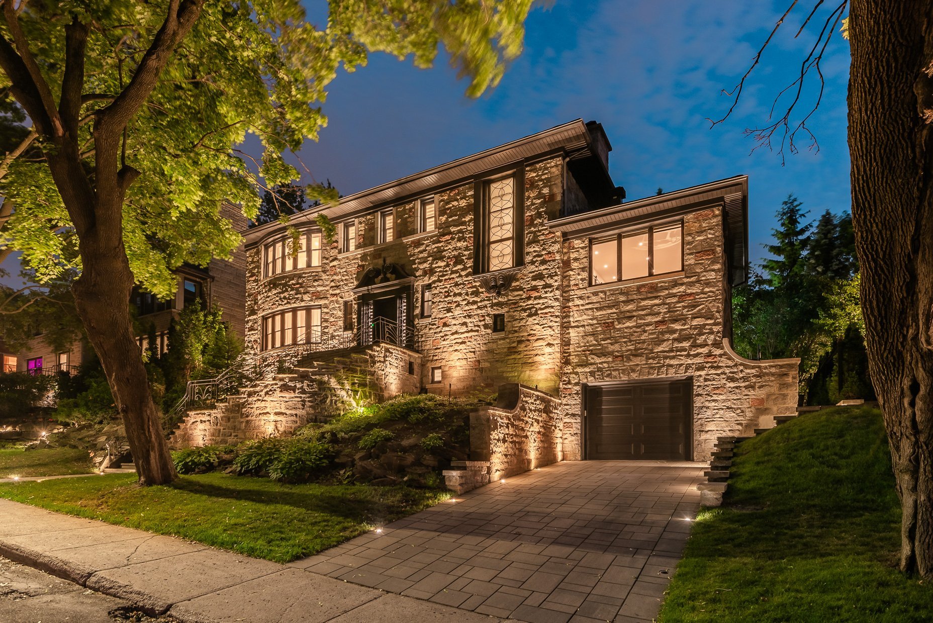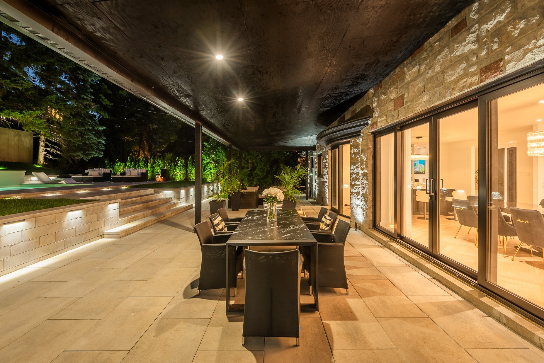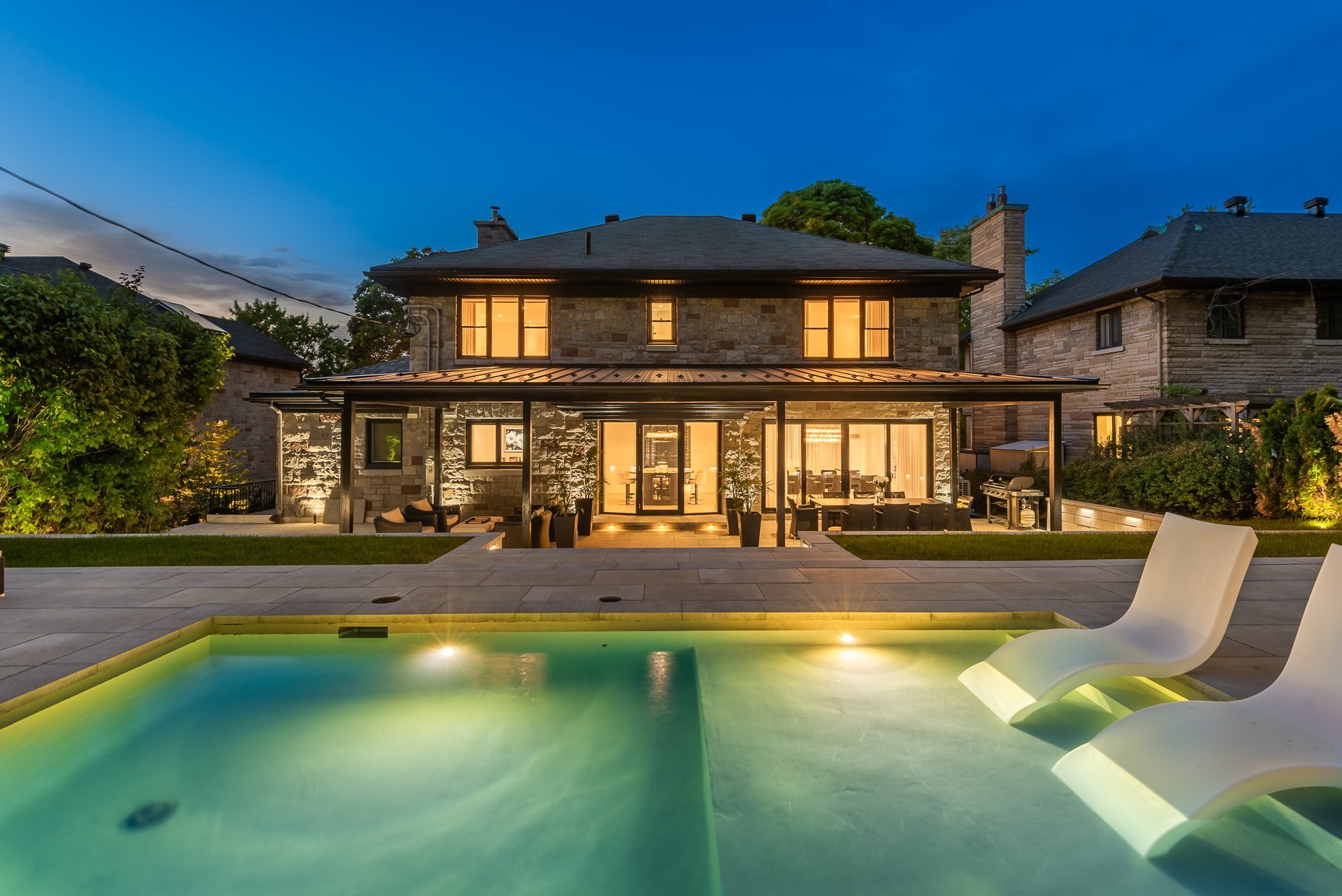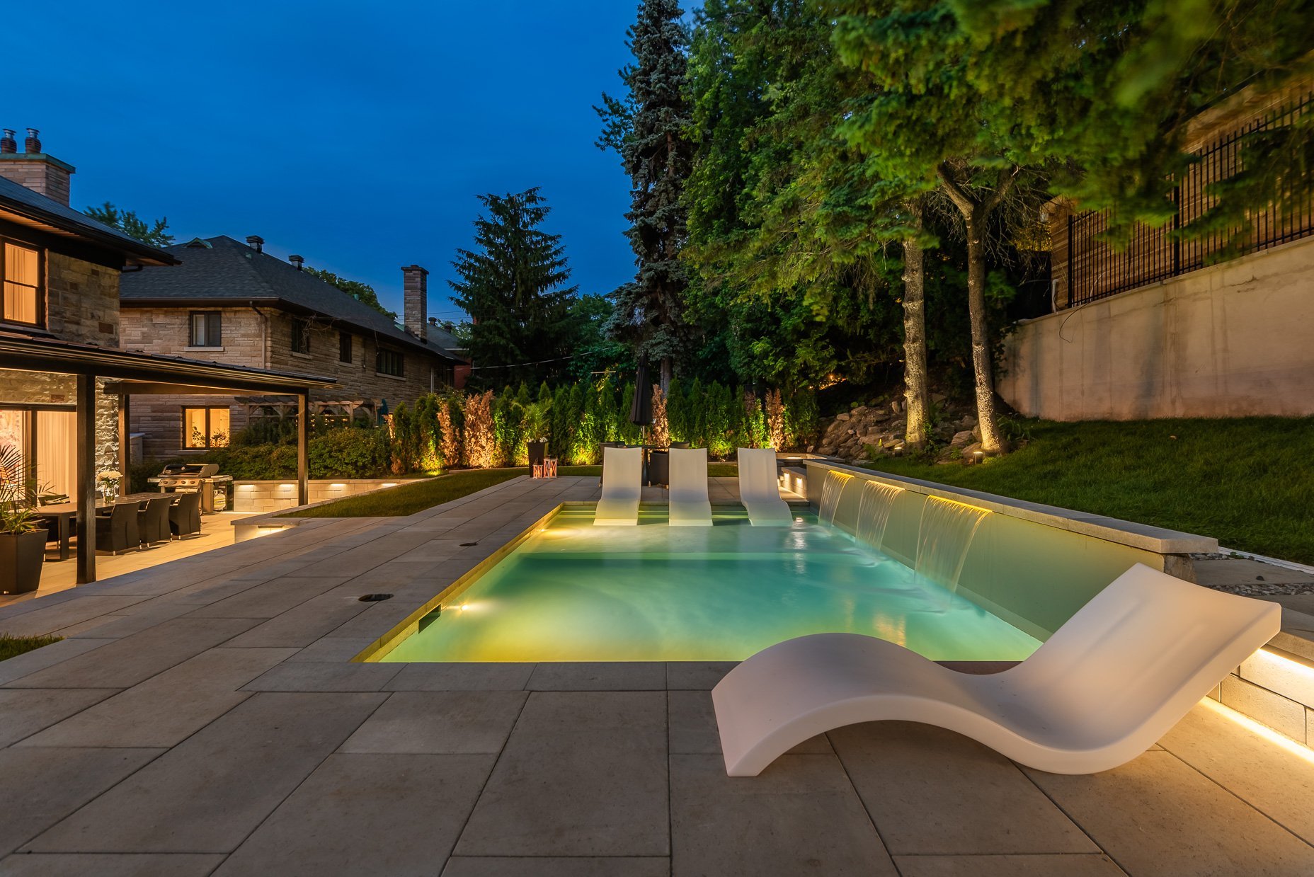 Exterior: Located in prestigious Haut-Outremont on over 10,000 sqft of land, this property’s backyard is strategically oriented to enjoy maximum sunlight throughout the day. The concrete in-ground pool is flanked by two uni-stone terraces, offering a luxurious outdoor experience. A covered terrace provides ample space for both dining and lounging, ideal for entertaining or relaxation.