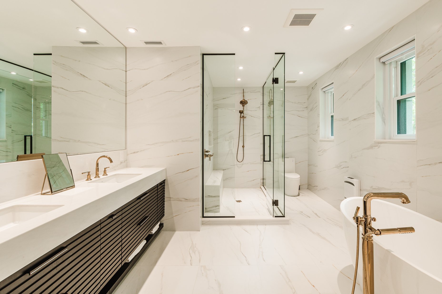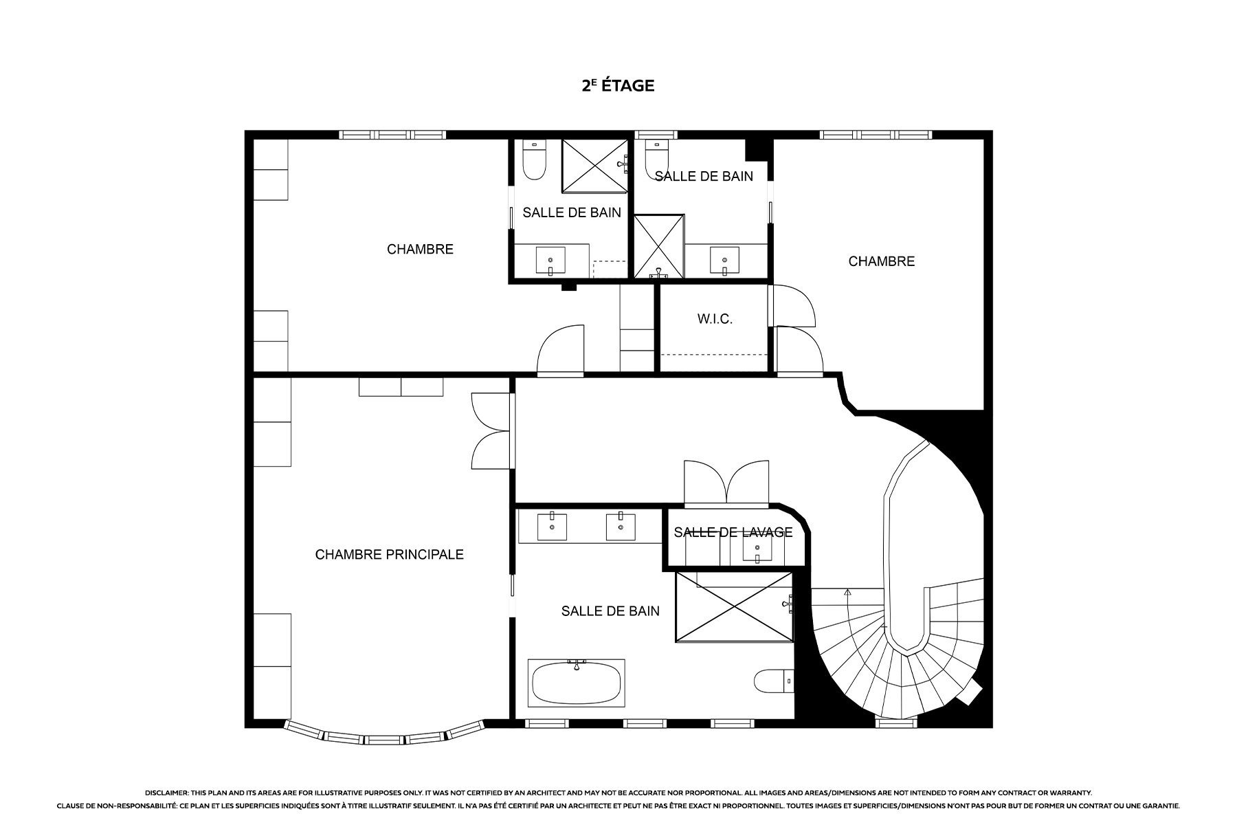 Second Floor: Ascend the gorgeous circular staircase to a generous landing on the second floor. The primary bedroom is thoughtfully designed with built-in closets to maximize storage space. The ensuite bathroom features a two-sink vanity, freestanding tub, and a large glass and tiled shower for a spa-like experience. Two additional spacious bedrooms each have their own ensuites, providing comfort and privacy for residents. A dedicated laundry area on this floor adds convenience to daily living.