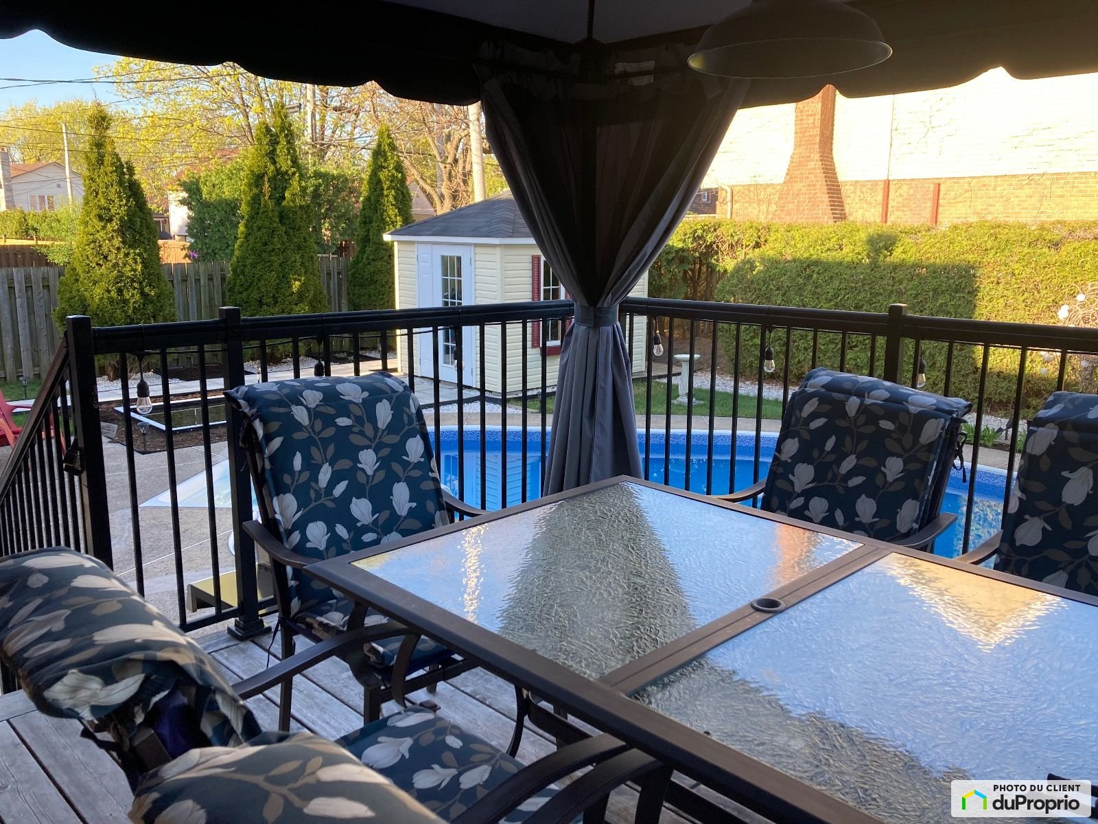 Solar shades, lighting fixtures, shed, patio table and chairs set.