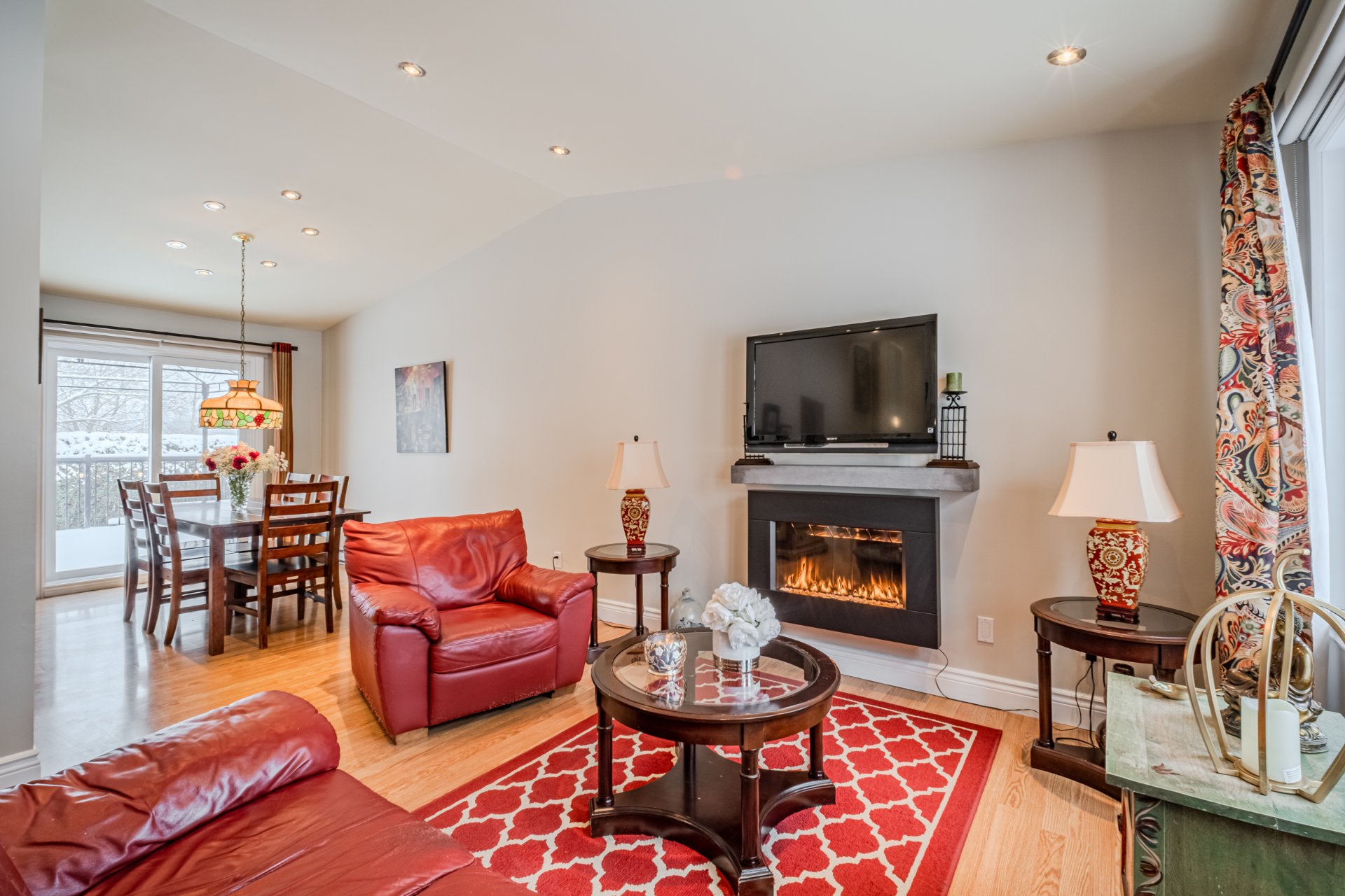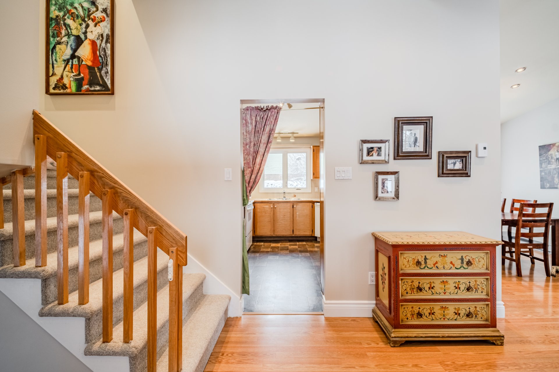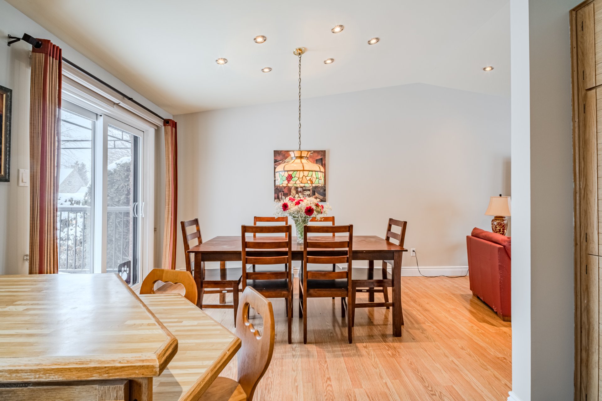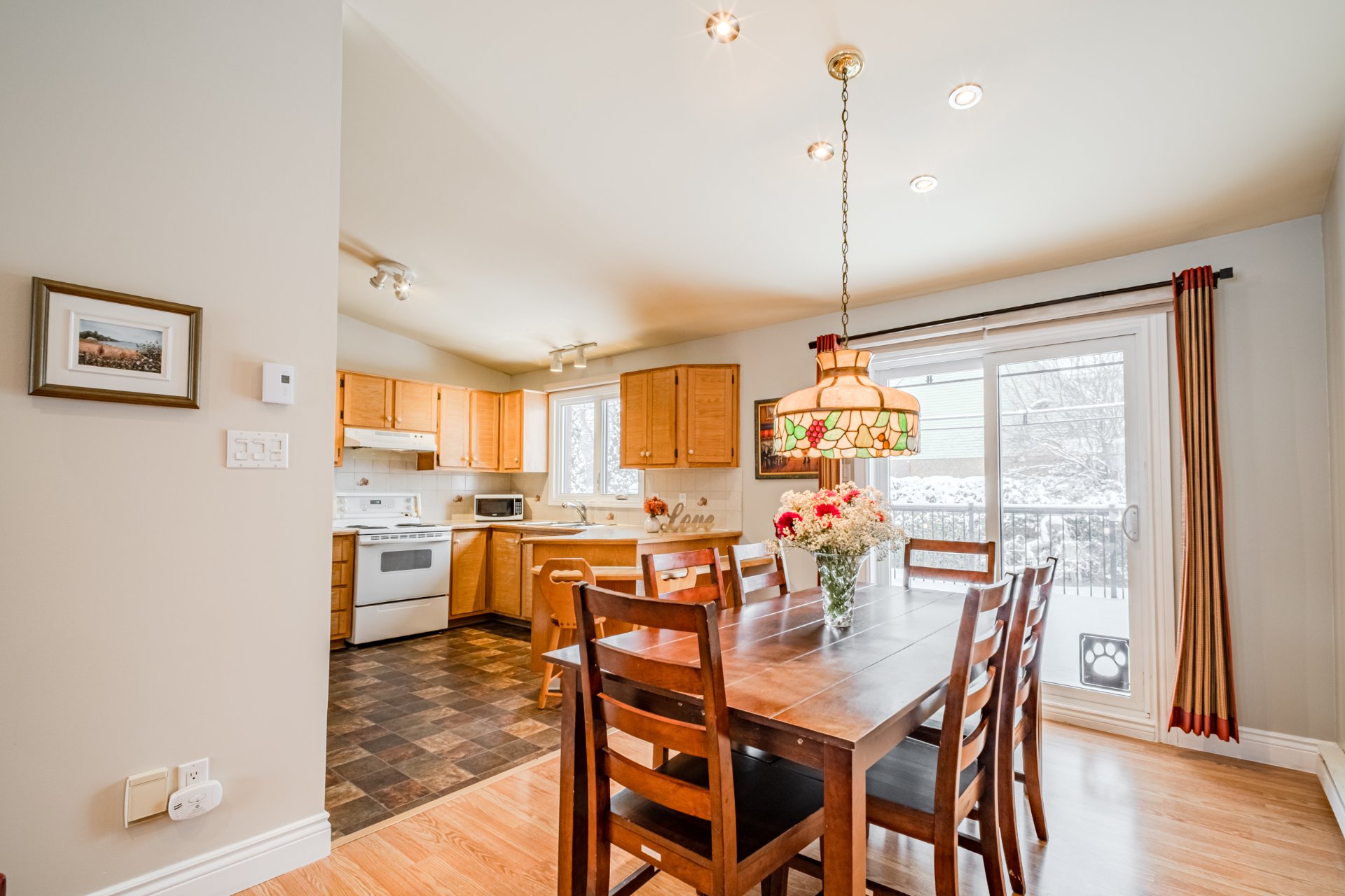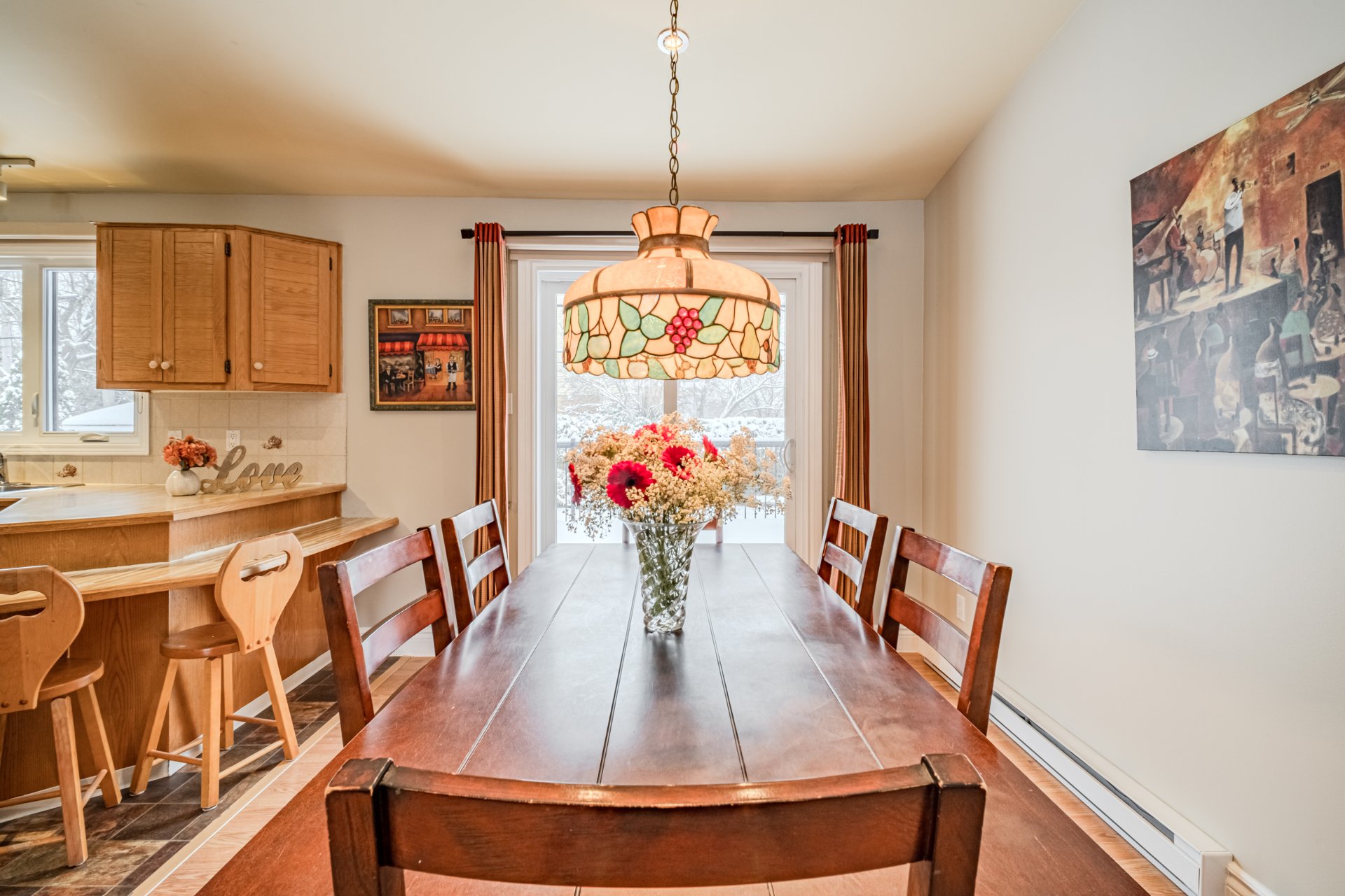 Dining room light fixture, curtains.
