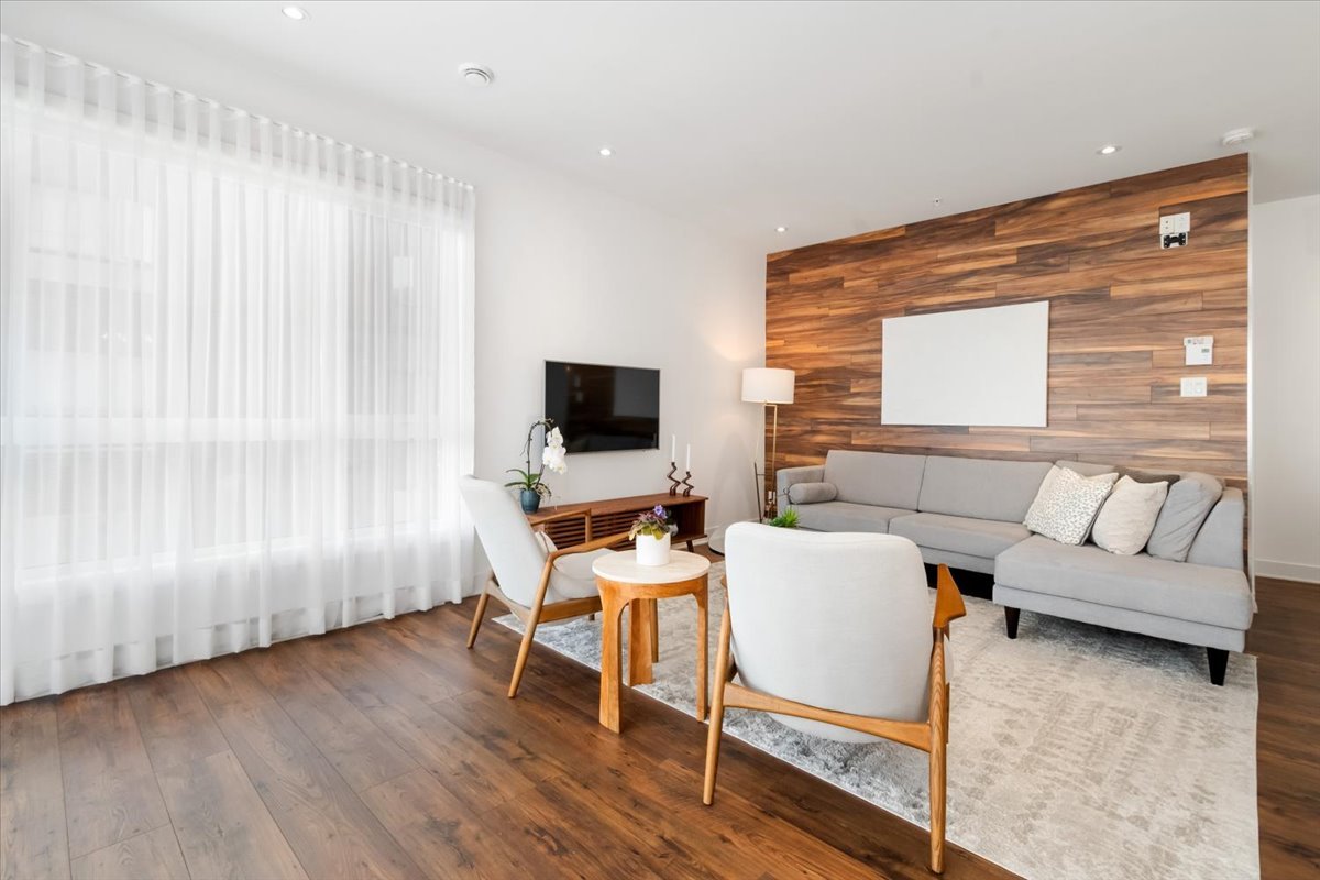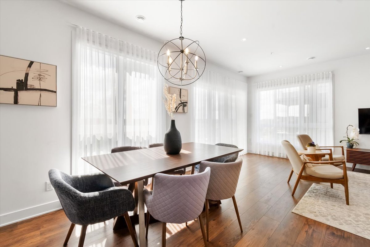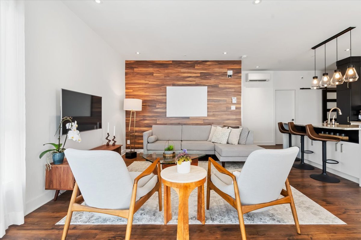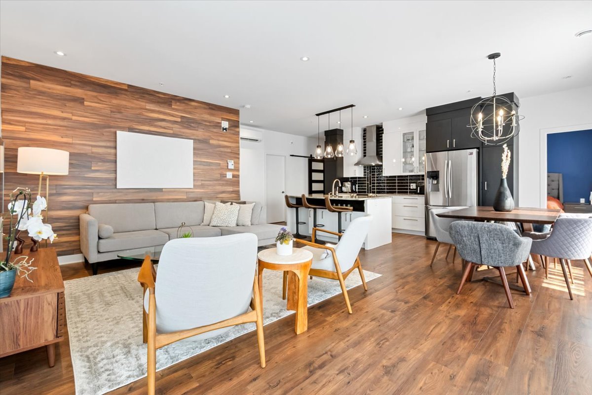 The open-concept living area features large windows on two sides, flooding the space with natural light and creating a warm, inviting atmosphere. The elegant kitchen is beautifully appointed with sleek cabinetry, a central island with seating, and quality finishes, perfect for cooking and entertaining. The living and dining areas flow seamlessly together, highlighted by tasteful décor elements such as a feature wood accent wall and modern light fixtures.