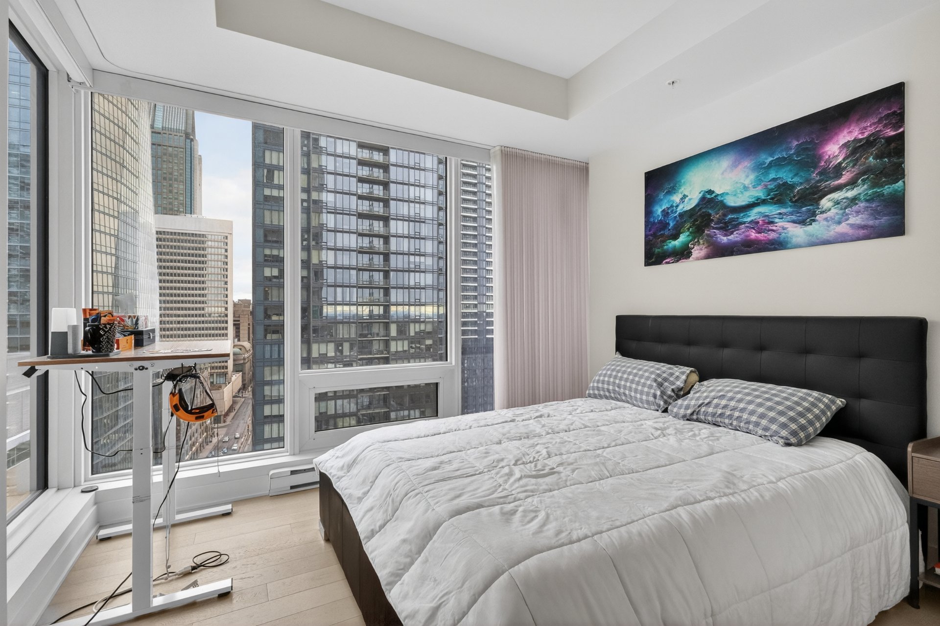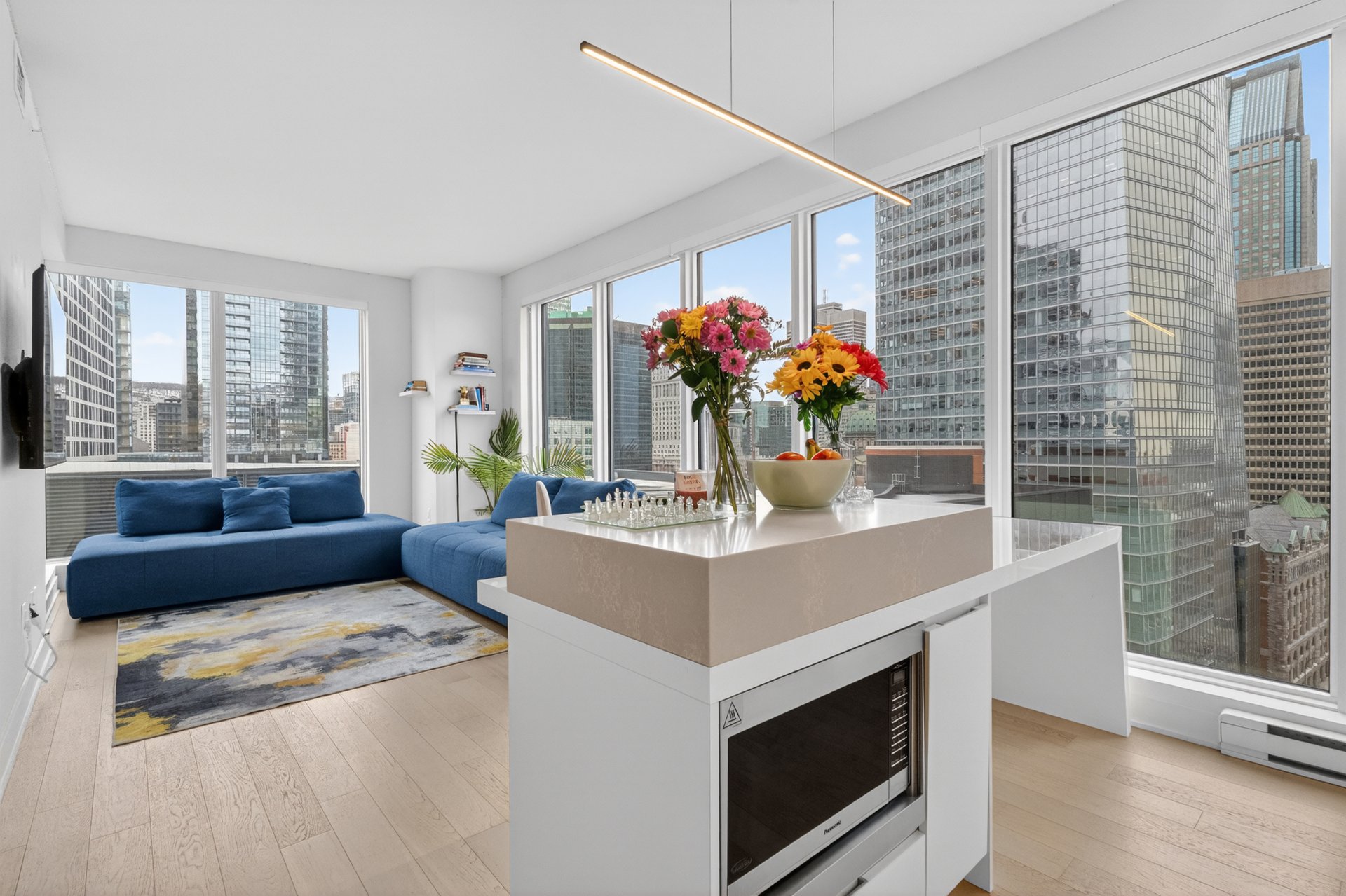 Stunning corner unit in the sought-after Tour des Canadiens offering exceptional city views. This bright 2-bedroom, 2-bathroom condo features floor-to-ceiling windows that flood the space with natural light, an open-concept living area, and a private balcony to enjoy the panoramic skyline. The unit includes a garage parking space and a storage locker. Residents benefit from premium amenities and impressive common areas. Ideally located in the heart of downtown, steps from restaurants, shopping, and transit.