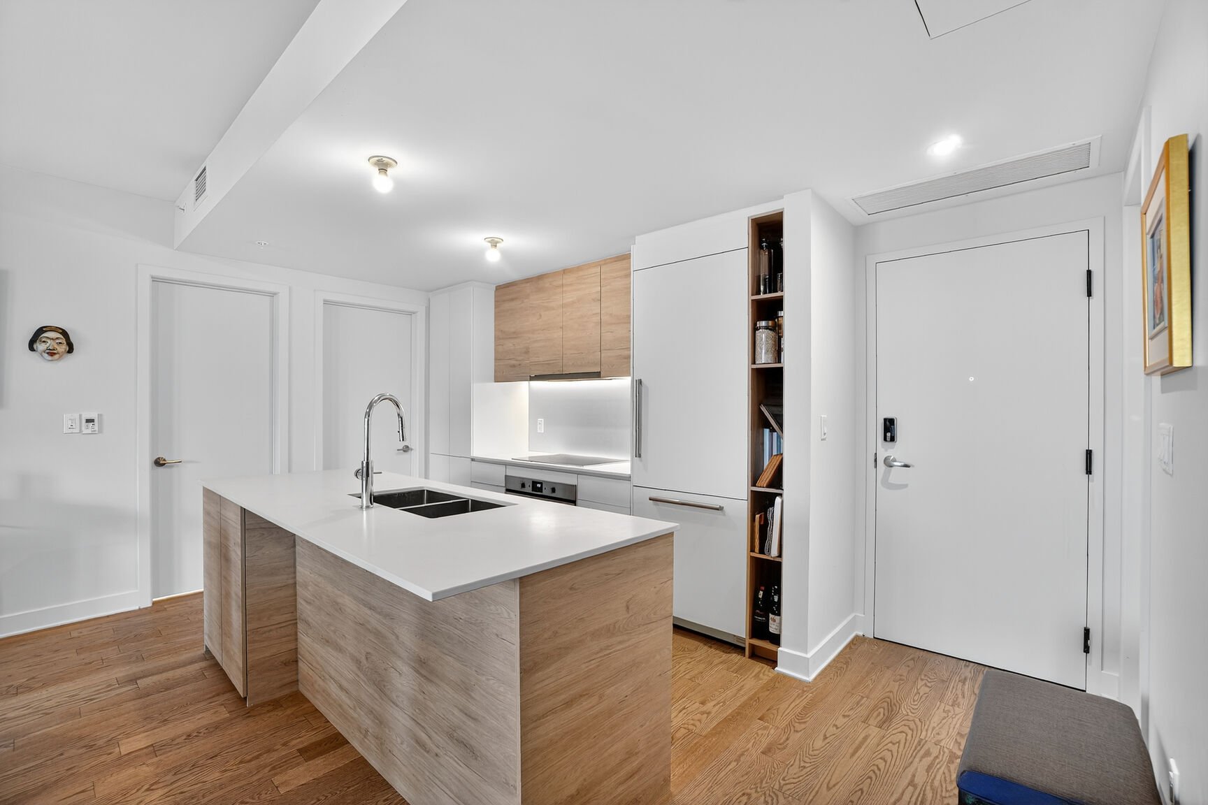 Sleek kitchen with generous quartz work surfaces, built-in refrigerator and dishwasher, separate cooktop, and built-in oven.