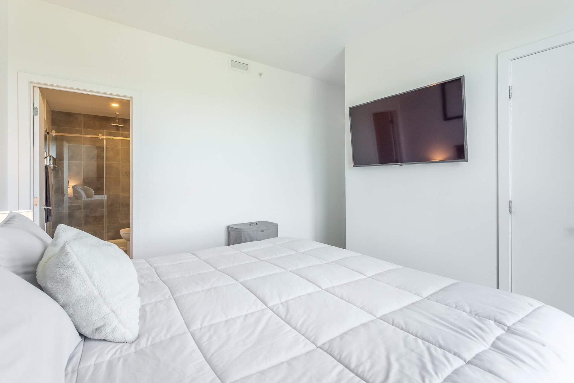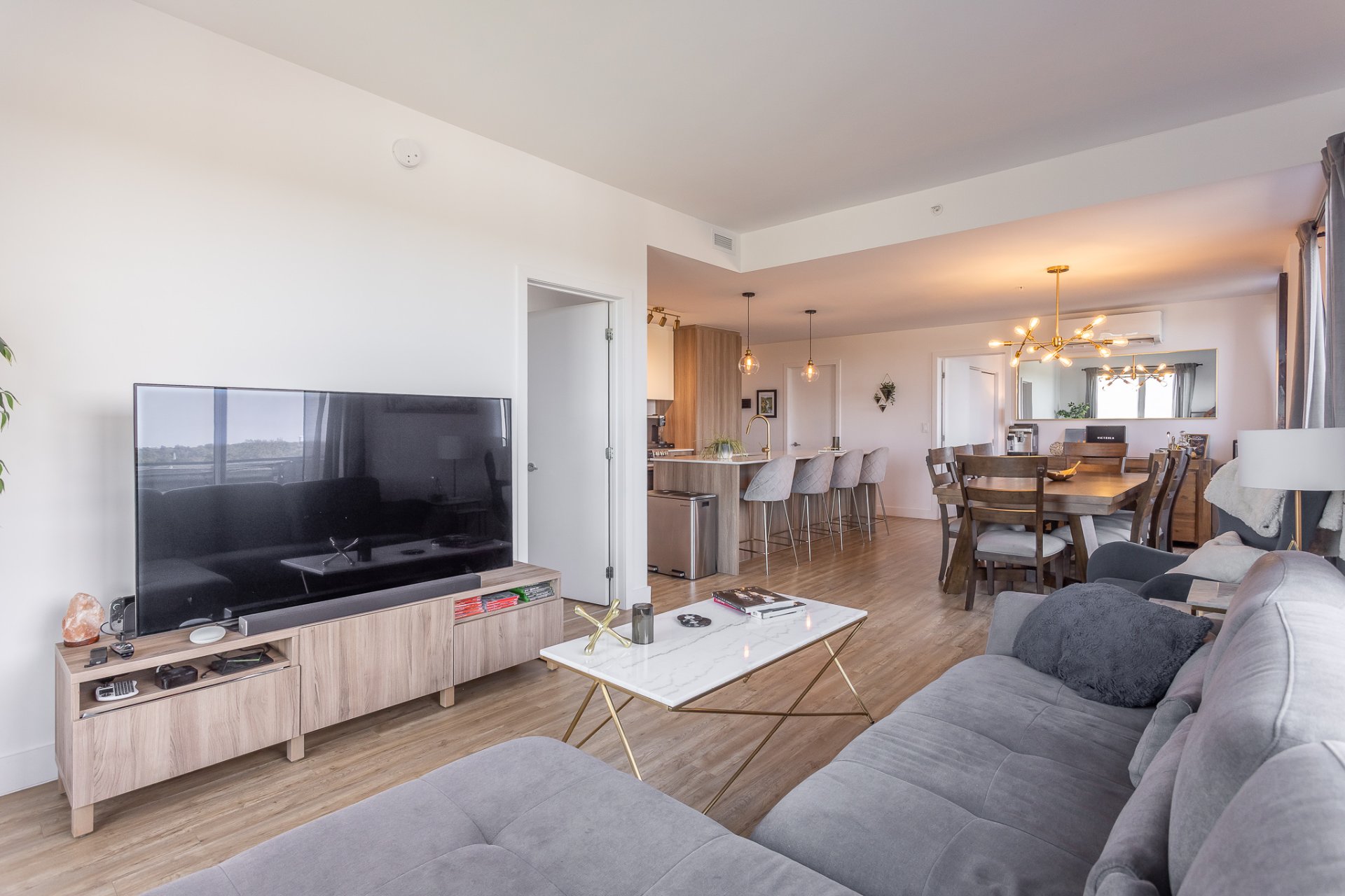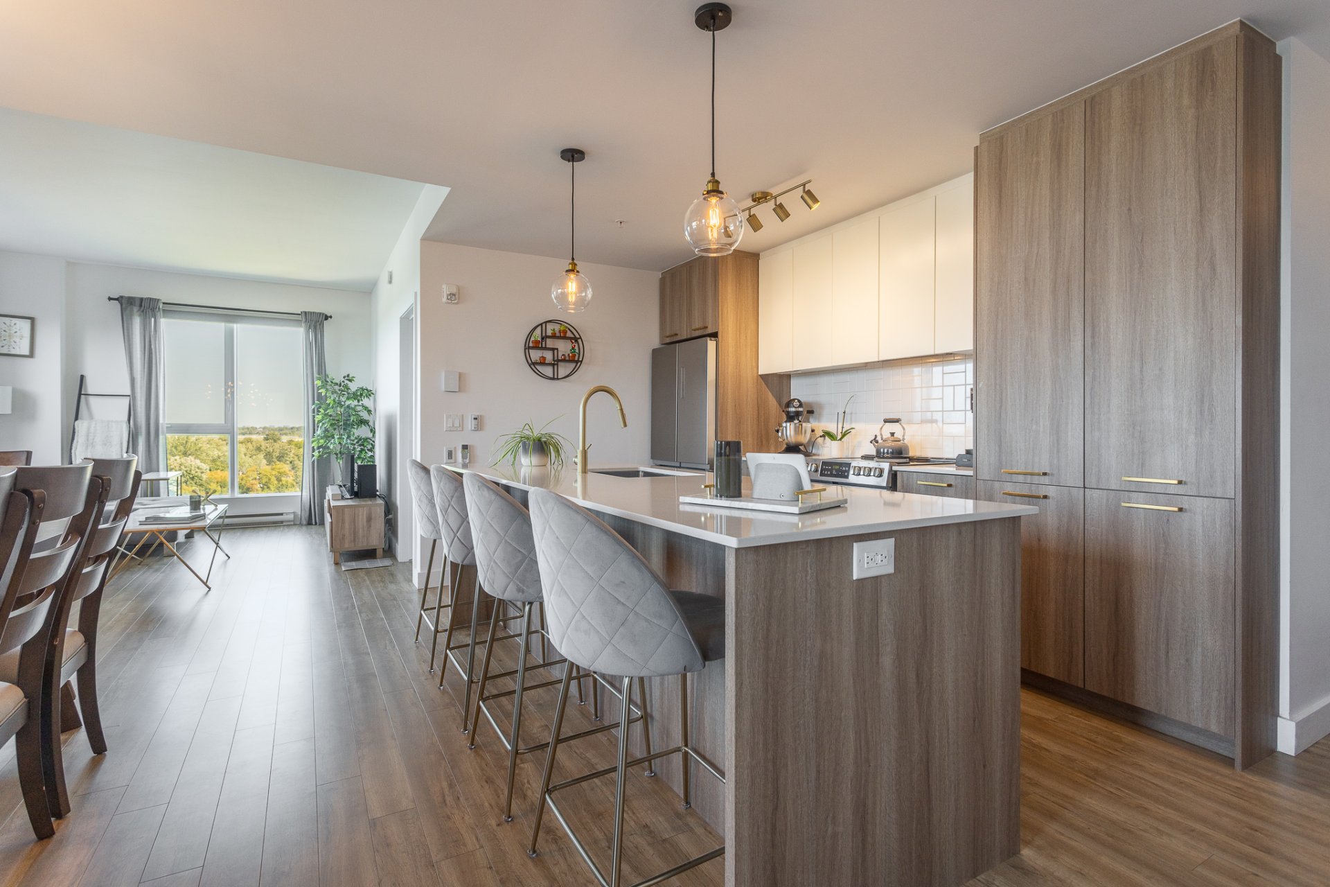 Discover refined contemporary living in this exquisite newly constructed two-bedroom, two-bathroom condo, ideally located in the heart of Pointe-Claire on Montreal’s sought-after West Island. Designed for those who appreciate elegance, comfort, and quality. This condo seamlessly blends modern sophistication with everyday functionality. The open-concept living space is bathed in natural light and showcases clean architecture, premium finishes, and high-end materials throughout. A sleek, modern kitchen anchors the home, featuring stylish cabinetry, quality countertops, and integrated appliances, perfect entertaining and daily living.