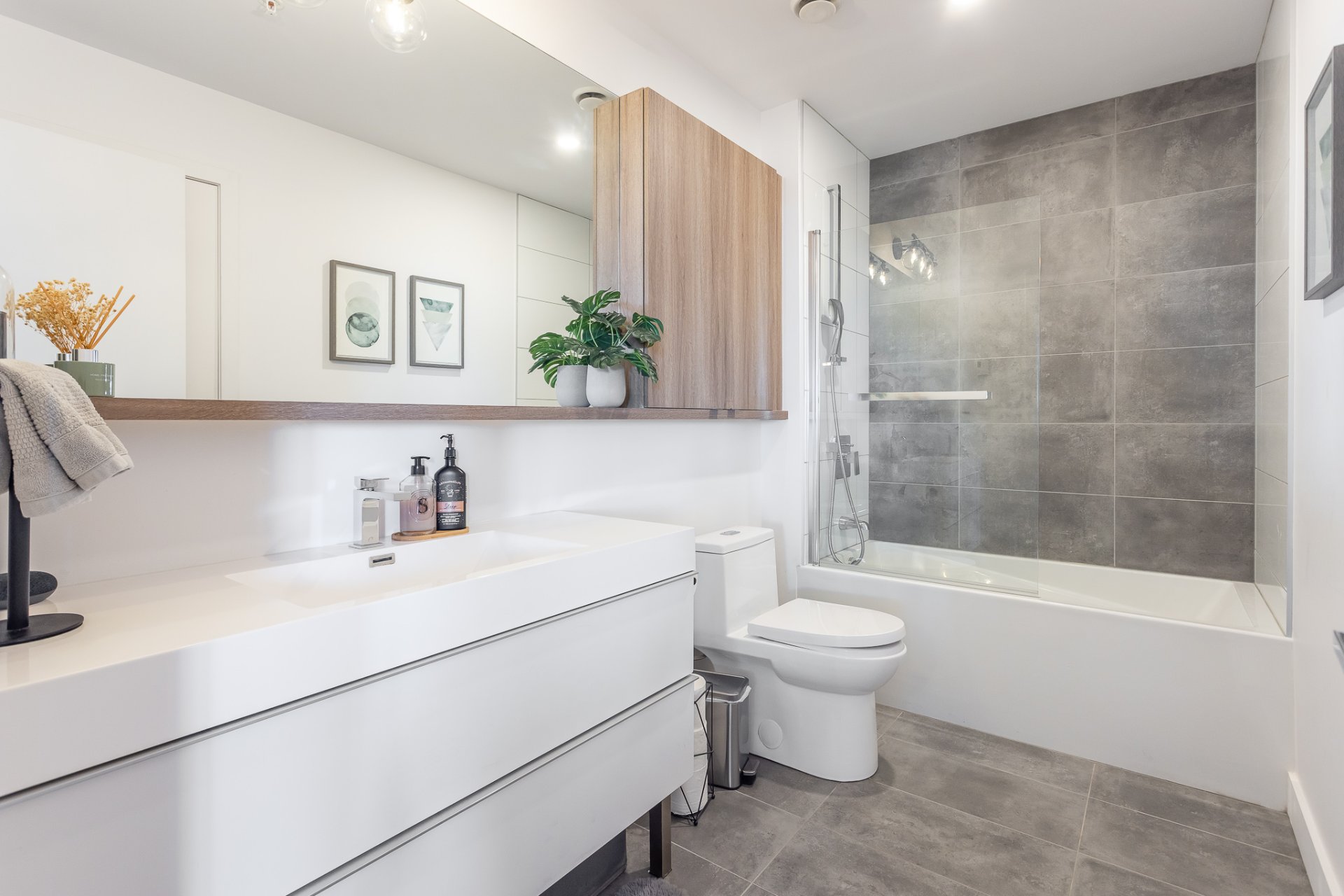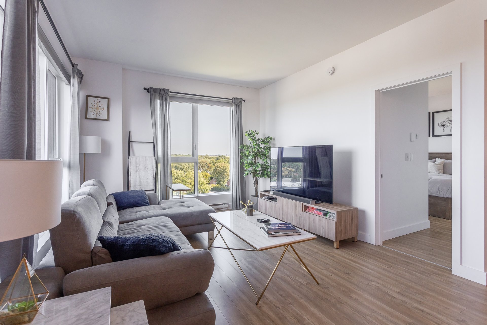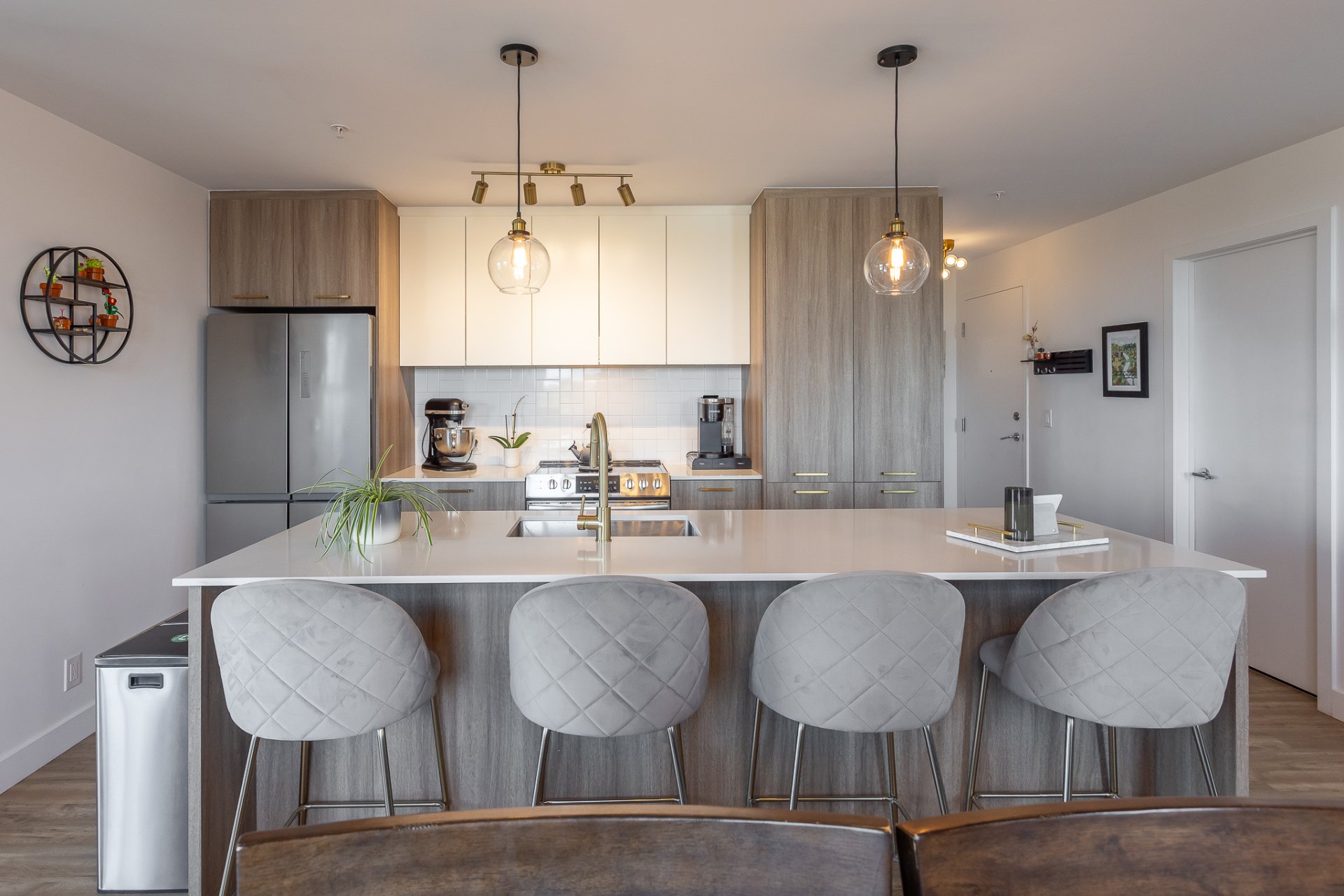 Discover refined contemporary living in this exquisite newly constructed two-bedroom, two-bathroom condo, ideally located in the heart of Pointe-Claire on Montreal’s sought-after West Island. Designed for those who appreciate elegance, comfort, and quality. This condo seamlessly blends modern sophistication with everyday functionality. The open-concept living space is bathed in natural light and showcases clean architecture, premium finishes, and high-end materials throughout. A sleek, modern kitchen anchors the home, featuring stylish cabinetry, quality countertops, and integrated appliances, perfect entertaining and daily living.