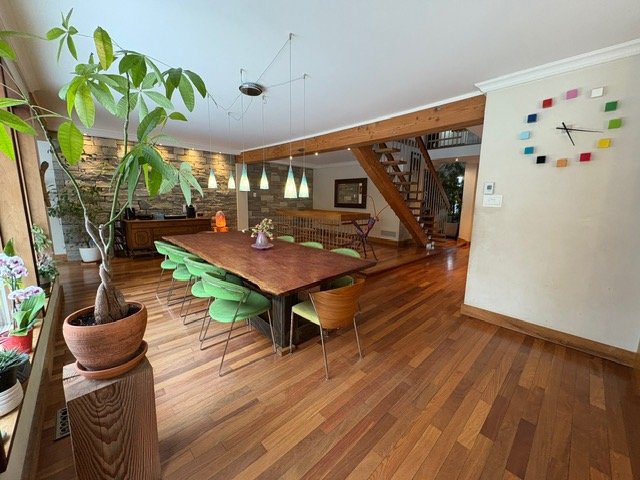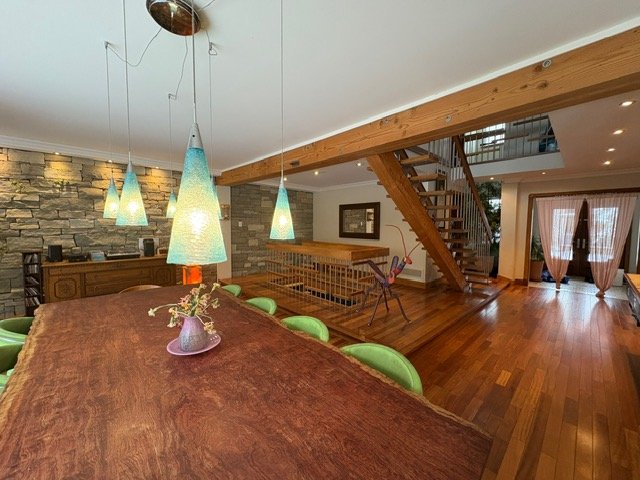 Exceptional eco-designed residence in Ste-Rose, fully furnished. Geothermal heating, central air conditioning, air exchange system, and EV charging station. Wood floors throughout, living room with fireplace, dining area, and high-end kitchen with limestone countertops and gas stove. Main-floor private office. Upstairs: 6 unique bedrooms with stained-glass doors, primary suite with walk-in, private terrace, and green roof. Landscaped yard with pool, outdoor BBQ kitchen, water views overlooking the beach, and kayaks. Central vacuum included. Ample parking. Maintenance included.