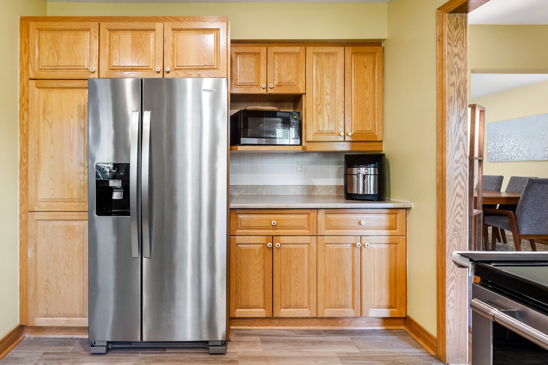 Fridge in the main kitchen, stove in the main kitchen, light fixtures in dining room/TV room, curtain in living room, dining room and TV room