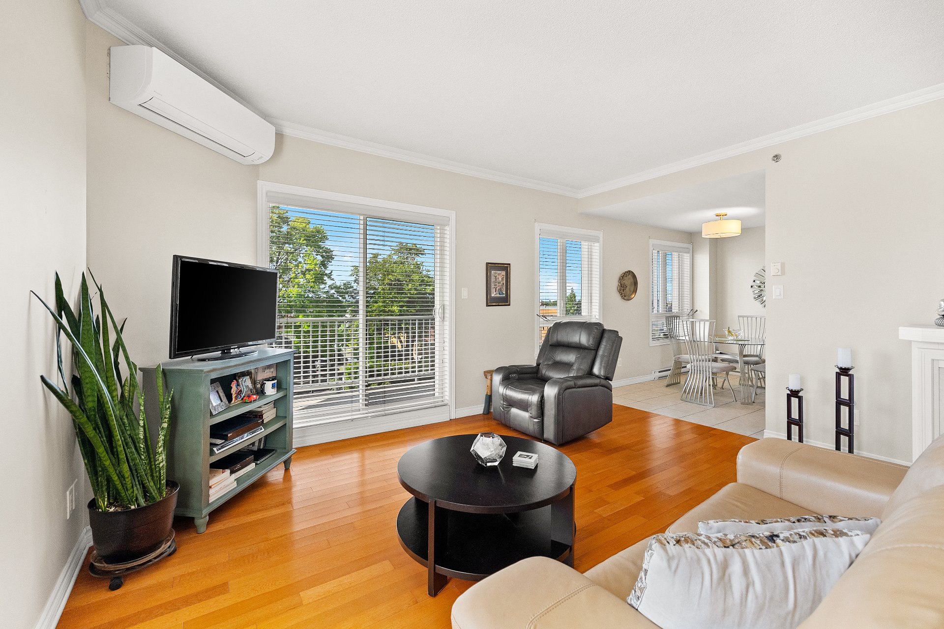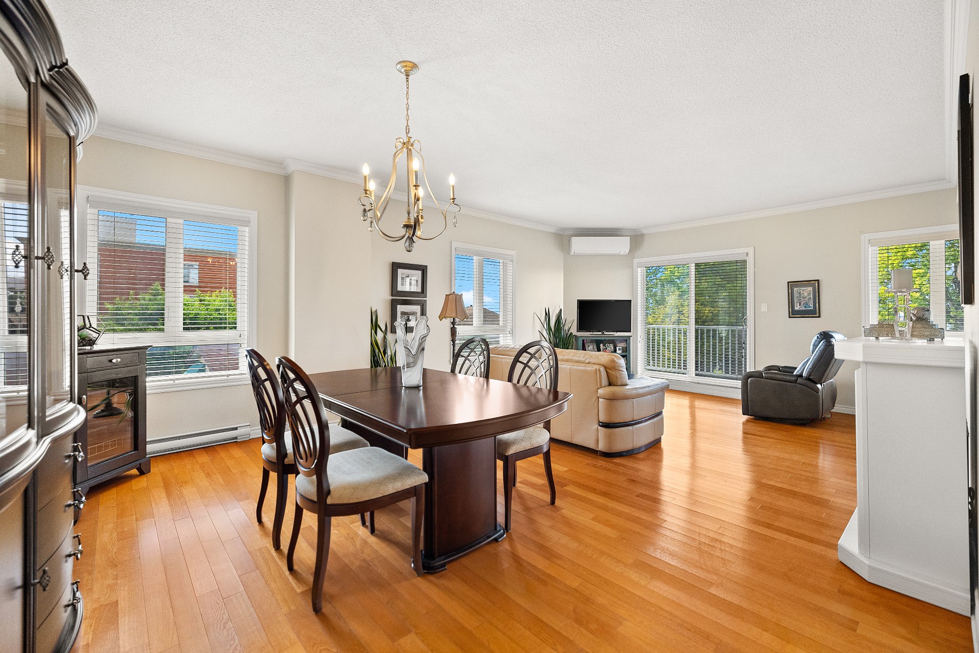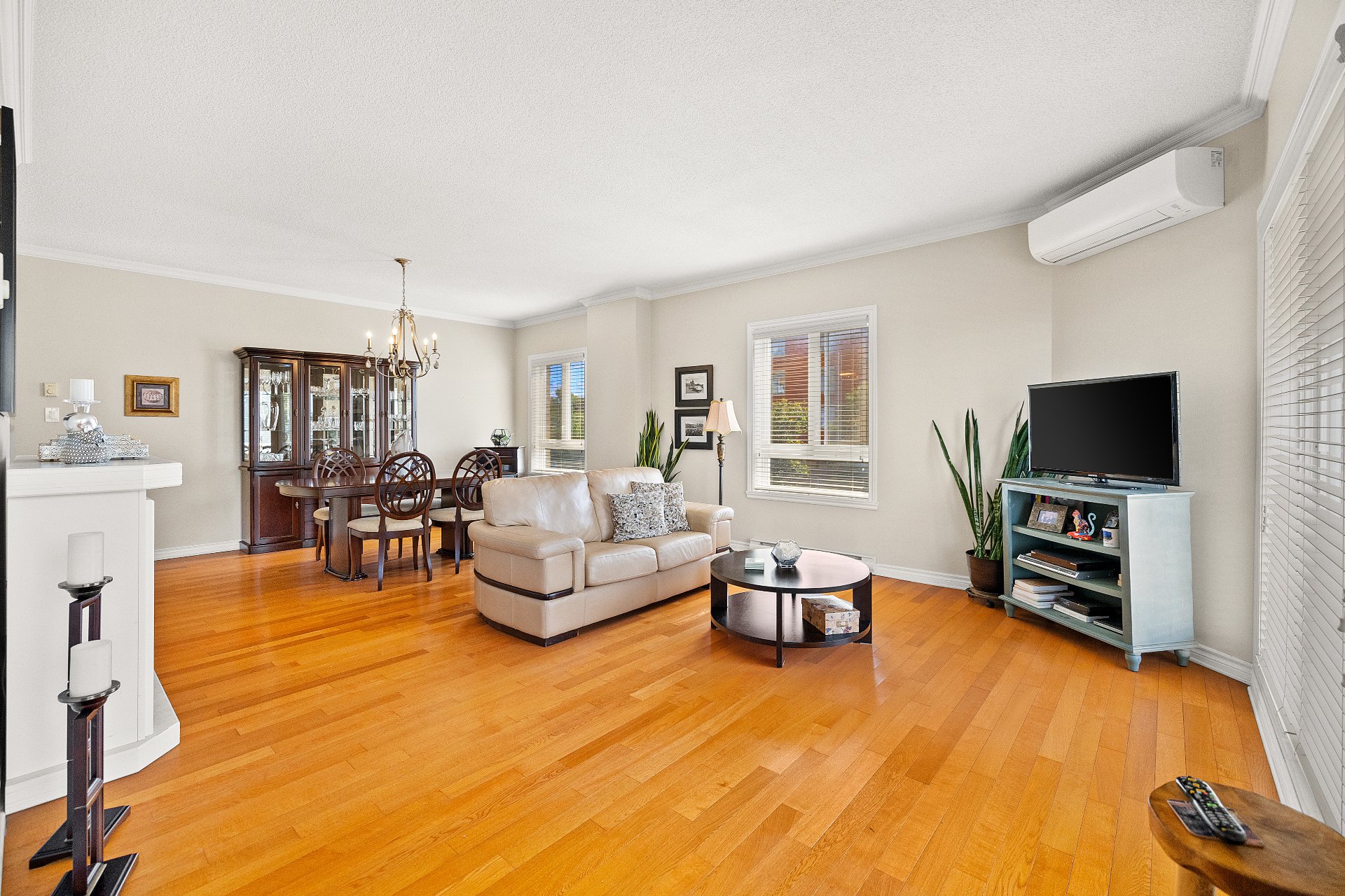 A large sun-filled living room, seamlessly connected to the dining area.