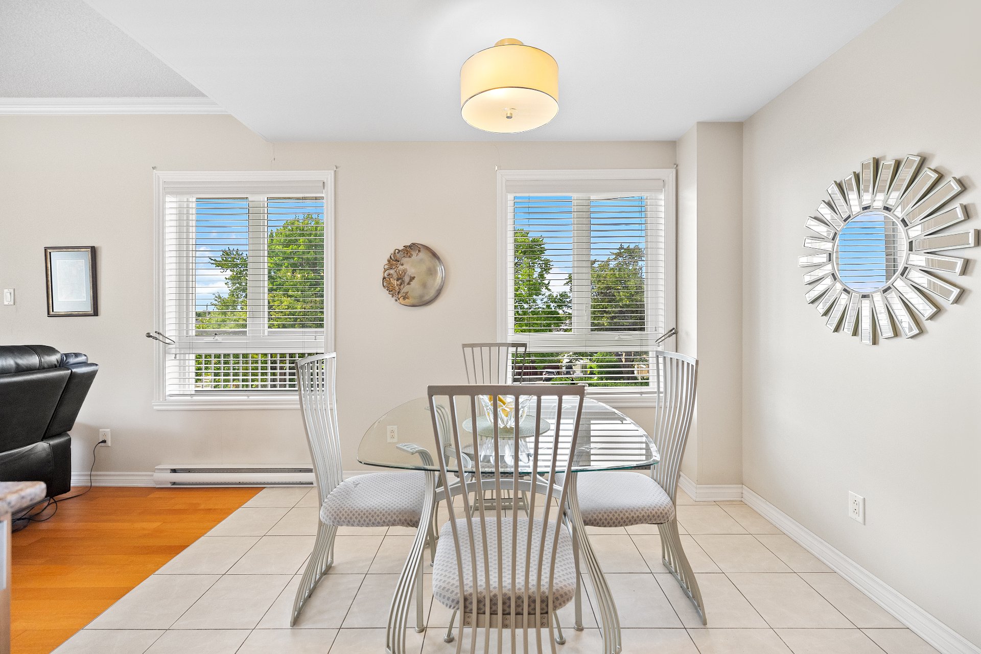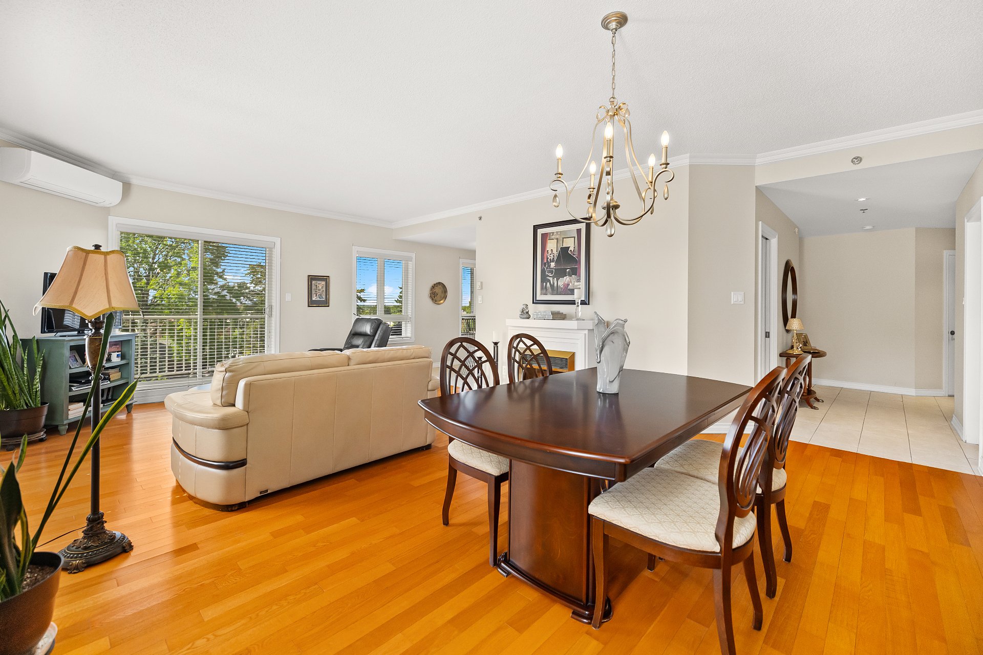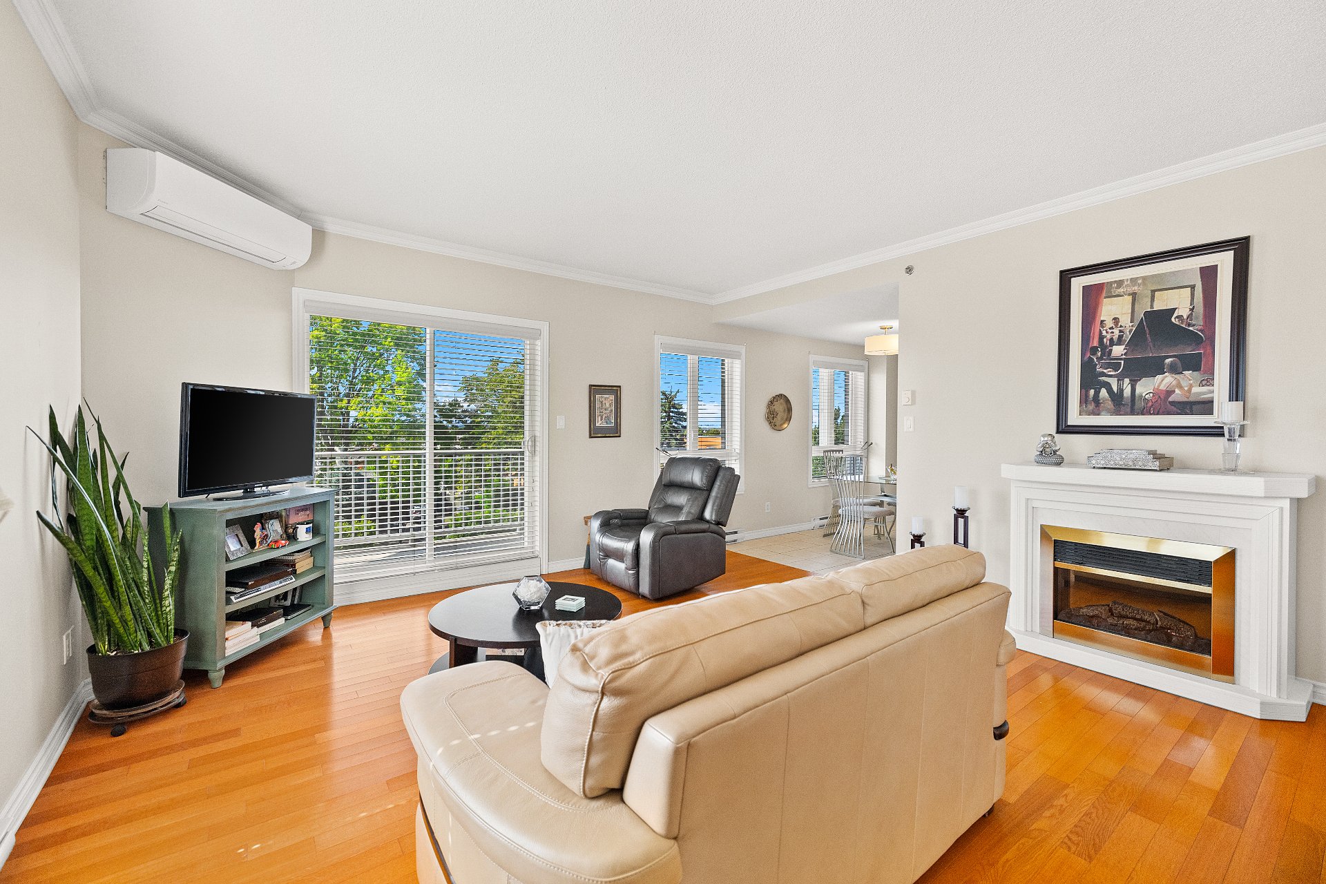 A large sun-filled living room, seamlessly connected to the dining area.
