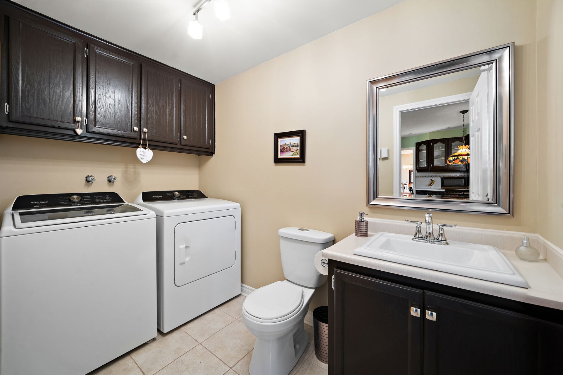 Washer and dryer, refrigerator, microwave, and kitchen light fixture.