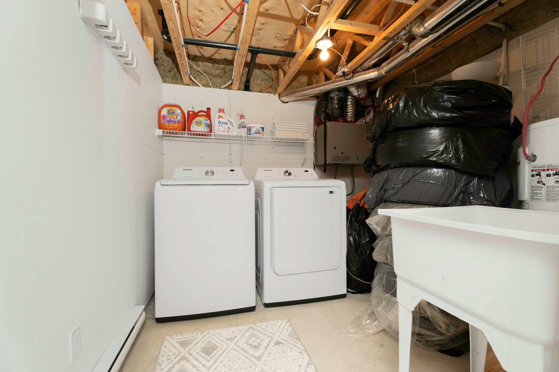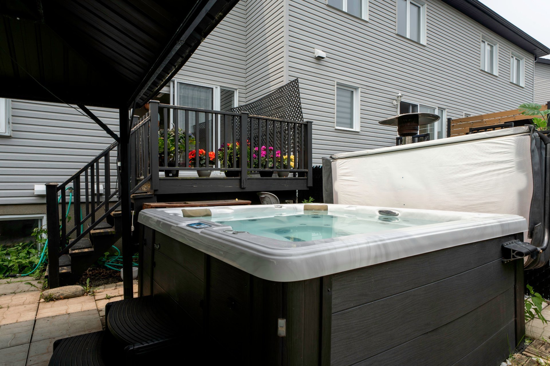 Hot tub, Fridge in the kitchen, Fridge in the basement, Stove, Dishwasher, Washer (in laundry), Dryer (in laundry), Blinds, Gazebo, Playground, Garden shed.