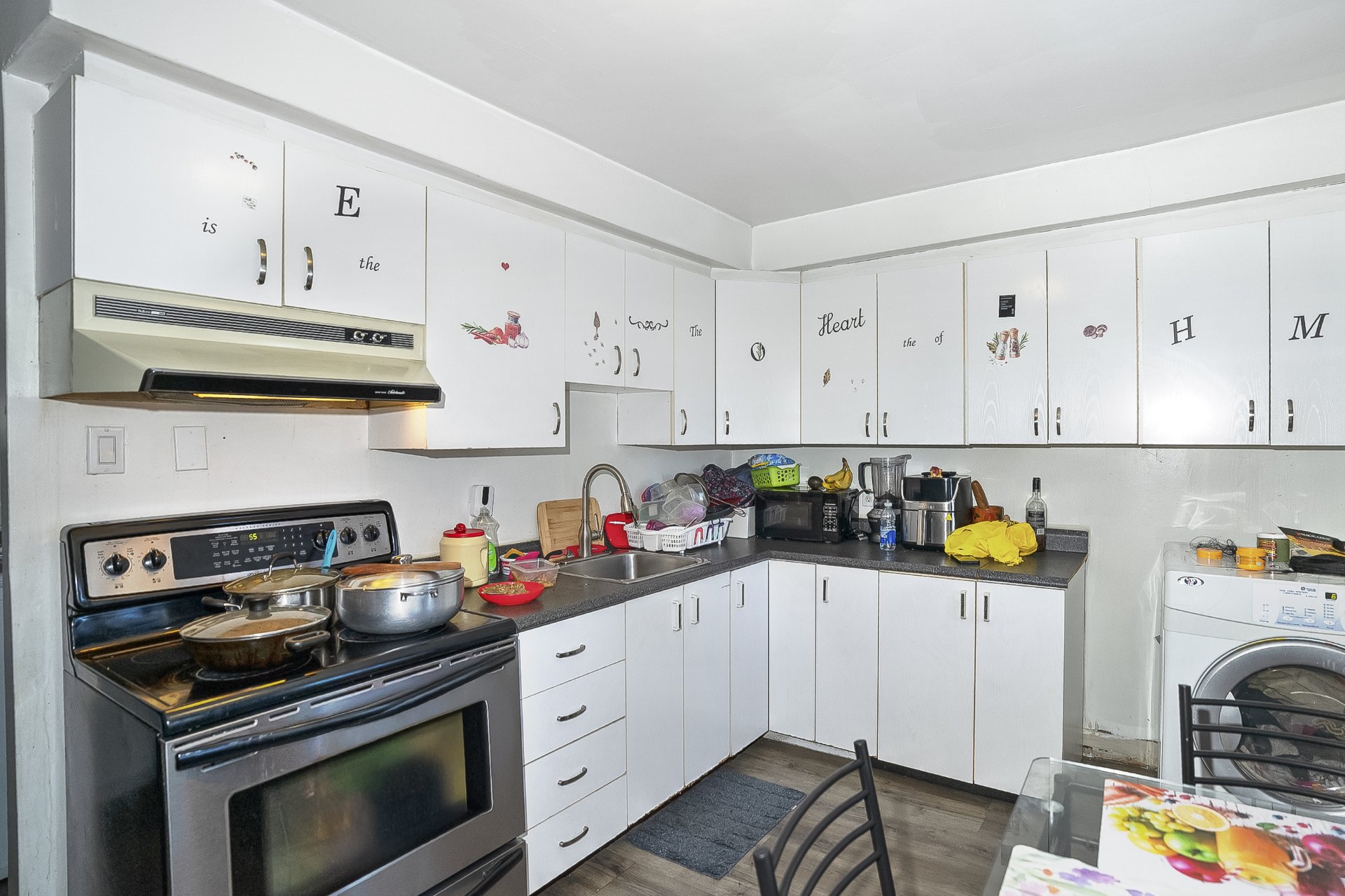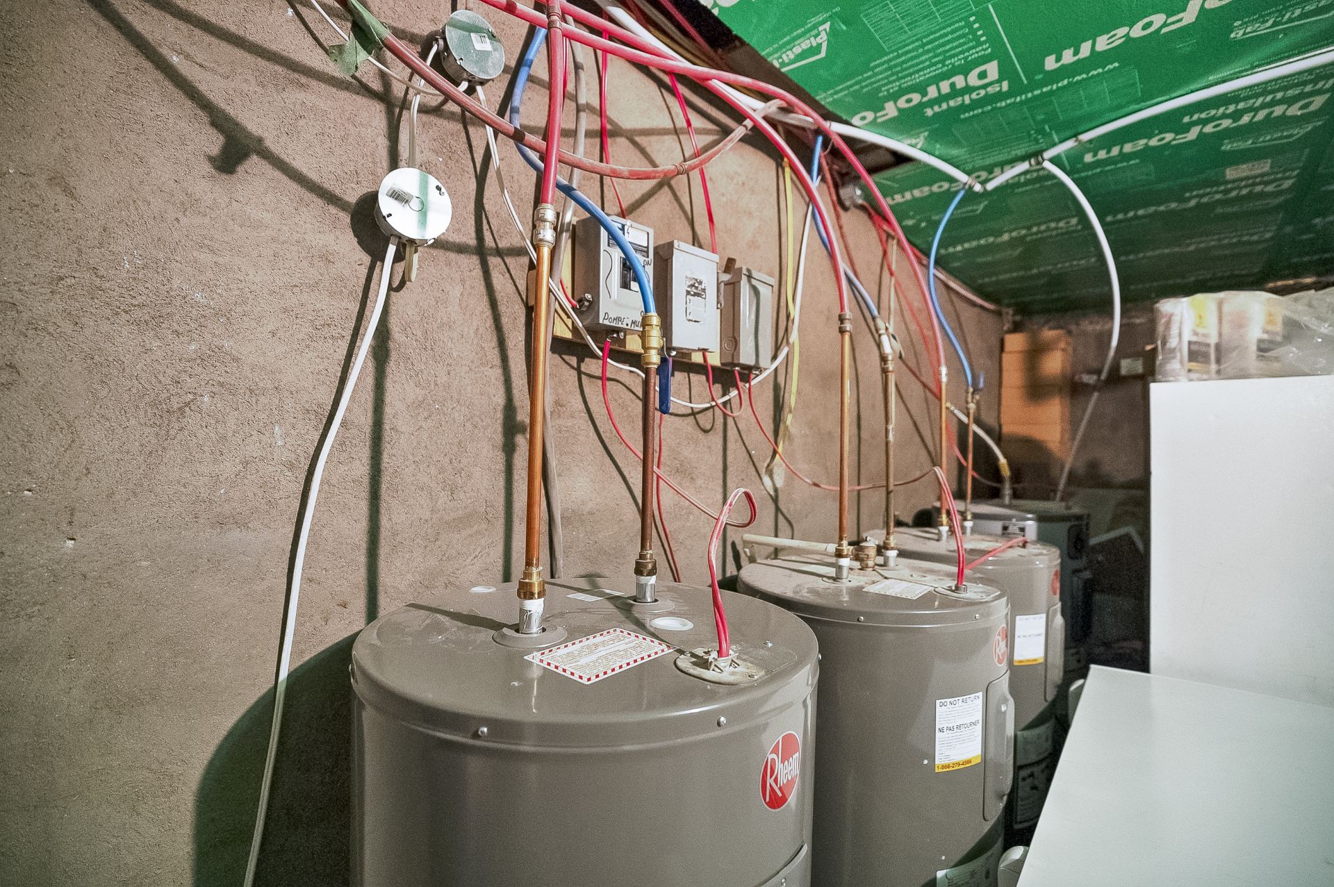 4 water heaters, light fixtures, stove, refrigerator, microwave oven, washer and dryer, table, chairs and dresser in unit #11381.